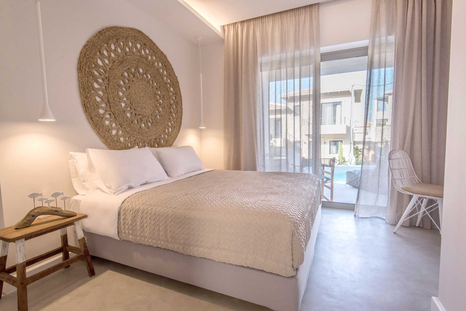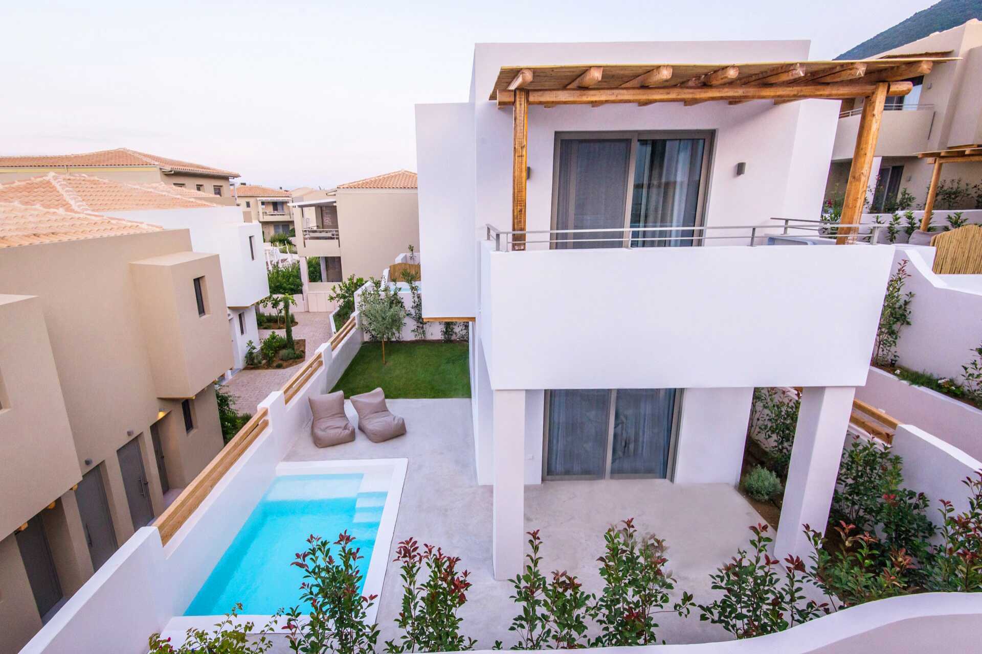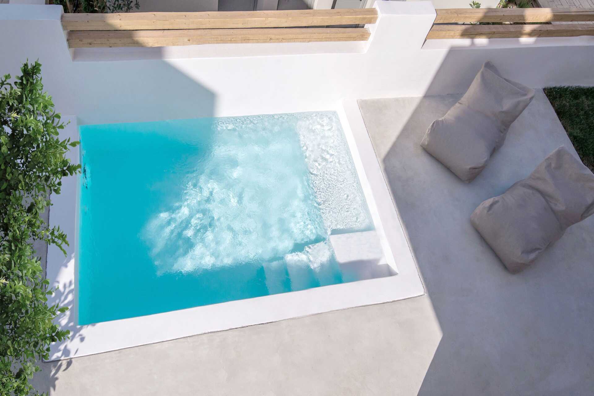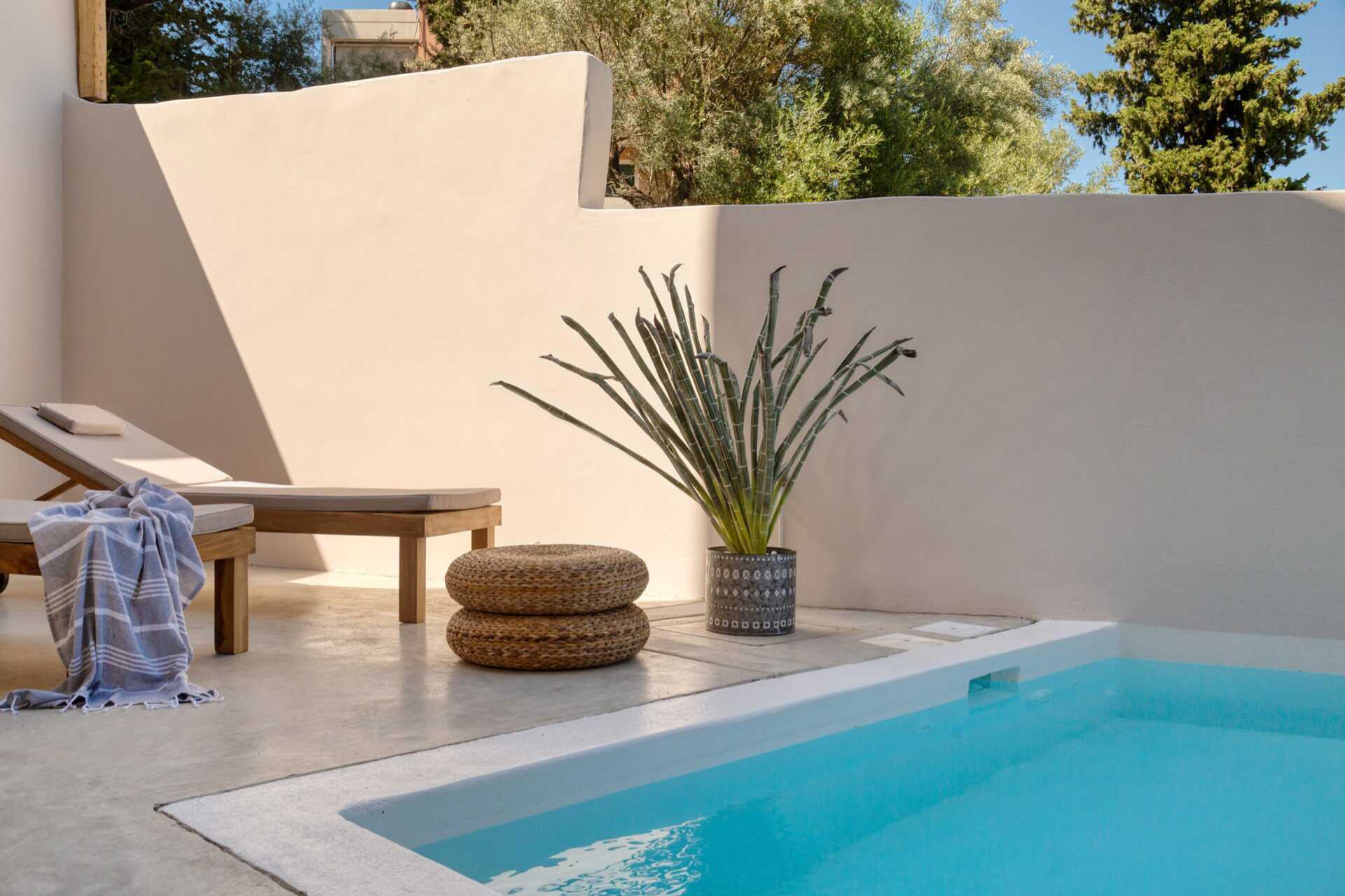 Kahden hengen huone, jossa on pohjaterassi ja oma uima-allas. Terassilla on tuolit, pöydät ja portaat alas altaaseen. Parivuode tai kaksi erillistä sänkyä. Maksuton wifi, ilmastointi ja tallelokero. Minibaari. Vedenkeitin, kahvia ja teetä. Tv kansainvälisillä kanavilla. Hiustenkuivain. Kylpyhuoneessa suihku ja wc. Siivous 7 krt/viikko.
