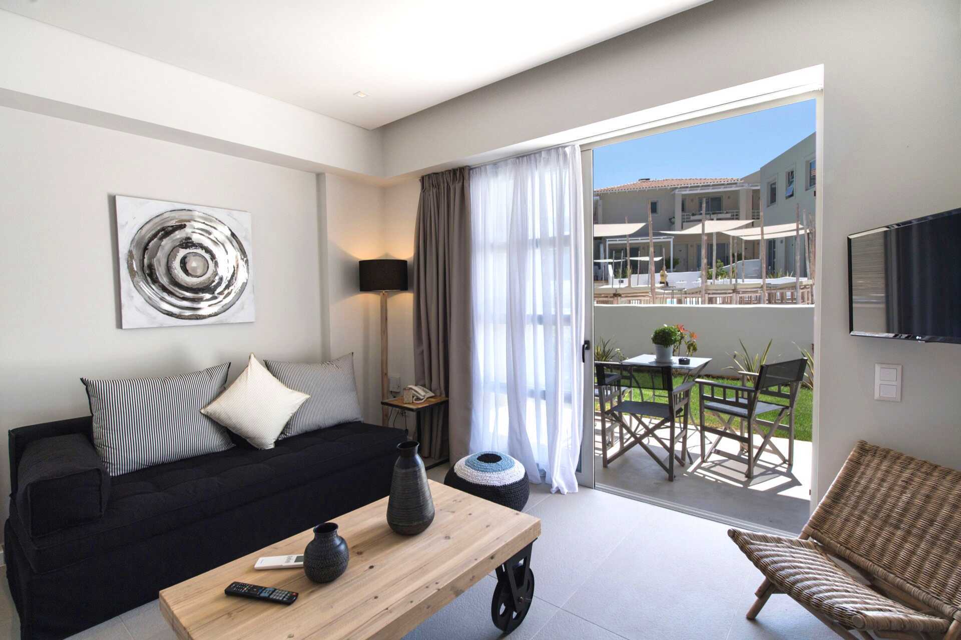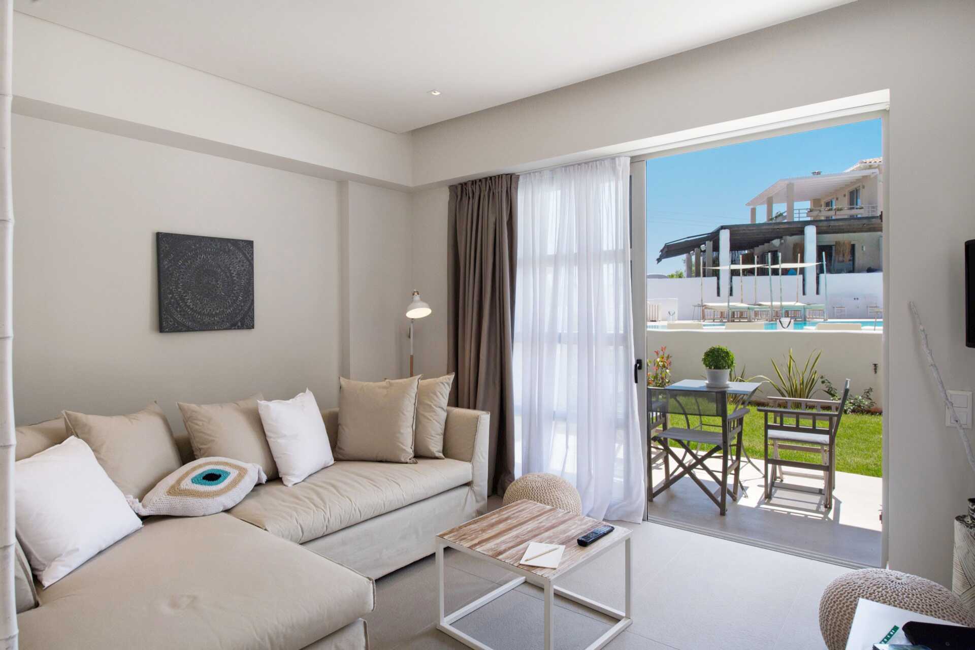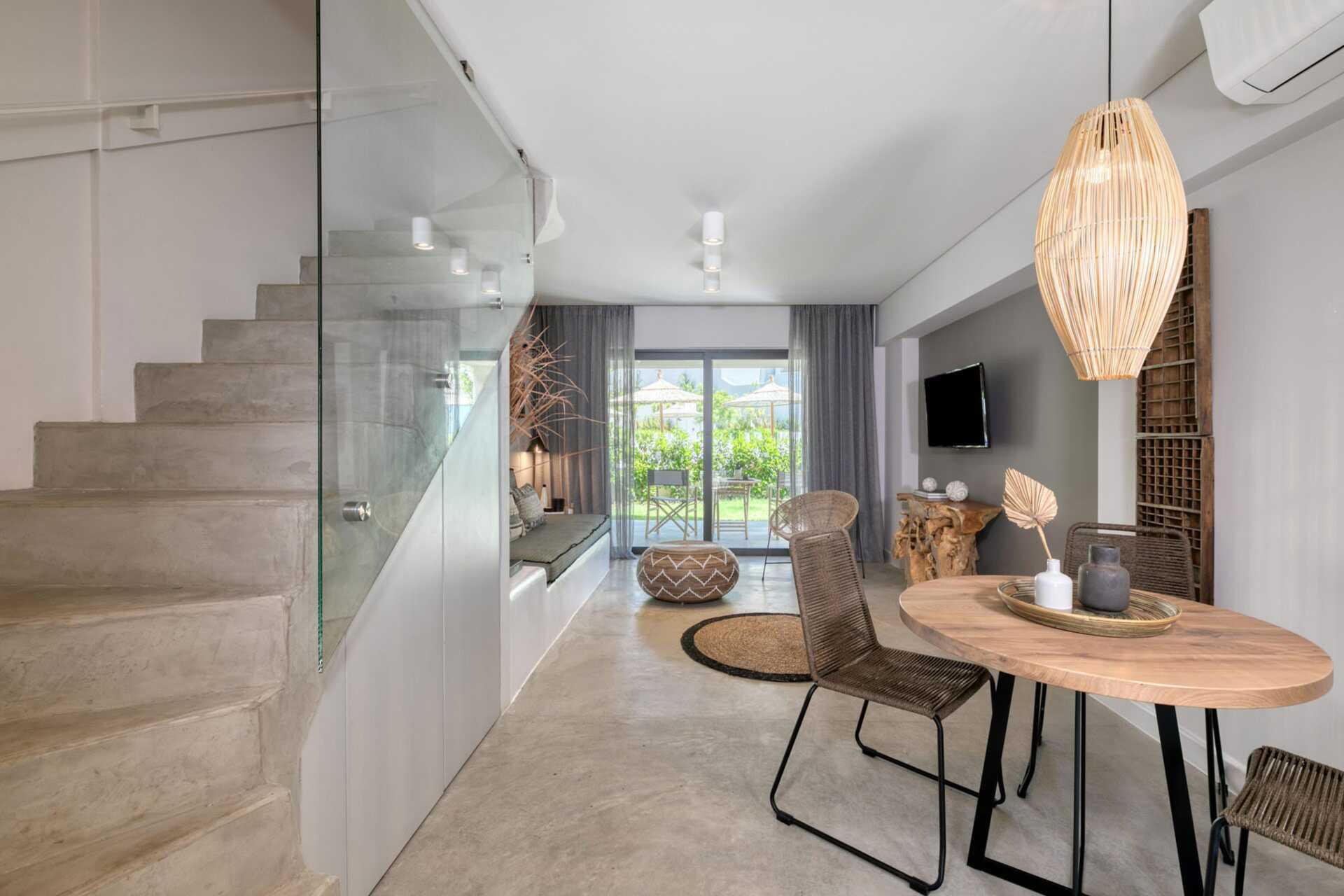 Sviitti pohjaterassilla ja näköalalla uima-altaalle. Sisääntulokerroksessa on olohuone ruokailutilalla (joskus baaritiskillä) ja sohva, wc ja terassi. Yläkerrassa on kaksi makuuhuonetta, joista toisessa on parveke. Toisessa makuuhuoneessa parivuode ja toisessa makuuhuoneessa kaksi erillistä sänkyä sekä kylpyhuone suihkulla ja wc:llä. Maksuton wifi, ilmastointi ja tallelokero. Minibaari. Vedenkeitin, kahvia ja teetä. Tv kansainvälisillä kanavilla. Hiustenkuivain. Siivous 7 krt/viikko.