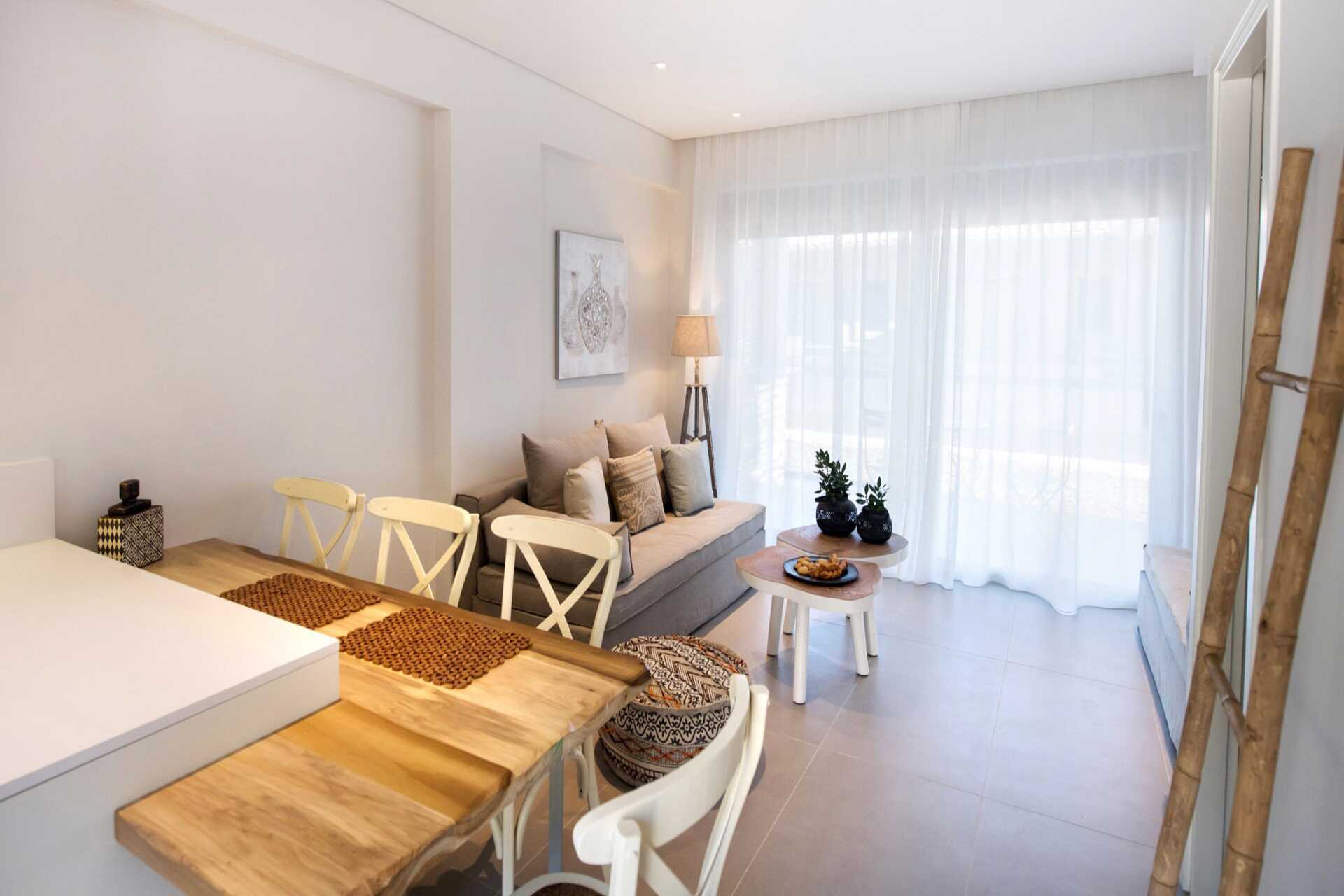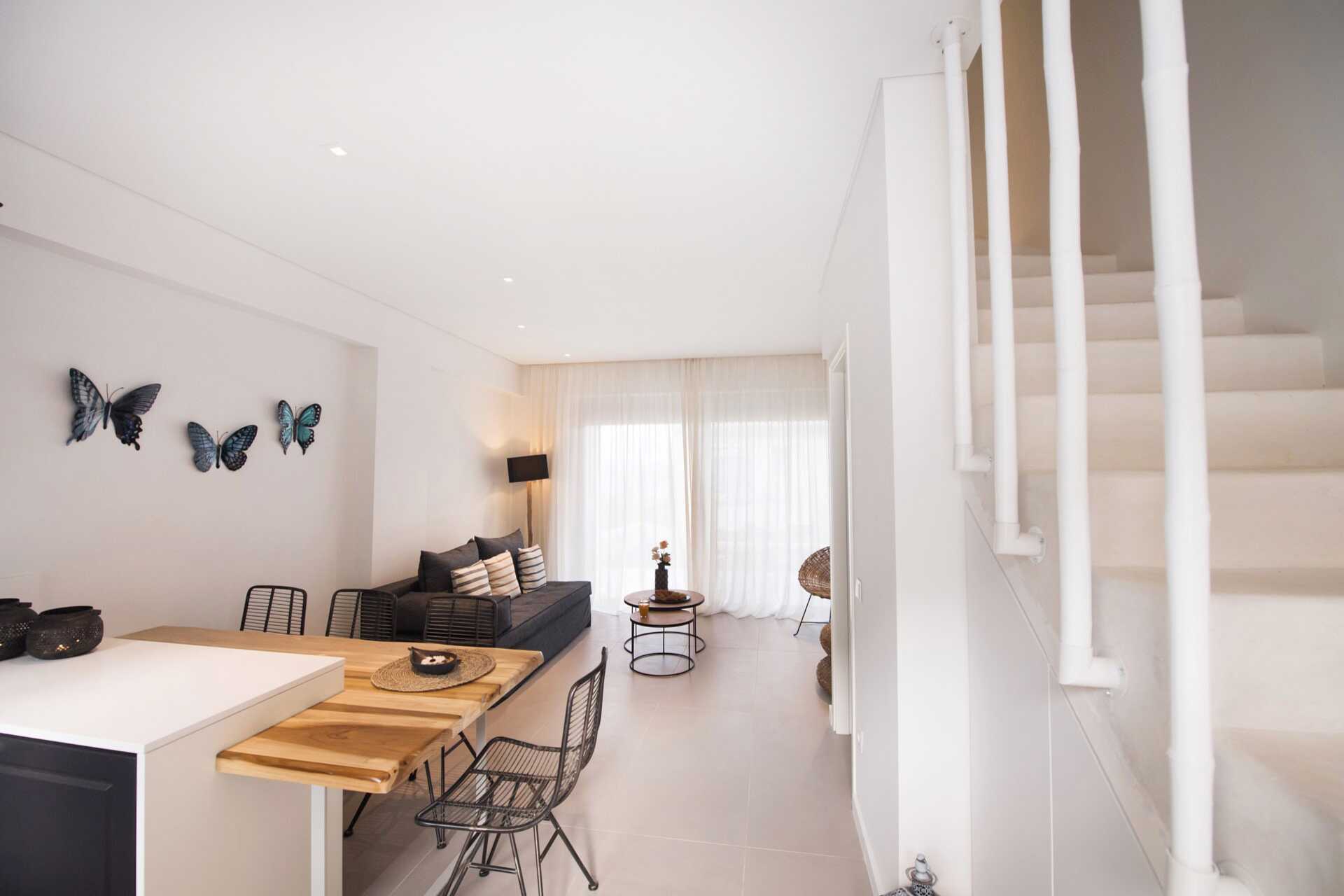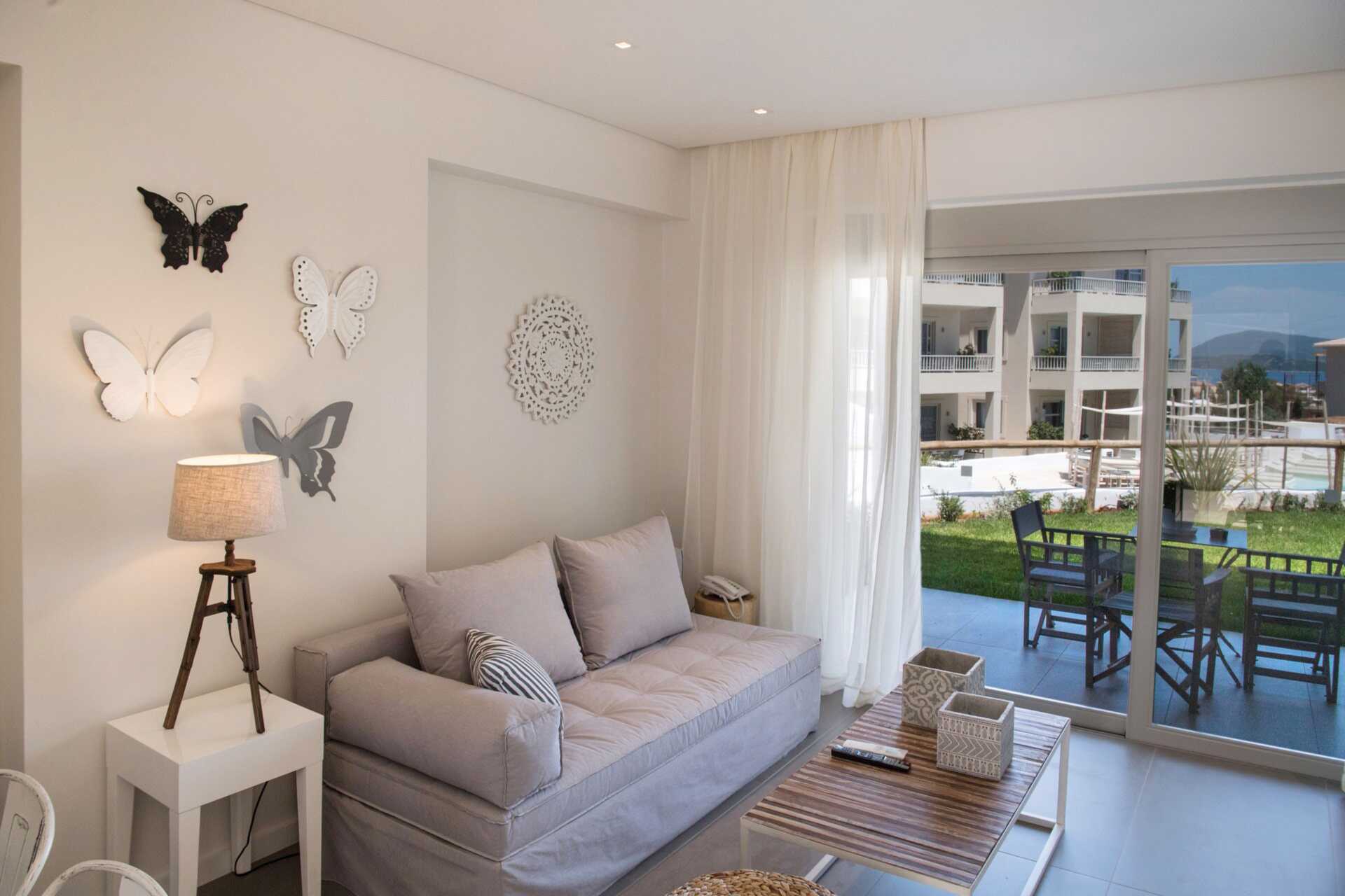Sviitti pohjaterassilla ja näköalalla uima-altaalle. Sisääntulokerroksessa on olohuone ruokailutilalla (joskus baaritiskillä) ja sohva, wc ja terassi. Yläkerrassa on kaksi makuuhuonetta, joista toisessa on parveke. Toisessa makuuhuoneessa parivuode ja toisessa makuuhuoneessa kaksi erillistä sänkyä sekä kylpyhuone suihkulla ja wc:llä. Maksuton wifi, ilmastointi ja tallelokero. Minibaari. Vedenkeitin, kahvia ja teetä. Tv kansainvälisillä kanavilla. Hiustenkuivain. Siivous 7 krt/viikko.