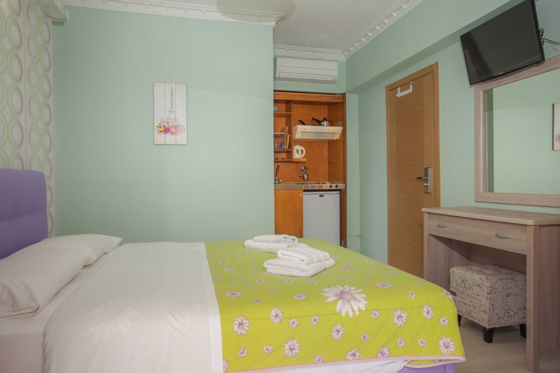 Remontoitu yksiö parvekkeella, osasta näkymät uima-altaalle. Kesään 2025 mennessä osa huoneistoista on kokonaan remontoitu ja osa osittain remontoitu, joissa kylpyhuonetta ei ole remontoitu. Yhdistetty olohuone/minikeittiö, jossa keittolevyt, jääkaappi ja yksinkertainen keittiövarustus. Maksuton wifi. Ilmastointi ja tallelokero lisämaksusta. Tv. Kylpyhuoneessa suihku ja wc. Siivous 5 krt/viikko.