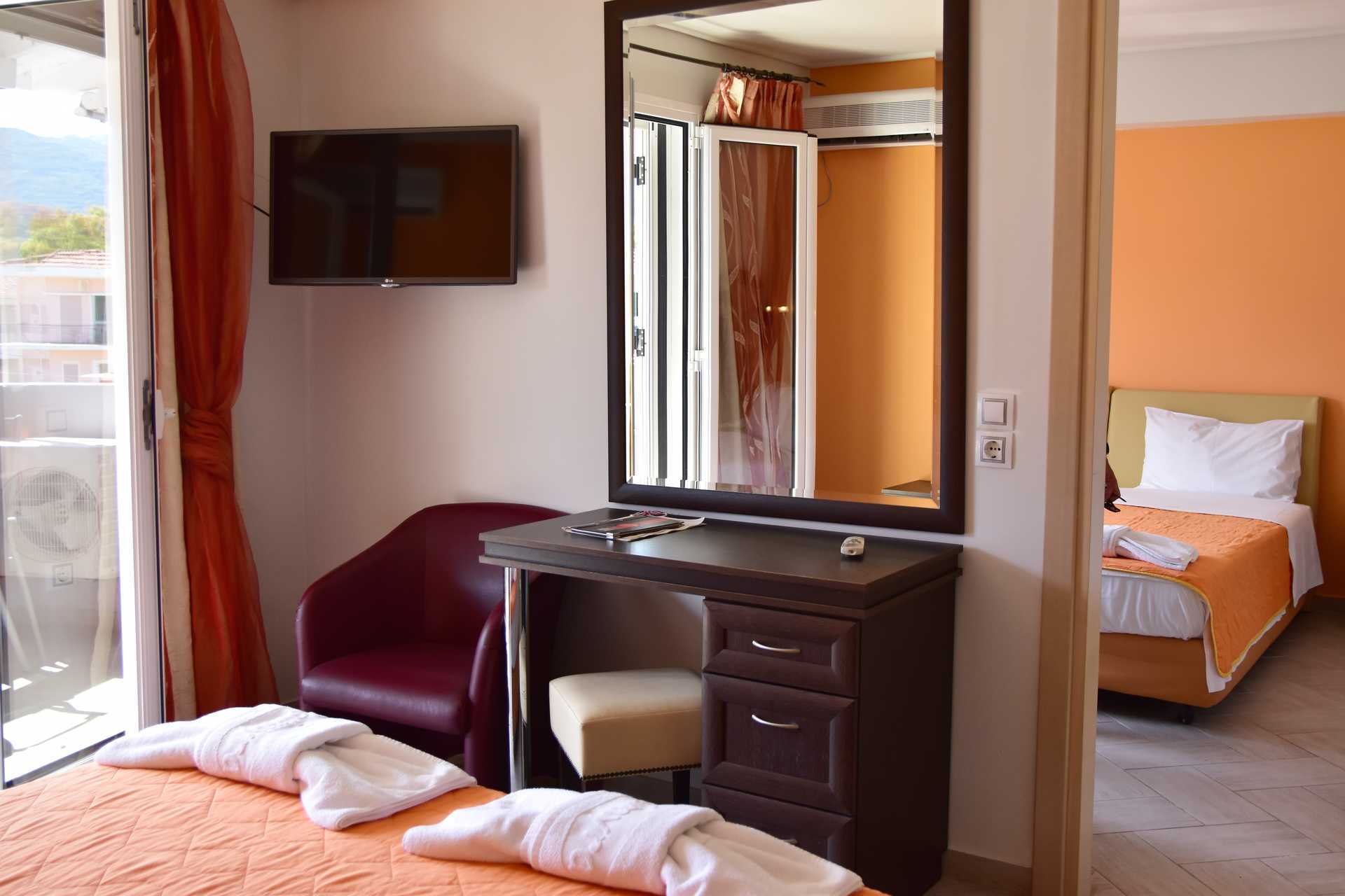 Perhehuone parvekkeella. Perhehuoneessa on kaksi makuuhuonetta. Toisessa makuuhuoneessa on parisänky ja toisessa kaksi erillistä sänkyä. Joissakin perhehuoneissa on pieni minikeittiö. Joissakin huoneissa on vedenkeitin. Jääkaappi pakastinlokerolla. Maksuton wifi. Ilmastointi ja tallelokero lisämaksusta. Tv paikallisilla kanavilla. Suihku ja wc. Siivous 6 krt/viikko.