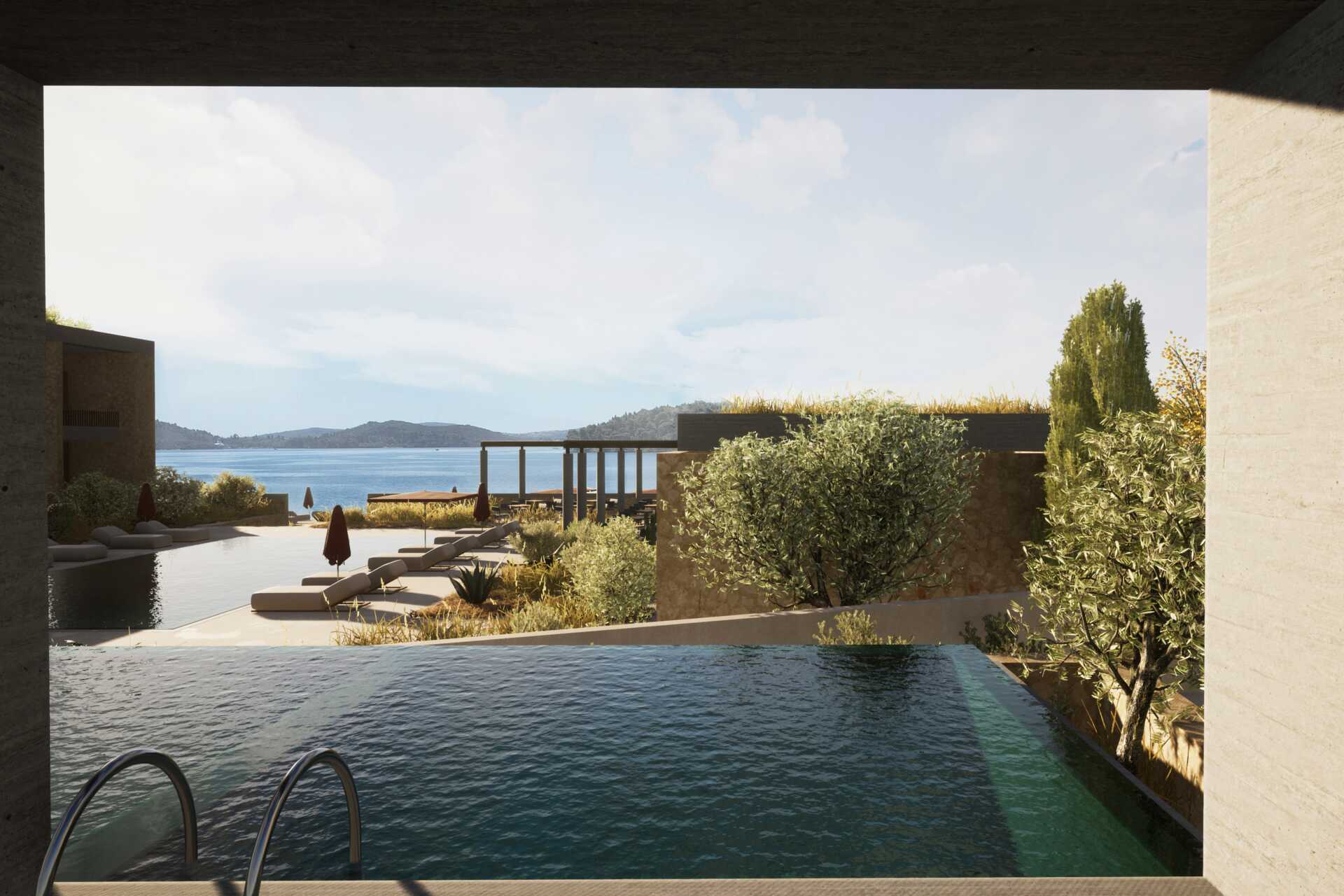 Sviitti omalla uima-altaalla ja merinäköalalla. Parivuode tai kaksi yhden hengen sänkyä. Maksuton wifi, ilmastointi ja tallelokero. Tv kansainvälisillä kanavilla. Jääkaappi. Vedenkeitin. Kylpyhuoneessa suihku ja wc. Siivous 7 krt/viikko.