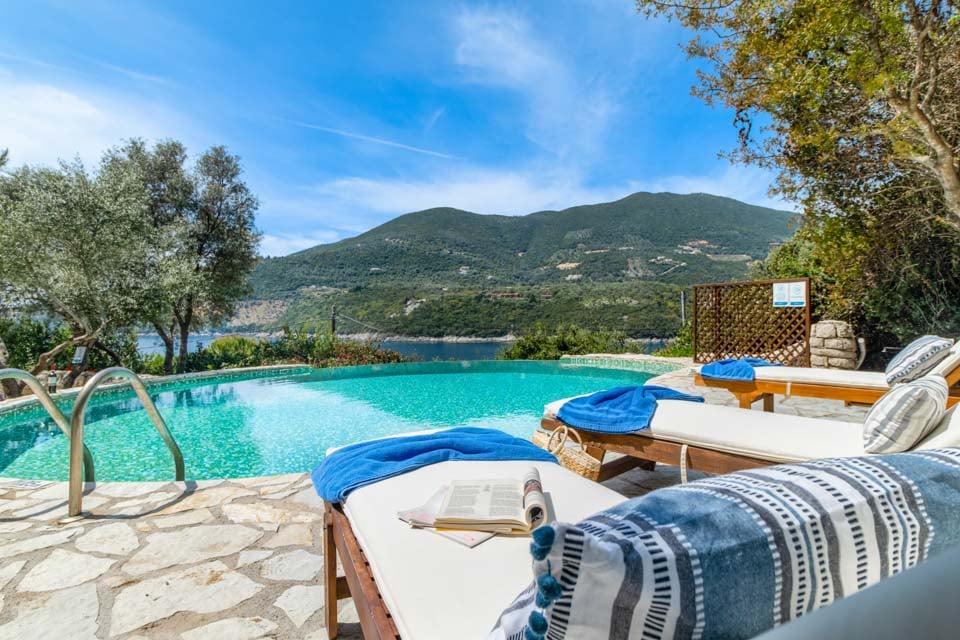 Luonnonmukaiseen ympäristöön täydentämään suunnitellussa huvilassa on upea, kaareva infinity-allas, joka halaa kiinteistön etuosaa. Altaan loistava turkoosi on vastakohtana alla olevan Joonianmeren azuurinsiniselle. Puiset uima-altaan reunalla olevat lepotuolit on sijoitettu nerokkaasti siten, että niistä on upea näköala. Tarjolla on myös rottinkituolit ja ruokailukalusteet, joilla voi nauttia aterioita ja juomia ulkona.