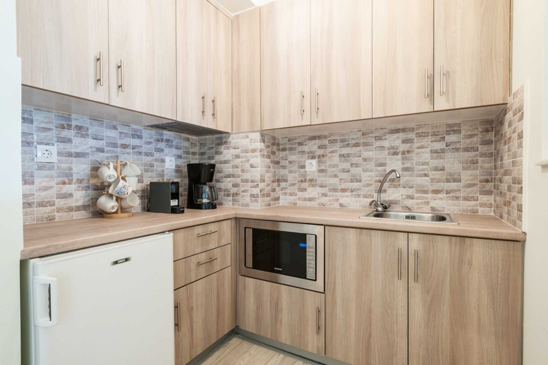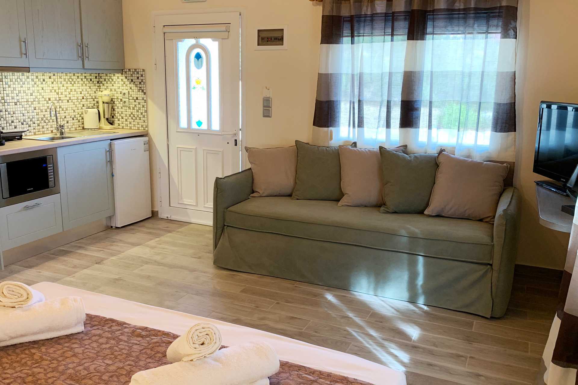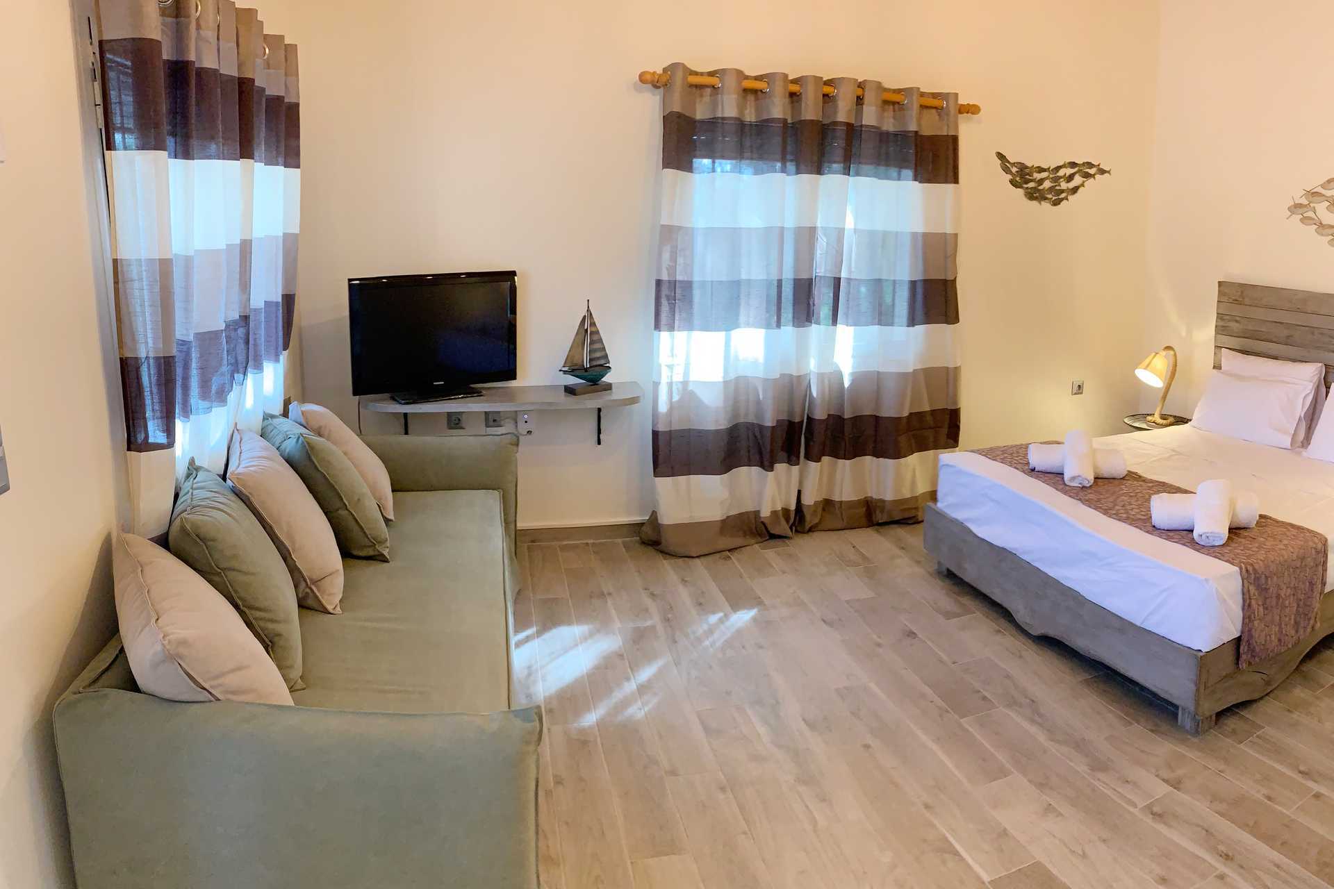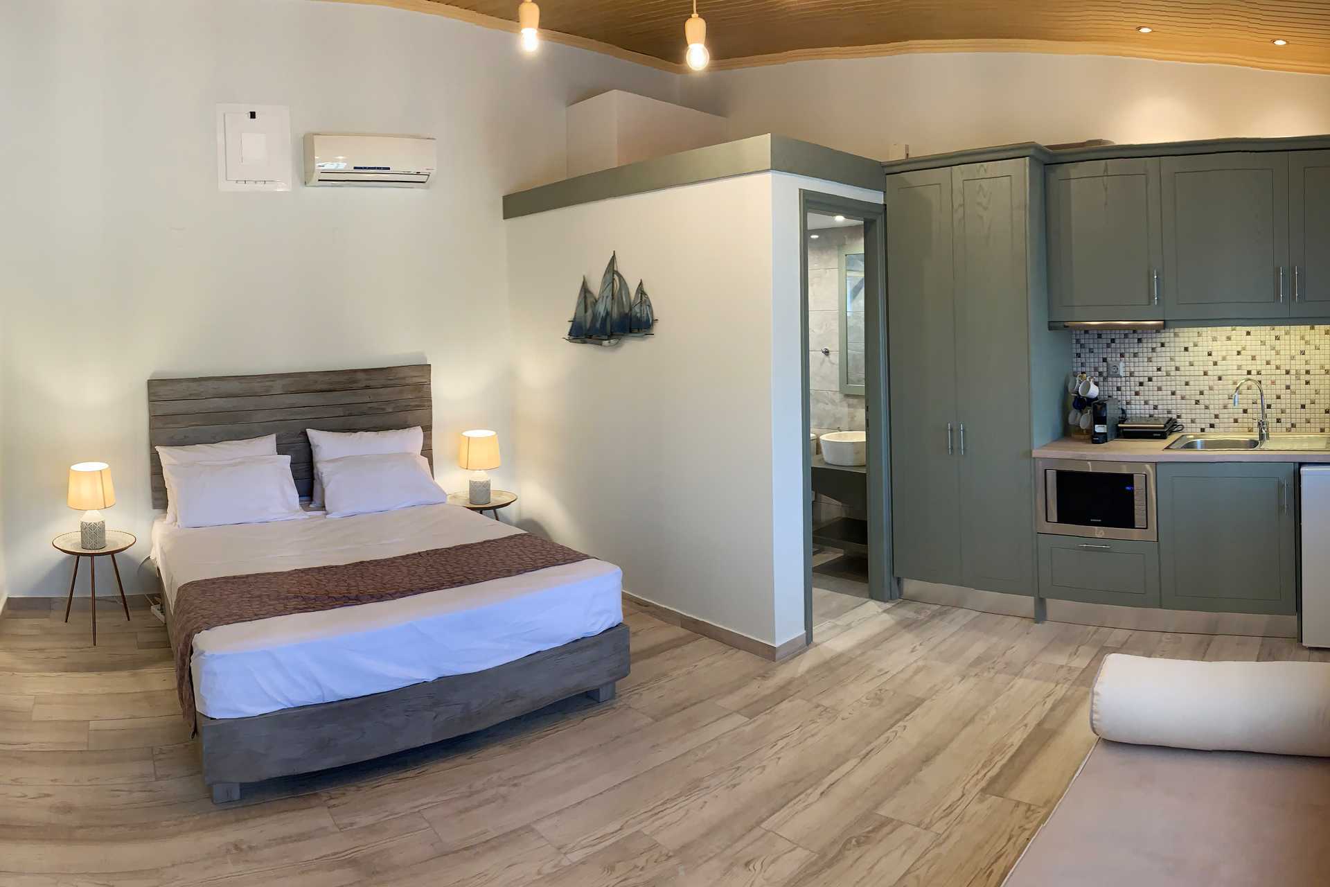 Yksiö parvekkeella tai terassilla. Yhdistetty makuuhuone ja minikeittiö. Parivuode. Lisävuodemahdollisuus vuodesohvasta. Minikeittiö, jossa jääkaappi, keittolevyt, kahvinkeitin, espressokeitin, vedenkeitin, mikro ja yksinkertainen keittiövarustus. Maksuton ilmastointi ja wifi. Tv kansainvälisillä kanavilla. Hiustenkuivain. Kylpyhuoneessa suihku ja wc. Siivous 6 krt/viikko.