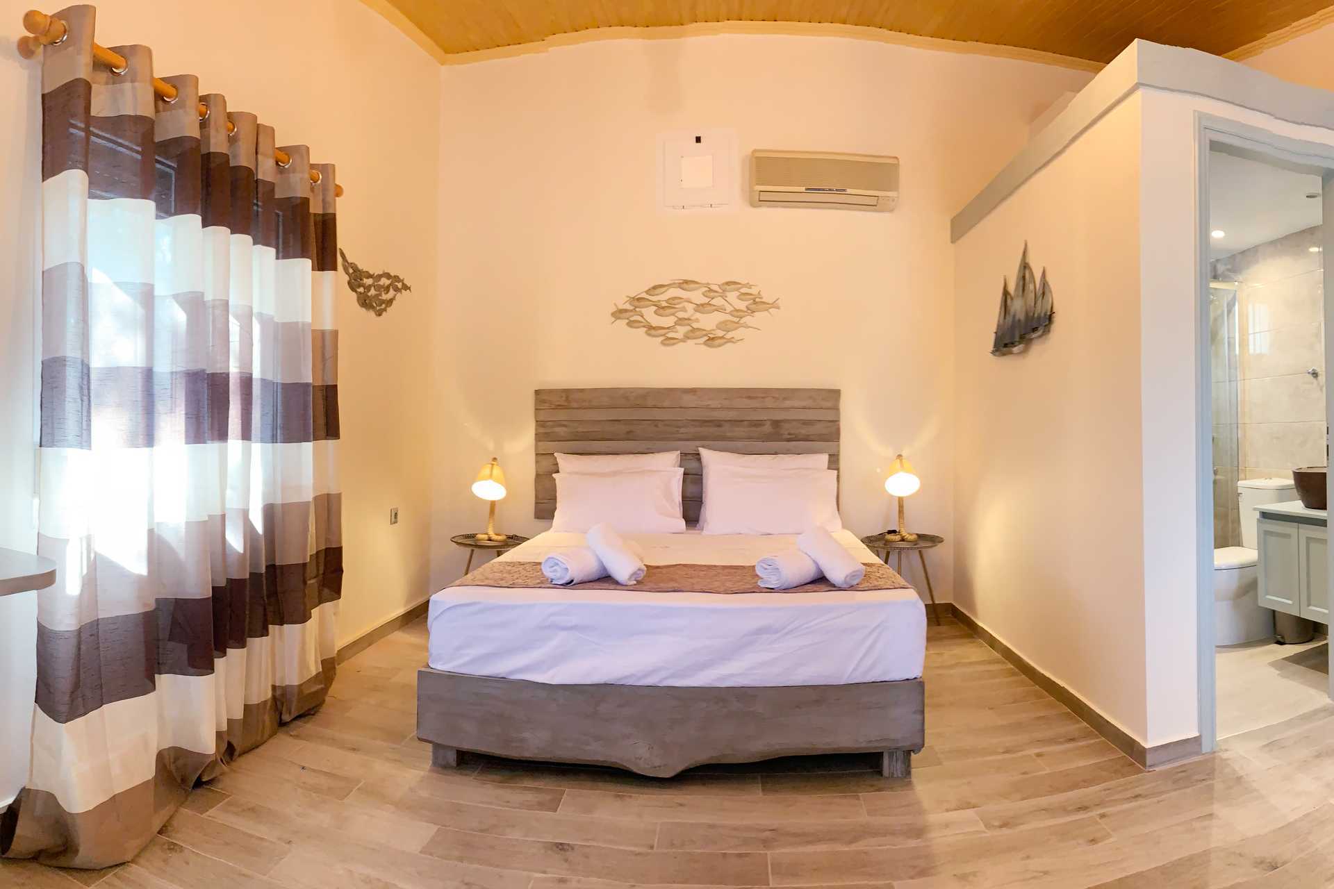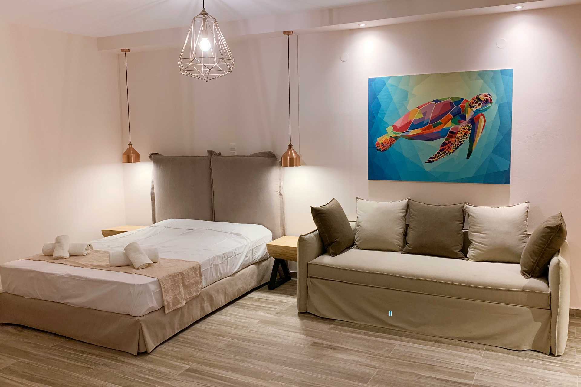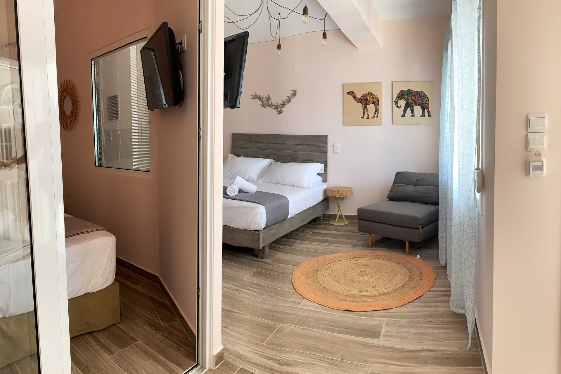 Kaksio parvekkeella tai terassilla. Makuuhuone sekä yhdistetty olohuone ja minikeittiö. Parivuode, joka on erotettu yhdistetystä olohuone/minikeittiöstä lasiseinällä. Toinen parivuode olohuoneessa sekä sohva. Minikeittiö, jossa jääkaappi, keittolevyt, kahvinkeitin, espressokeitin, vedenkeitin, mikro ja yksinkertainen keittiövarustus. Maksuton ilmastointi ja wifi. Tv kansainvälisillä kanavilla. Hiustenkuivain. Kylpyhuoneessa suihku ja wc. Siivous 6 krt/viikko.