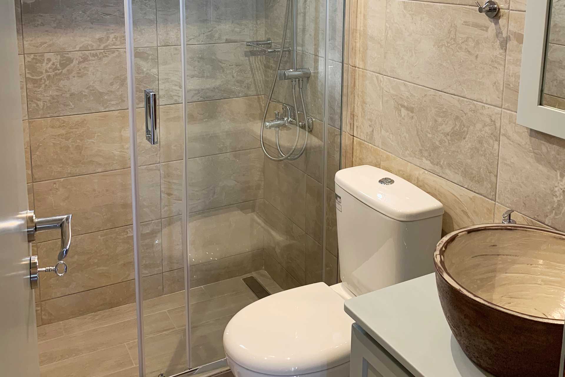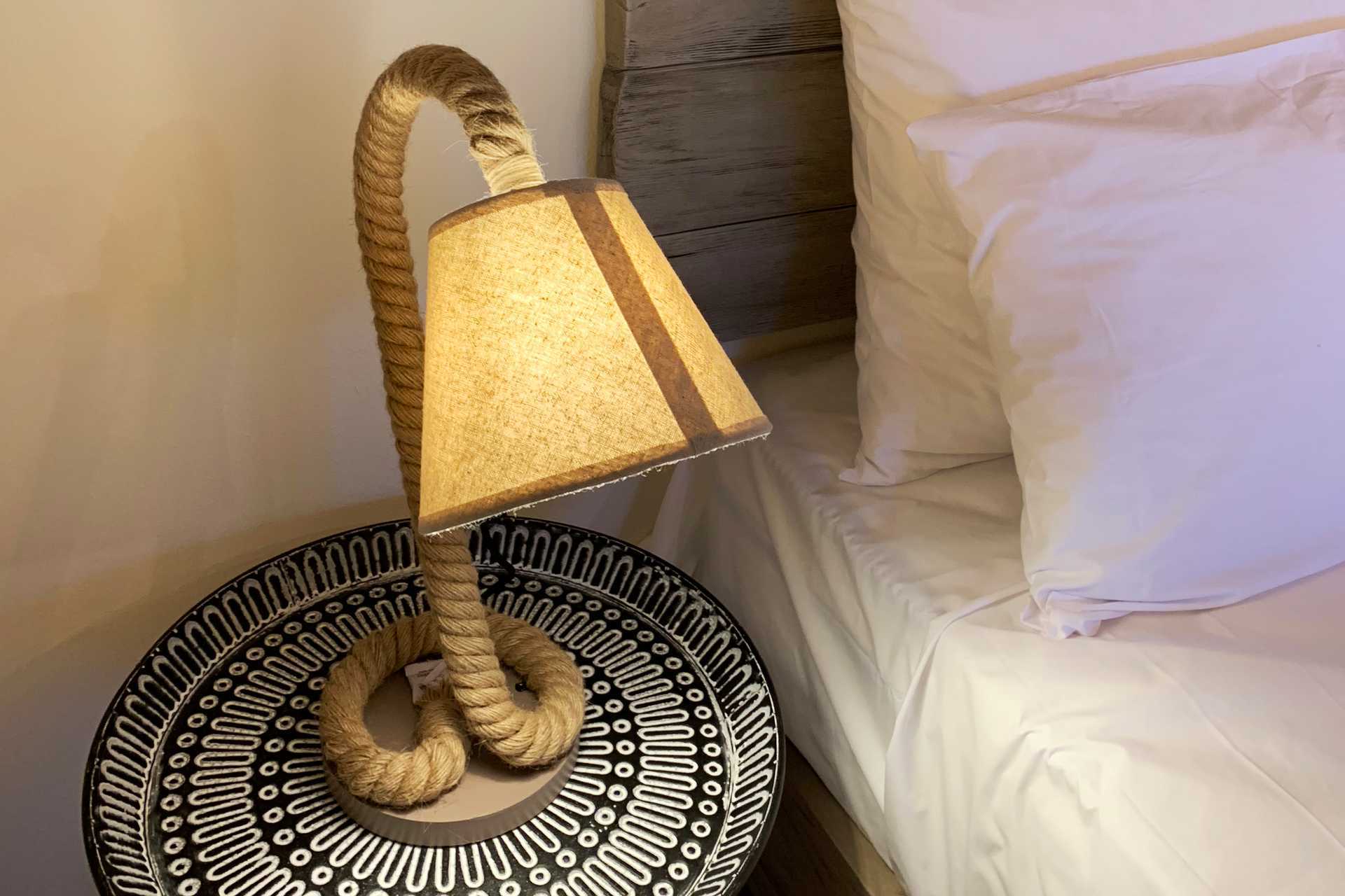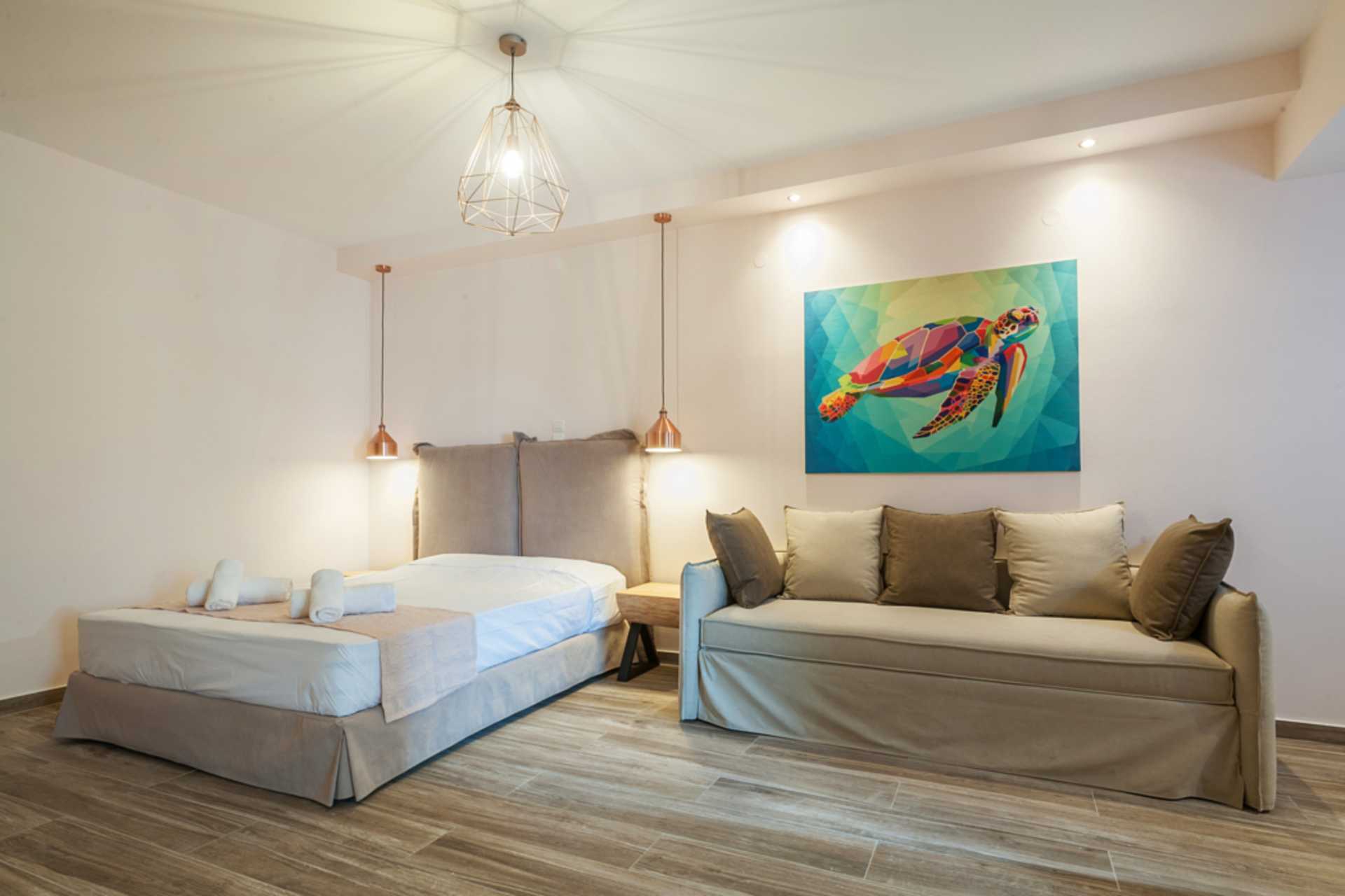 Kaksio parvekkeella tai terassilla. Makuuhuone sekä yhdistetty olohuone ja minikeittiö. Parivuode, joka on erotettu yhdistetystä olohuone/minikeittiöstä lasiseinällä. Toinen parivuode olohuoneessa sekä sohva. Minikeittiö, jossa jääkaappi, keittolevyt, kahvinkeitin, espressokeitin, vedenkeitin, mikro ja yksinkertainen keittiövarustus. Maksuton ilmastointi ja wifi. Tv kansainvälisillä kanavilla. Hiustenkuivain. Kylpyhuoneessa suihku ja wc. Siivous 6 krt/viikko.