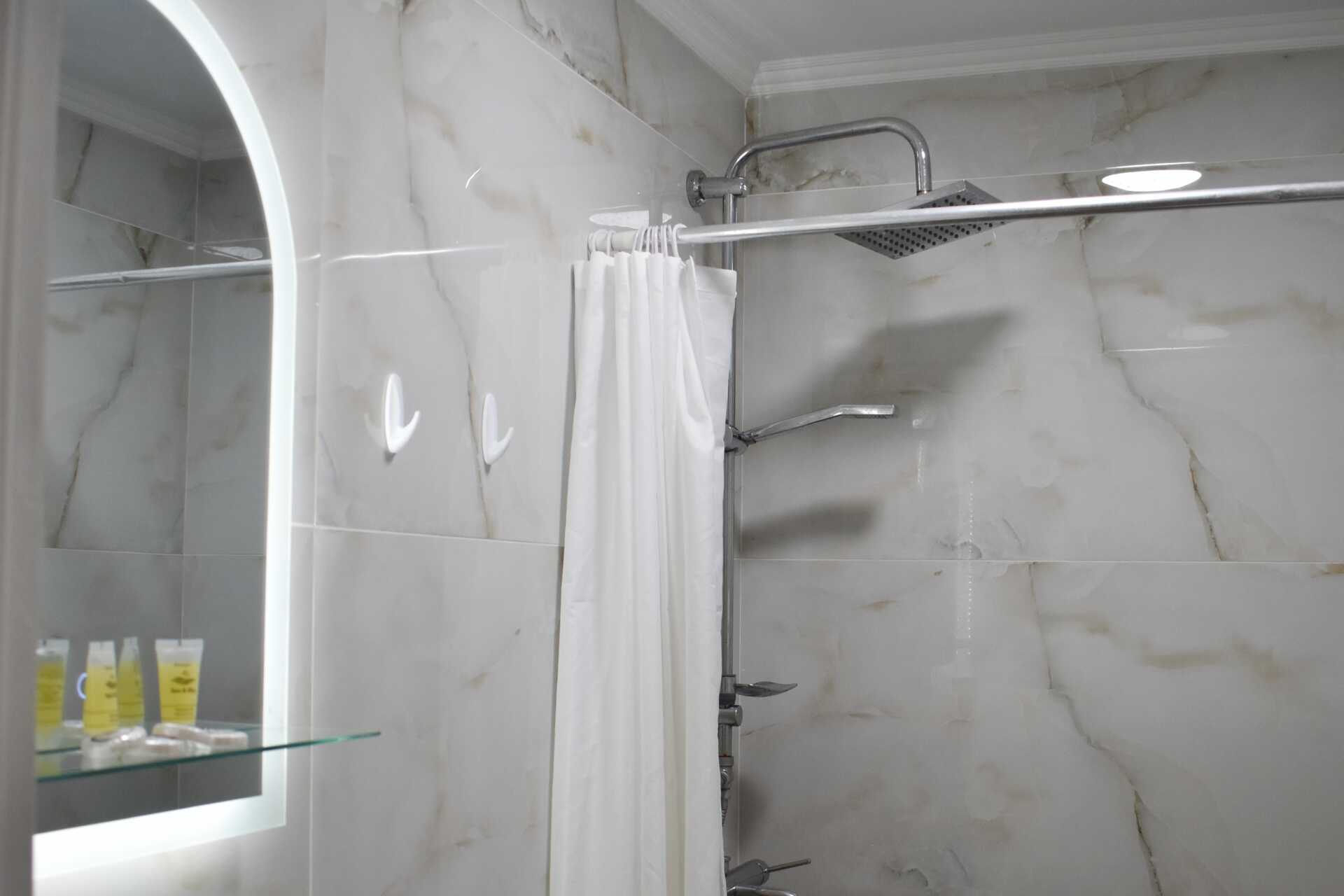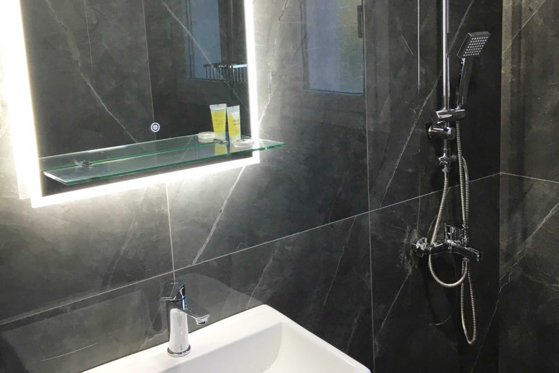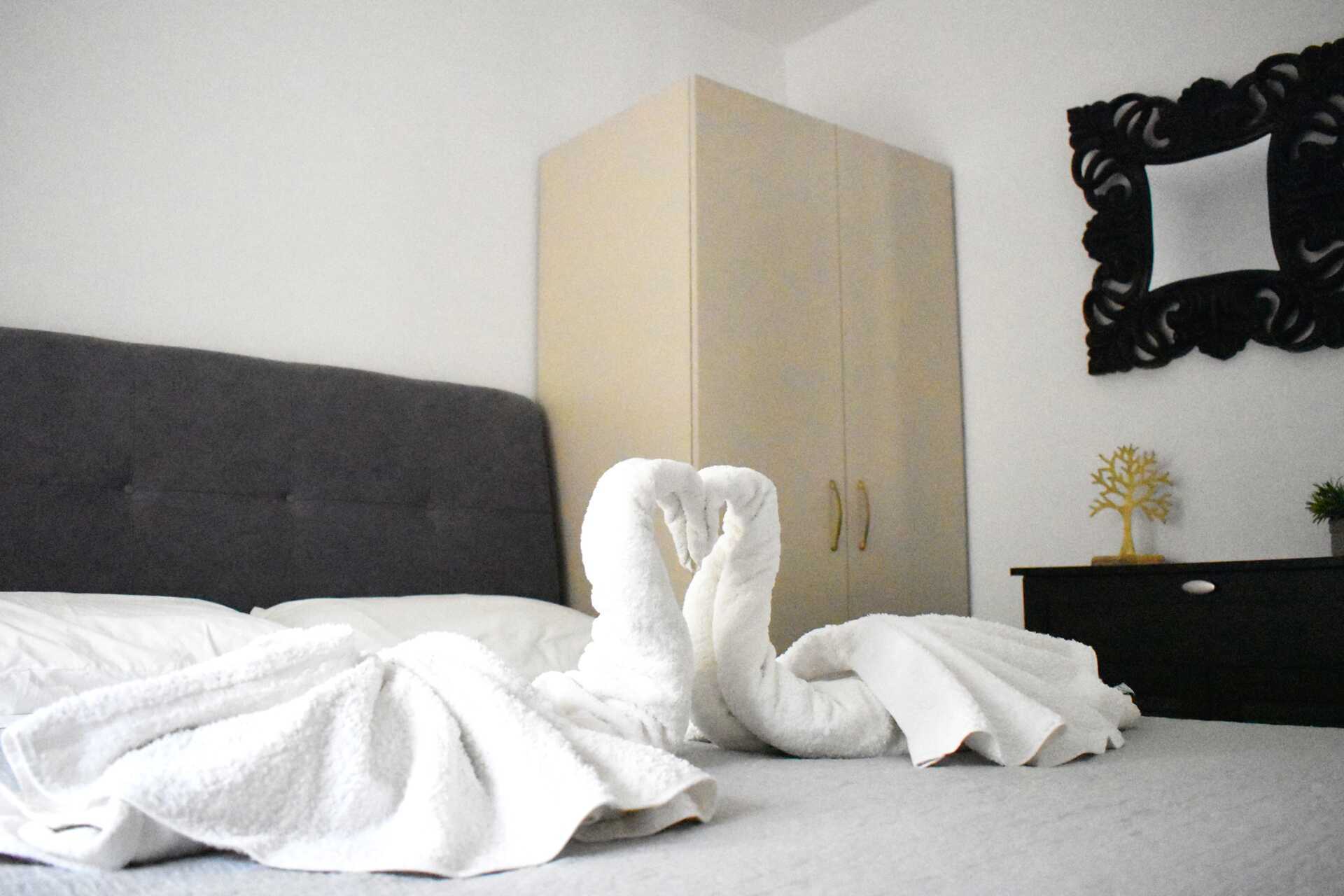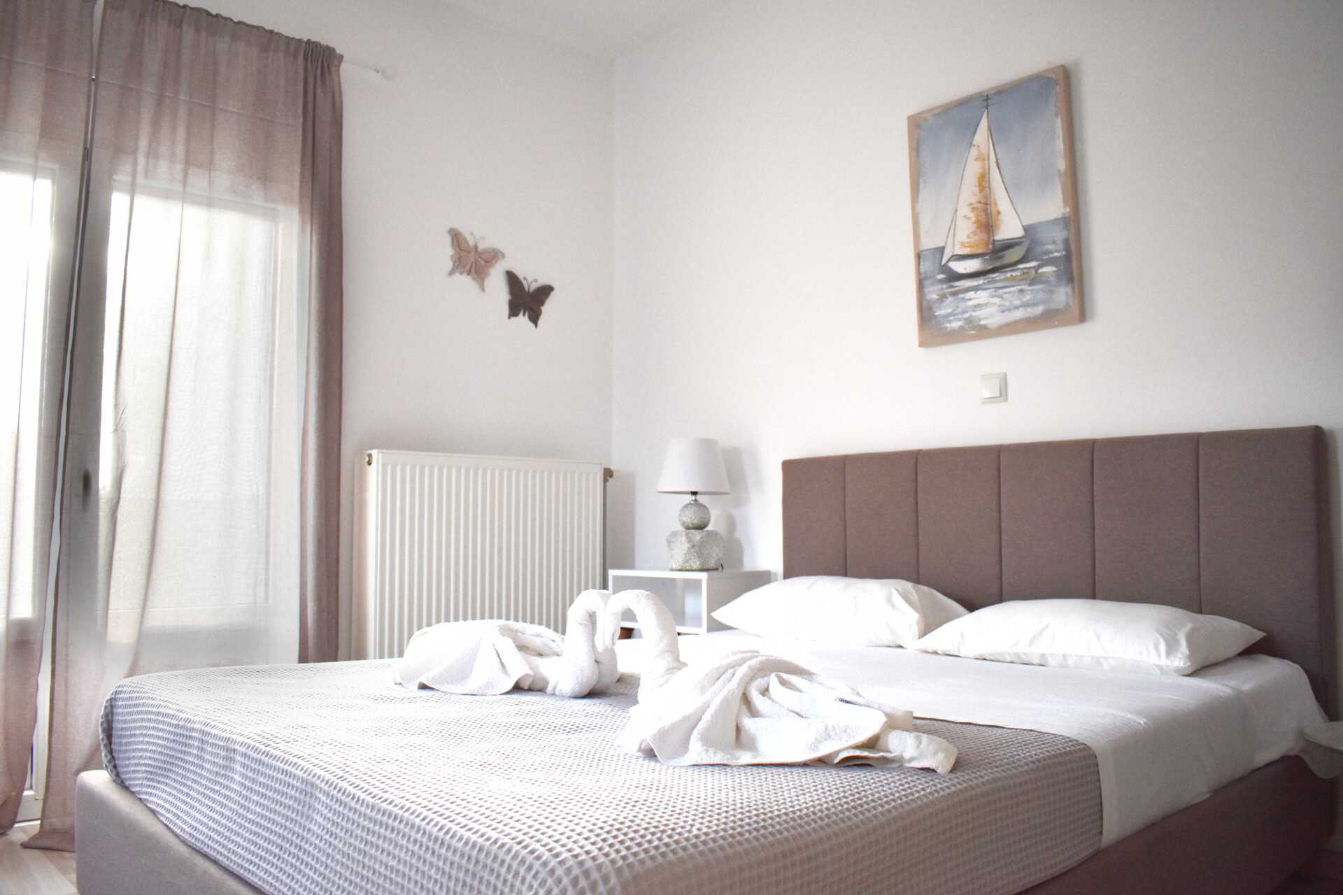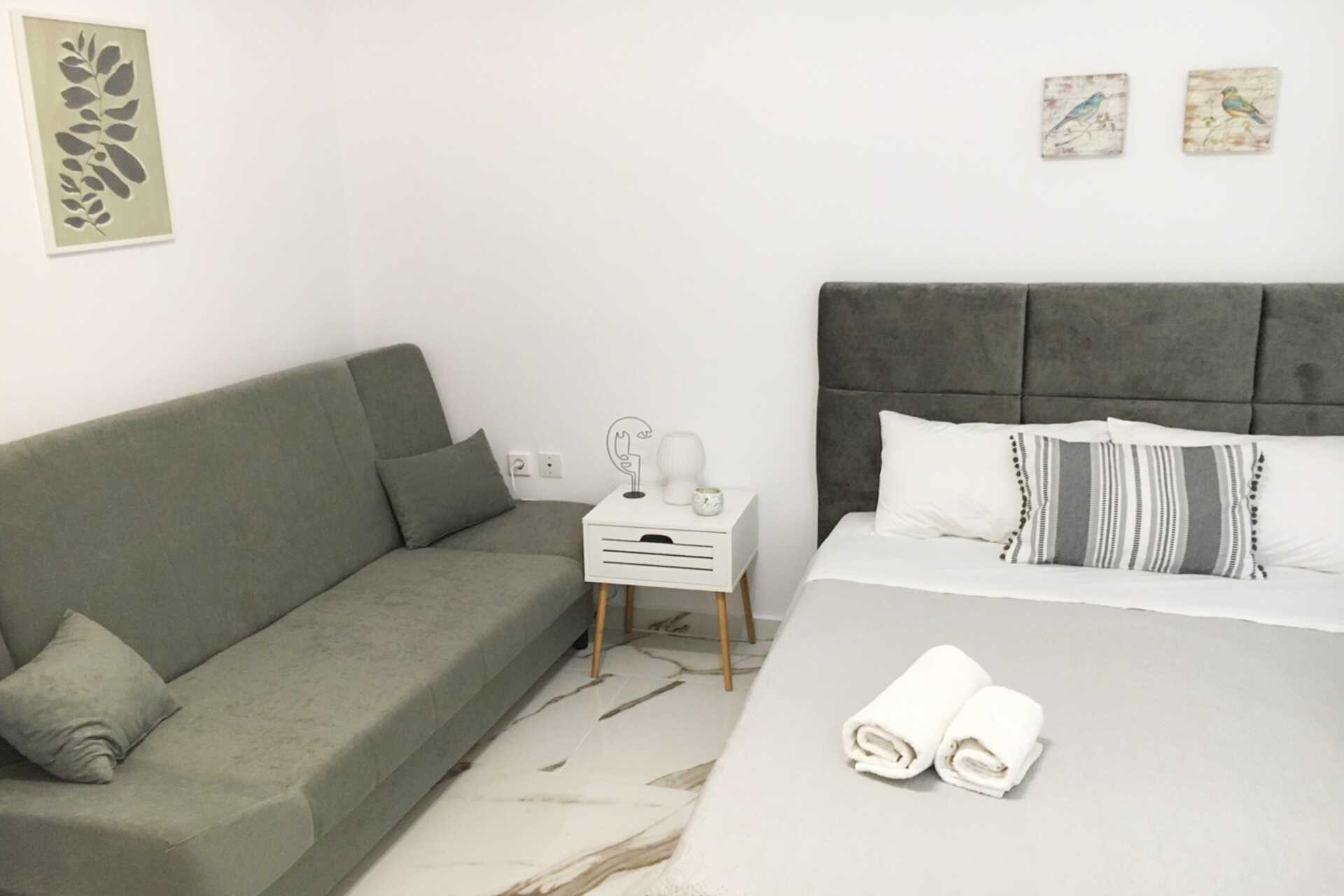 Parvekkeellinen kolmio. Kaksi makuuhuonetta sekä yhdistetty olohuone ja minikeittiö. Yhdessä makuuhuoneessa on parivuode ja toisessa makuuhuoneessa erilliset vuoteet. Minikeittiössä liesi, jääkaappi ja yksinkertainen keittiövarustus. Maksuton wifi ja ilmastointi. Tv paikallisilla kanavilla. Kylpyhuoneessa suihku tai kylpyamme ja wc. Siivous 7 krt/viikko.