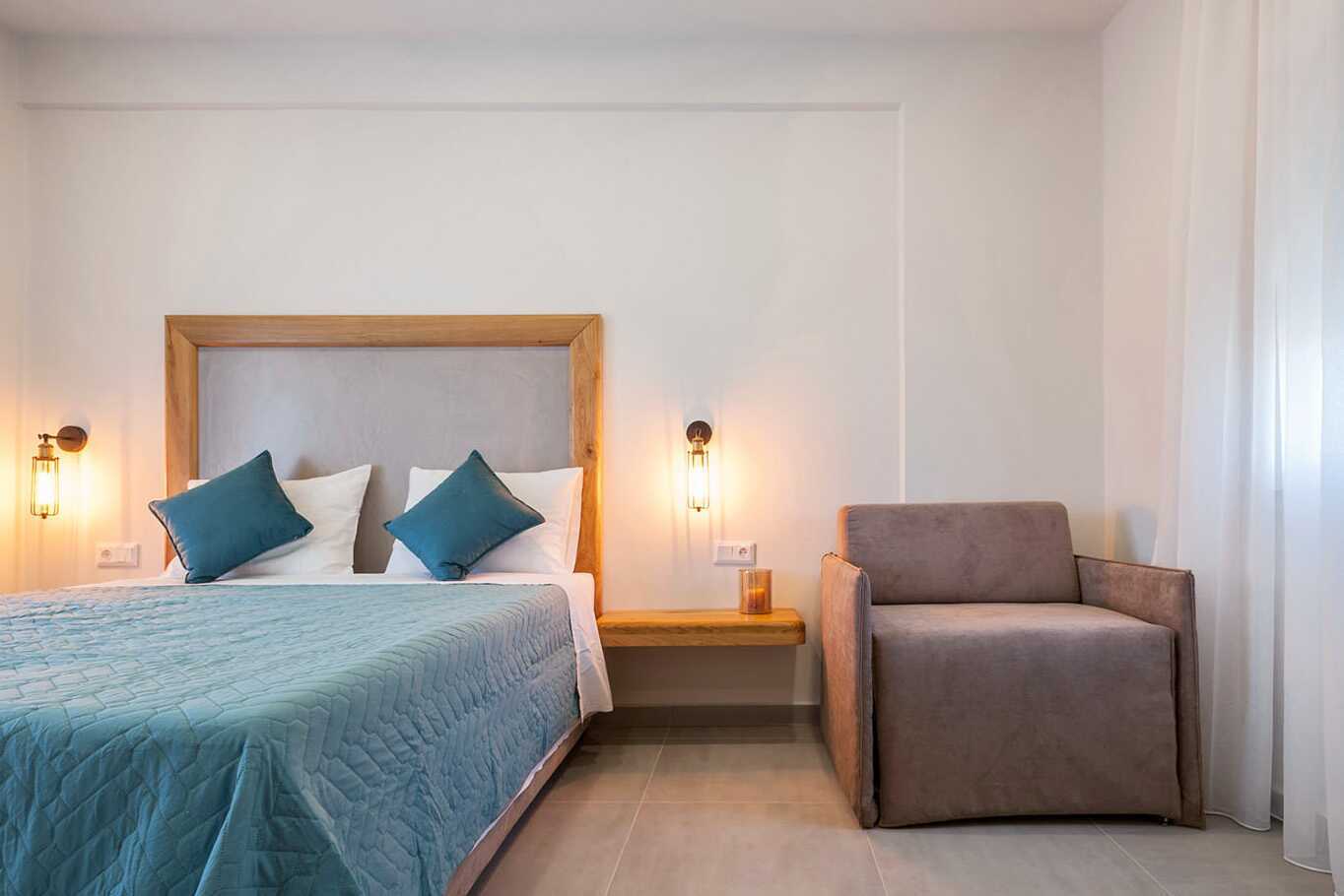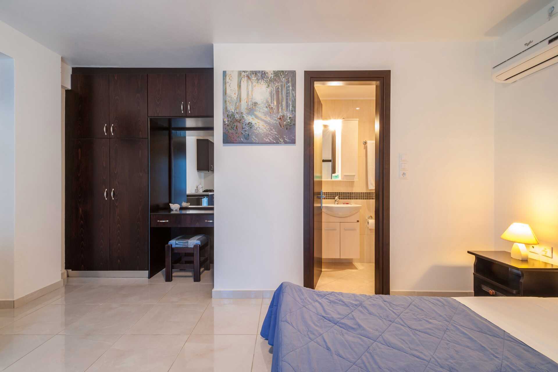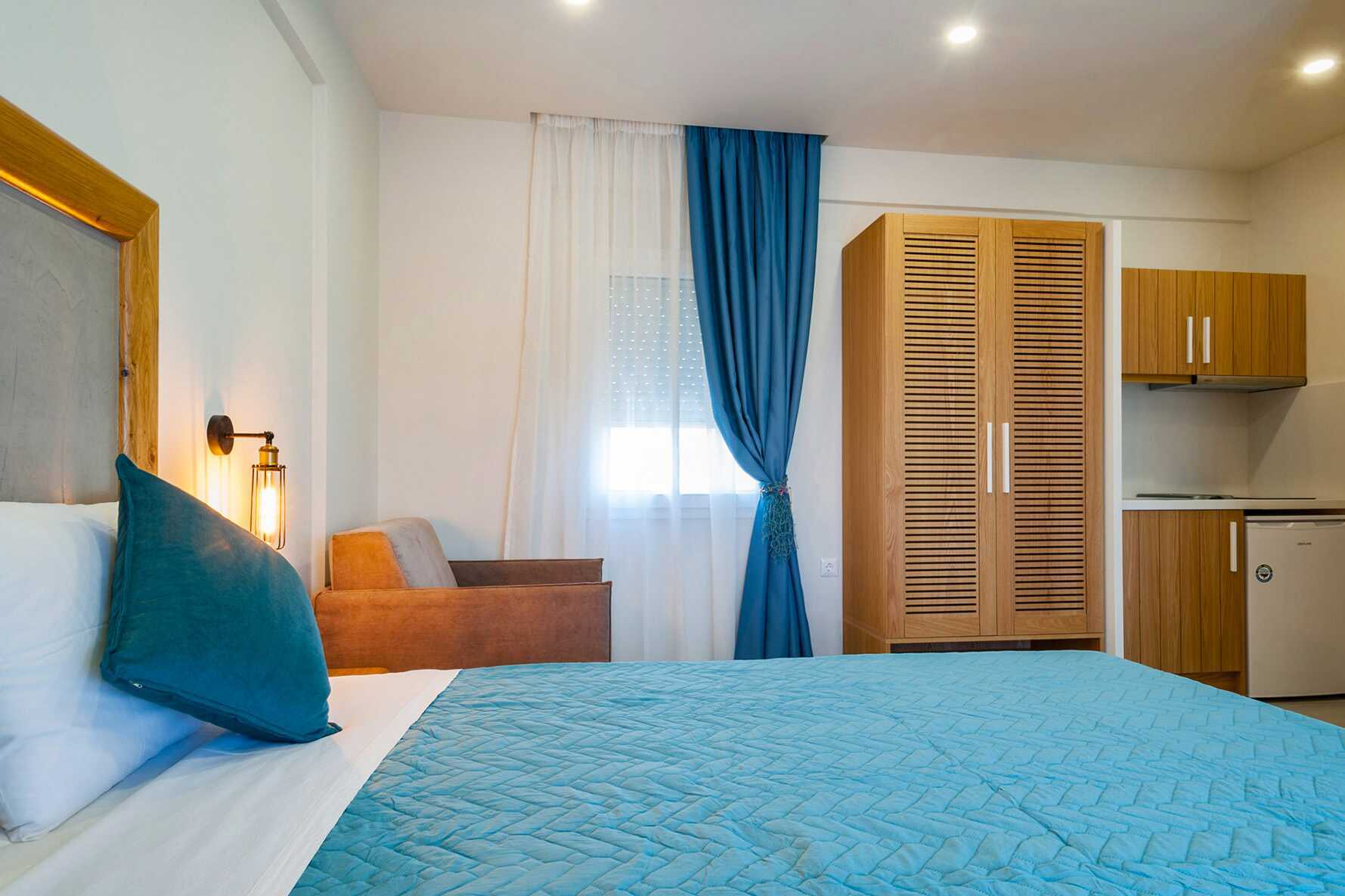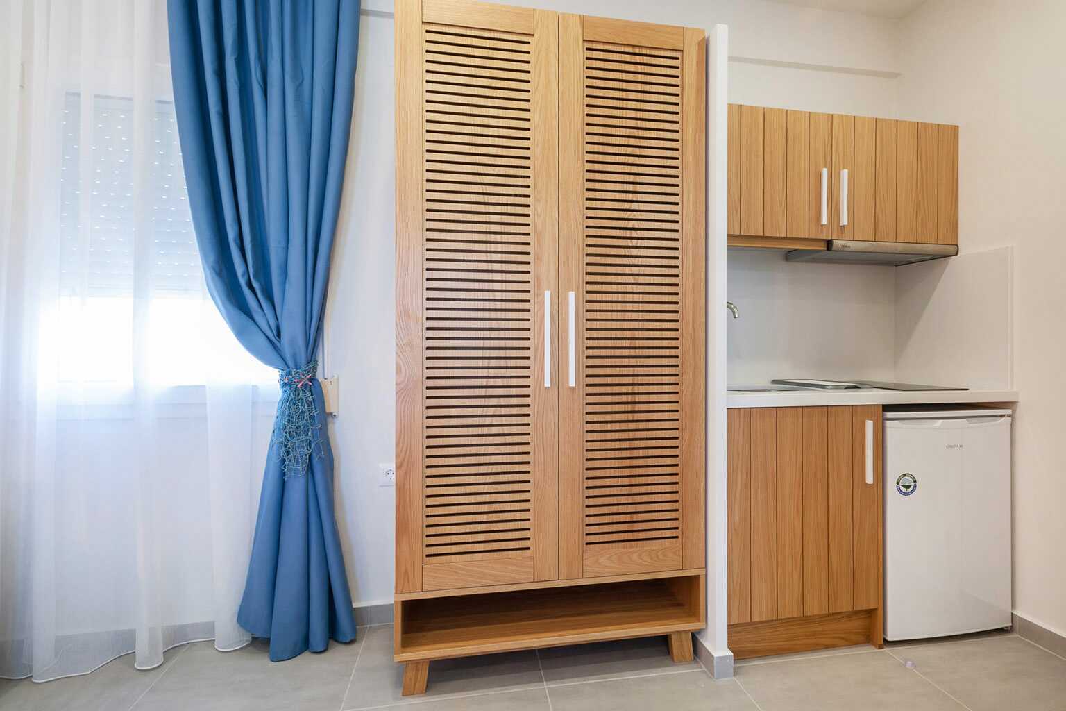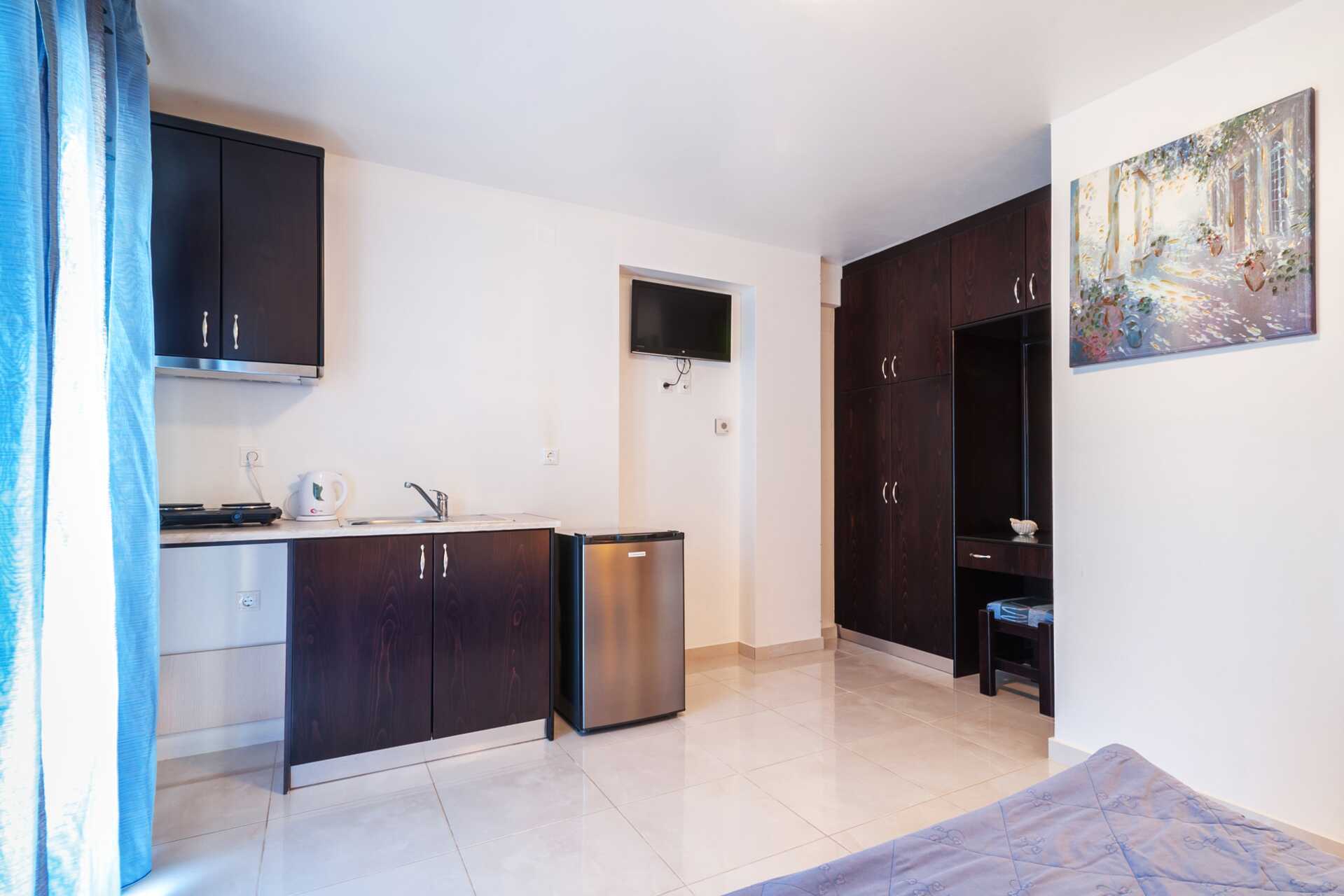 Tilavat yksiöt, joissa on parveke ja merinäköala tai maaterassi. Parivuode tai kaksi erillistä sänkyä. Minikeittiö , jossa on keittolevyt, jääkaappi ja pakastin sekä yksinkertaisemman keittiövälineet. Tv. Maksuton ilmastointi ja wifi. Hiustenkuivain. Kylpyamme/suihku ja wc. Siivous 6 krt/viikko.