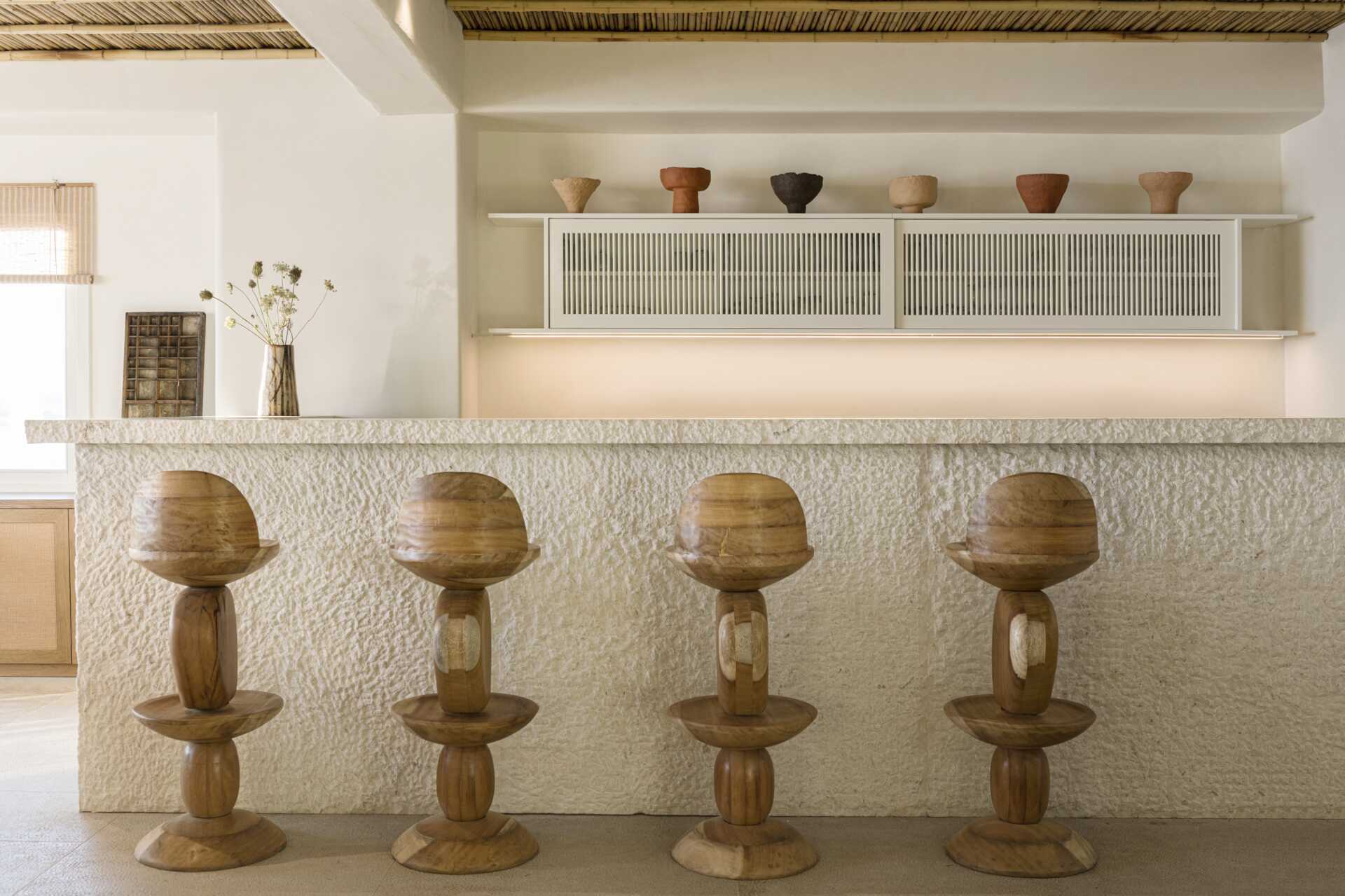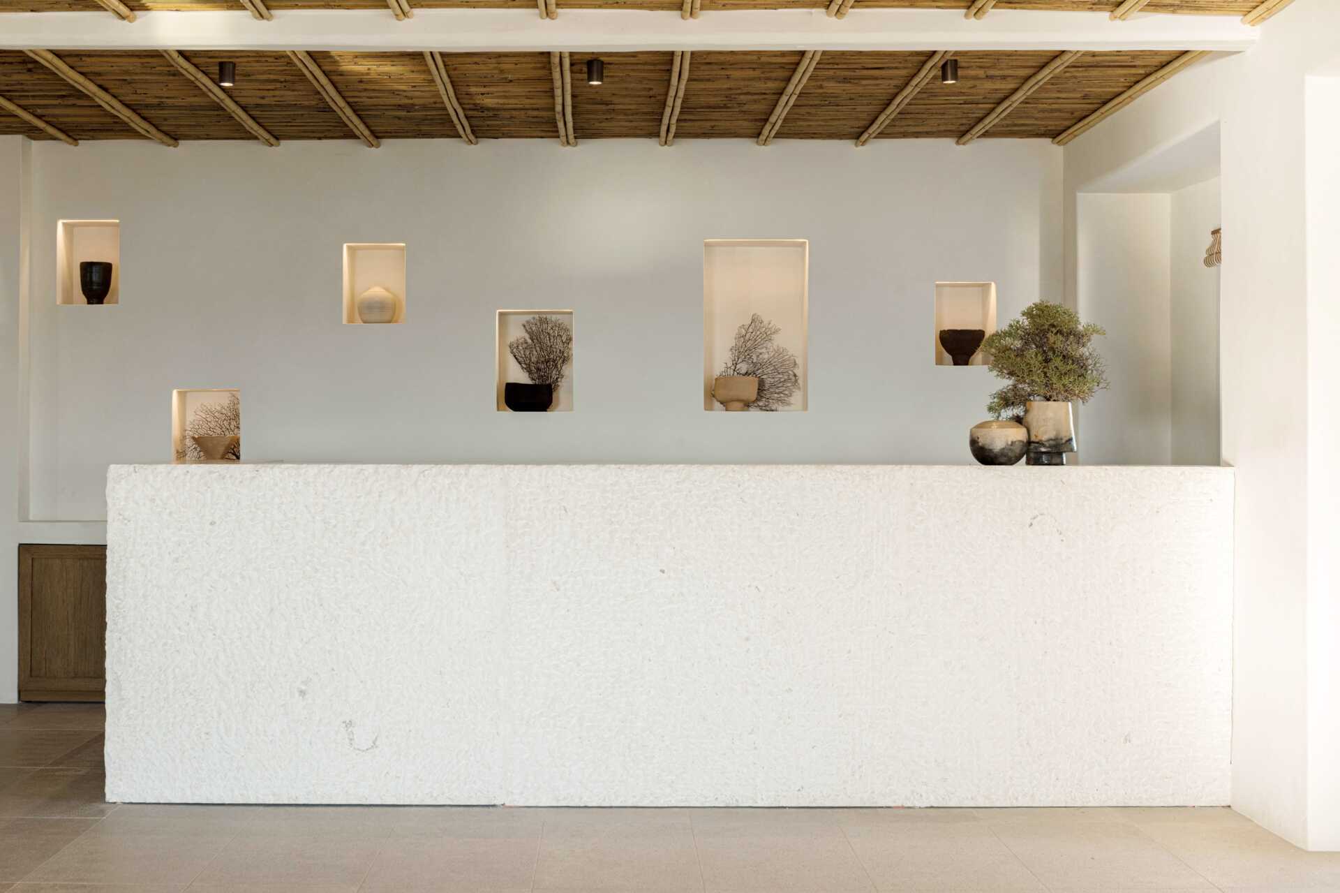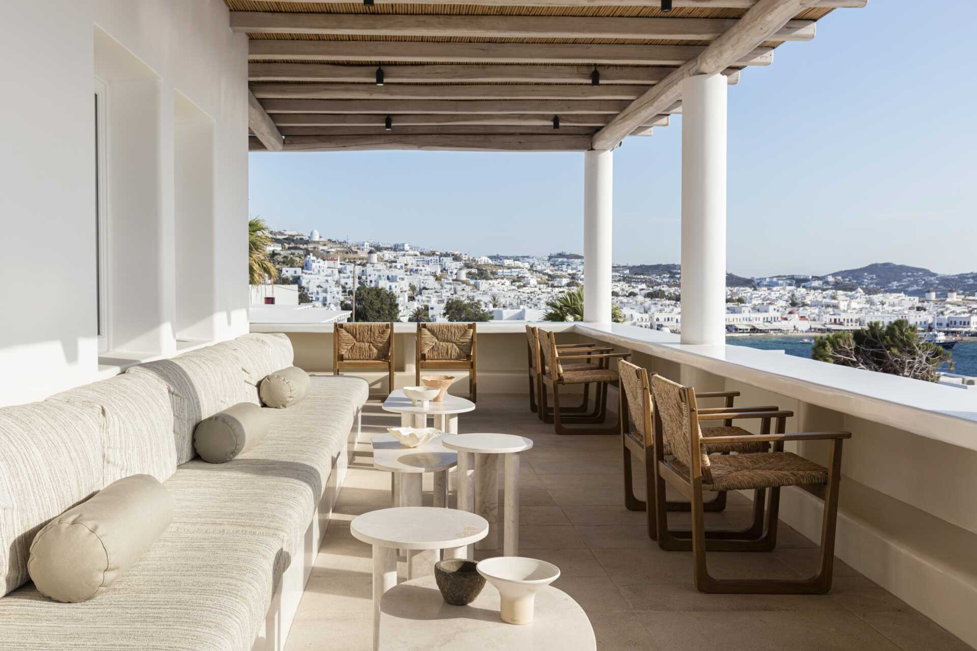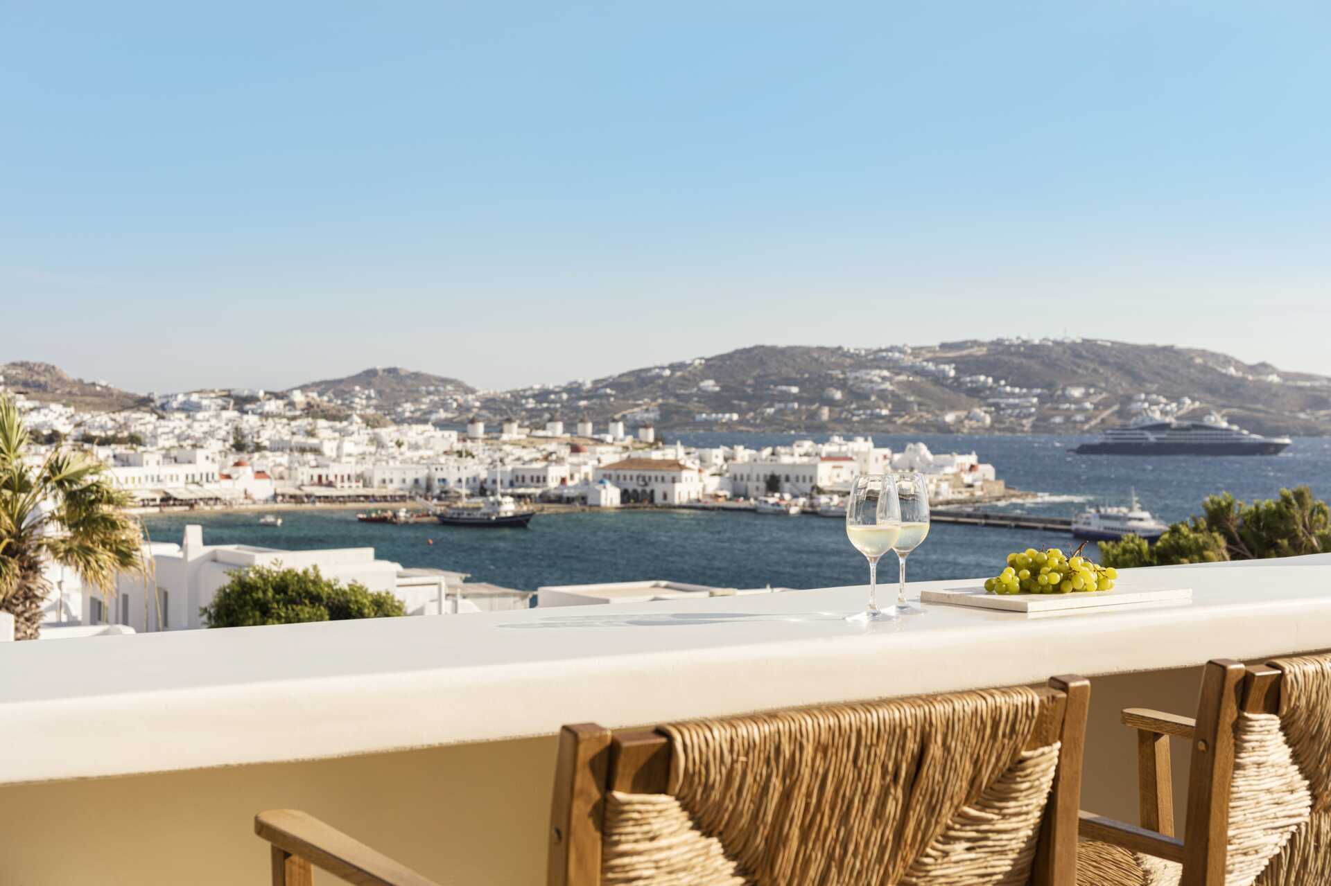 Porto Mykonosissa on kykladilaista arkkitehtuuria, jossa on kalkitut seinät ja modernit sisustusyksityiskohdat, jotka luovat harmonisen ja rauhoittavan tunnelman.
