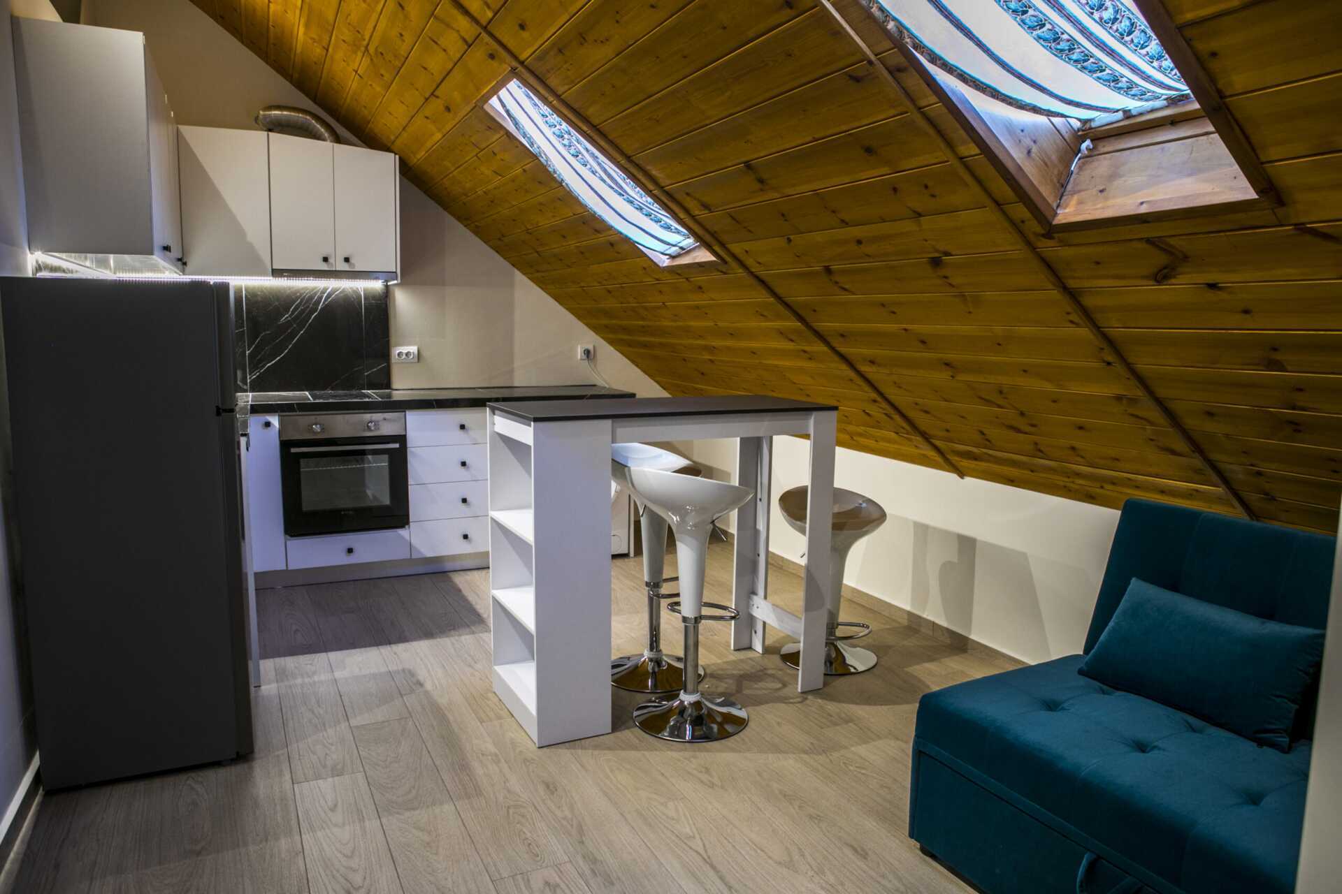 Kaksio parvekkeella ja merinäköalalla. Makuuhuone sekä yhdistetty olohuone ja minikeittiö. Joissakin huoneistoissa on viistokatto. Parivuode. Lisävuodemahdollisuus vuodesohvasta. Minikeittiö, jossa ruokailutila baaritasolla, jääkaappi ja pakastin, keittolevyt, uuni ja yksinkertainen keittiövarustus. Tv kansainvälisillä kanavilla. Silitysrauta ja -lauta. Pesukone. Hiustenkuivain. Siivous 6 krt/viikko. Alle 2-vuotiaat lapset lasketaan lisävuoteella majoittuviksi henkilöiksi.