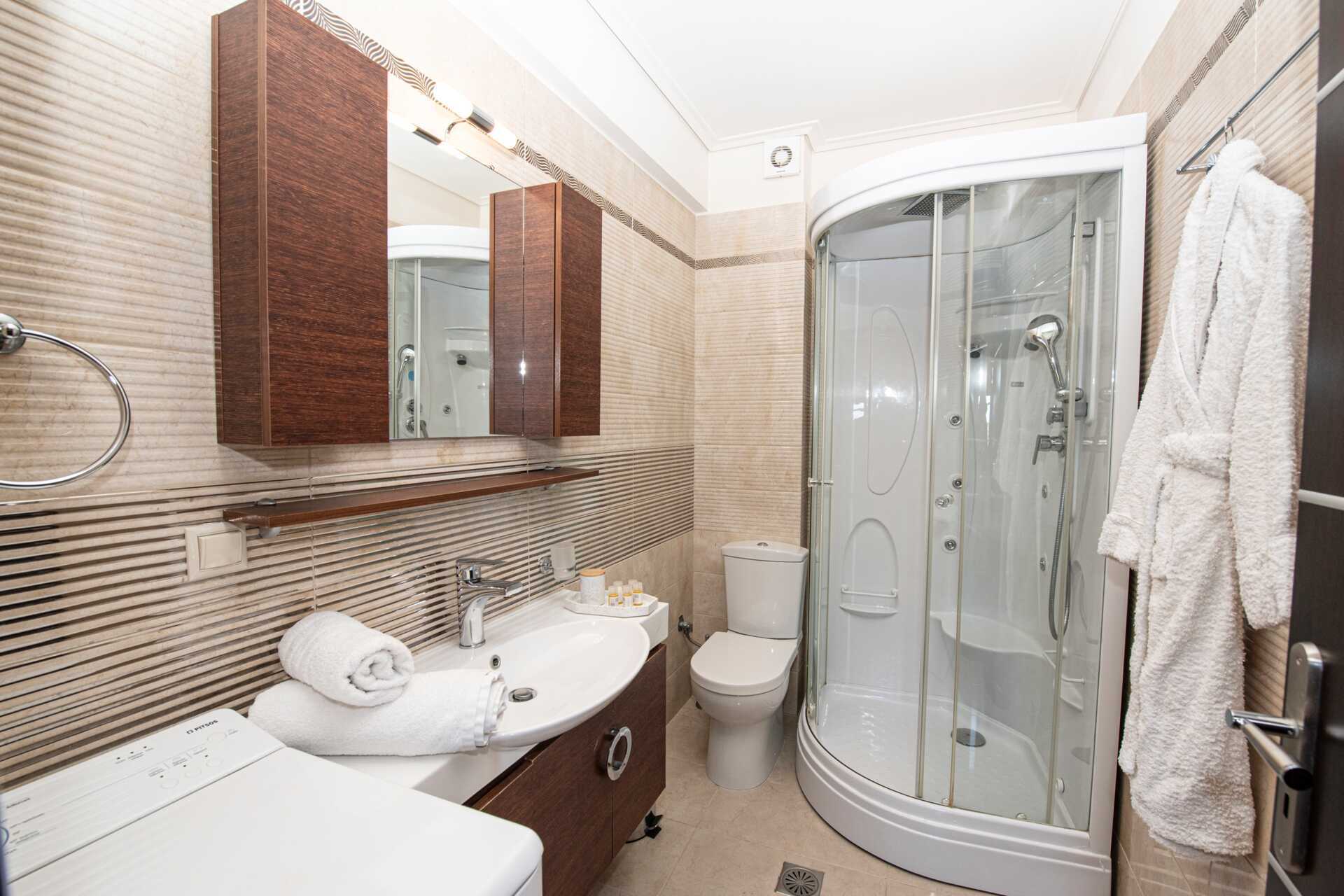 Kaksio parvekkeella, osasta merinäköala. Makuuhuone sekä yhdistetty olohuone ja minikeittiö. Olohuoneessa on takka. Yksi parivuode tai kaksi erillistä vuodetta. Lisävuodemahdollisuus vuodesohvasta. Minikeittiössä keittolevyt, uuni, jääkaappi pakastelokerolla, vedenkeitin, kahvinkeitin ja yksinkertainen keittiövarustus. Kahvinkeitin - kaksi kapselia päivässä sisältyy hintaan. Maksuton wifi, ilmastointi ja tallelokero. Tv kansainvälisillä kanavilla. Pesukone. Kylpytakit. Kylpyhuoneessa suihku ja wc. Siivous 6 krt/viikko. Alle 2-vuotiaat lapset lasketaan lisävuoteella majoittuviksi henkilöiksi.