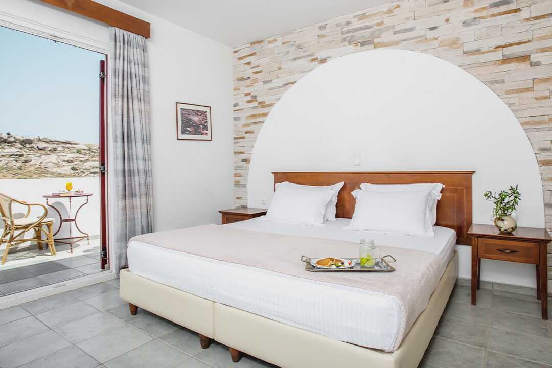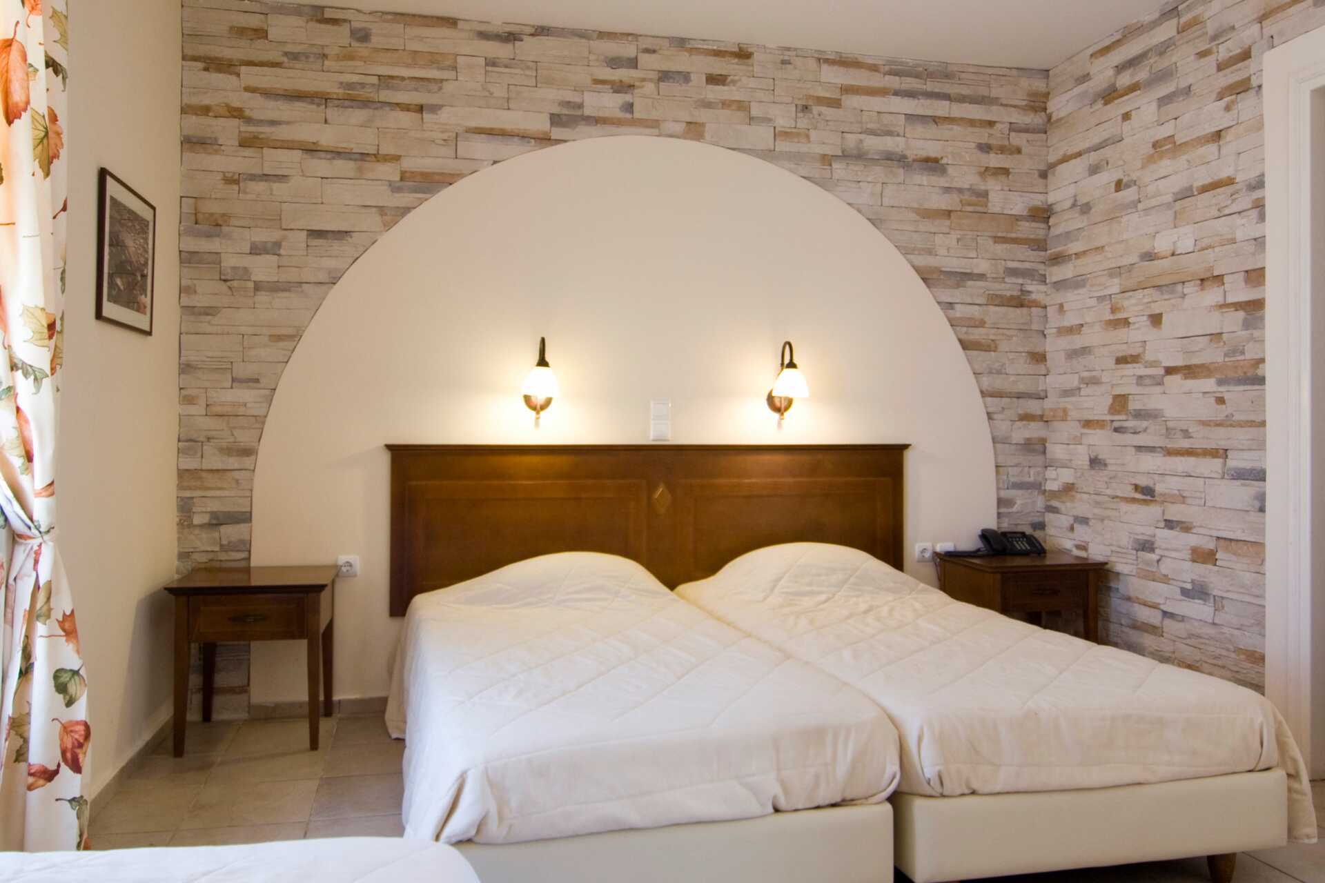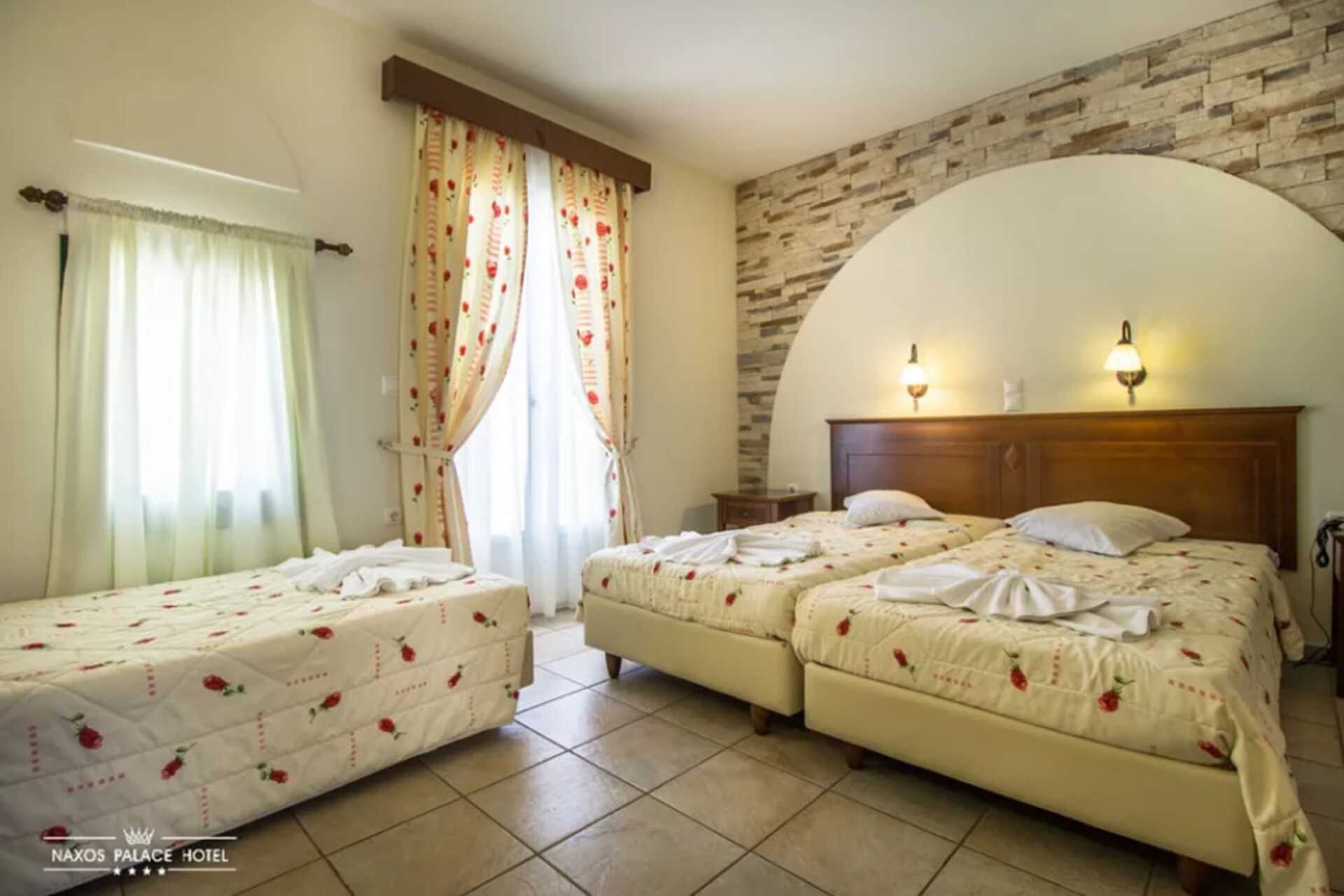 Kolmen hengen huone parvekkeella tai terassilla. Yksi parivuode tai kaksi erillistä sänkyä ja yksi yhden hengen sänky. Maksuton wifi, ilmastointi ja tallelokero. Jääkaappi. Tv kansainvälisillä kanavilla. Hiustenkuivain. Suihku ja wc. Siivous 7 krt/viikko.