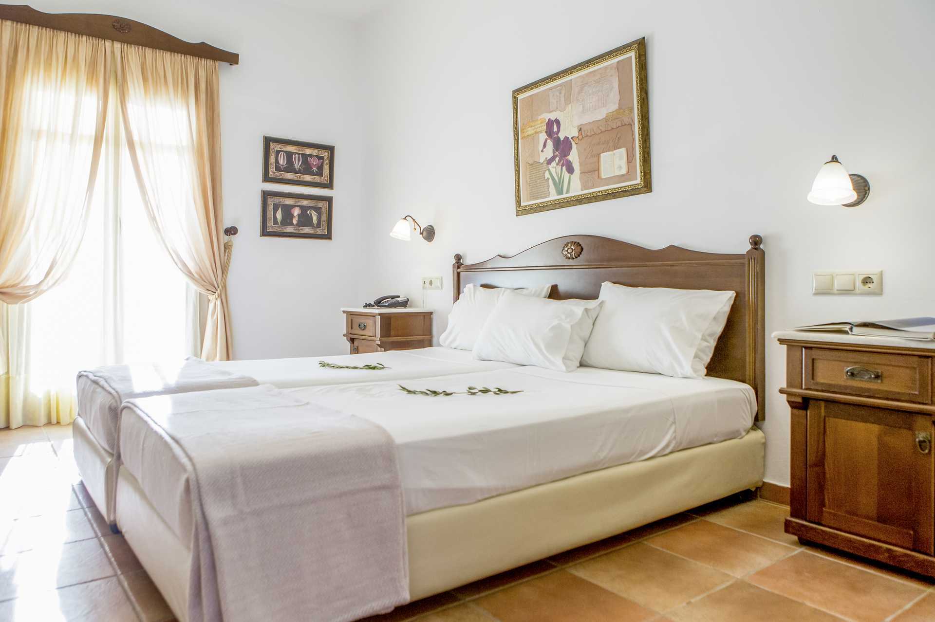 Kahden hengen huone parvekkeella tai terassilla. Kaksi yhden hengen sänkyä. Lisävuodemahdollisuus. Maksuton wifi, ilmastointi ja tallelokero. Jääkaappi. Tv paikallisilla kanavilla. Hiustenkuivain. Suihku ja wc. Siivous 7 krt/viikko. Alle 2-vuotiaat lapset lasketaan lisävuoteella majoittuviksi henkilöiksi.