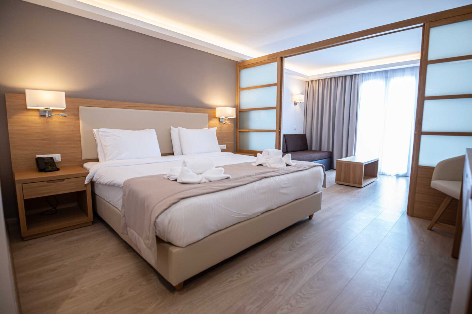 Perhehuone parvekkeella tai maaterassilla. Huone koostuu makuuhuoneesta ja olohuoneesta, jotka on erotettu toisistaan liukuovella. Parivuode. Lisävuodemahdollisuus kahteen vuodesohvaan. Maksuton wifi, ilmastointi ja tallelokero. Minibaari. Vedenkeitin. Tv kansainvälisillä kanavilla. Hiustenkuivain. Kylpyamme tai suihku ja wc. Siivous 7 krt/viikko.
