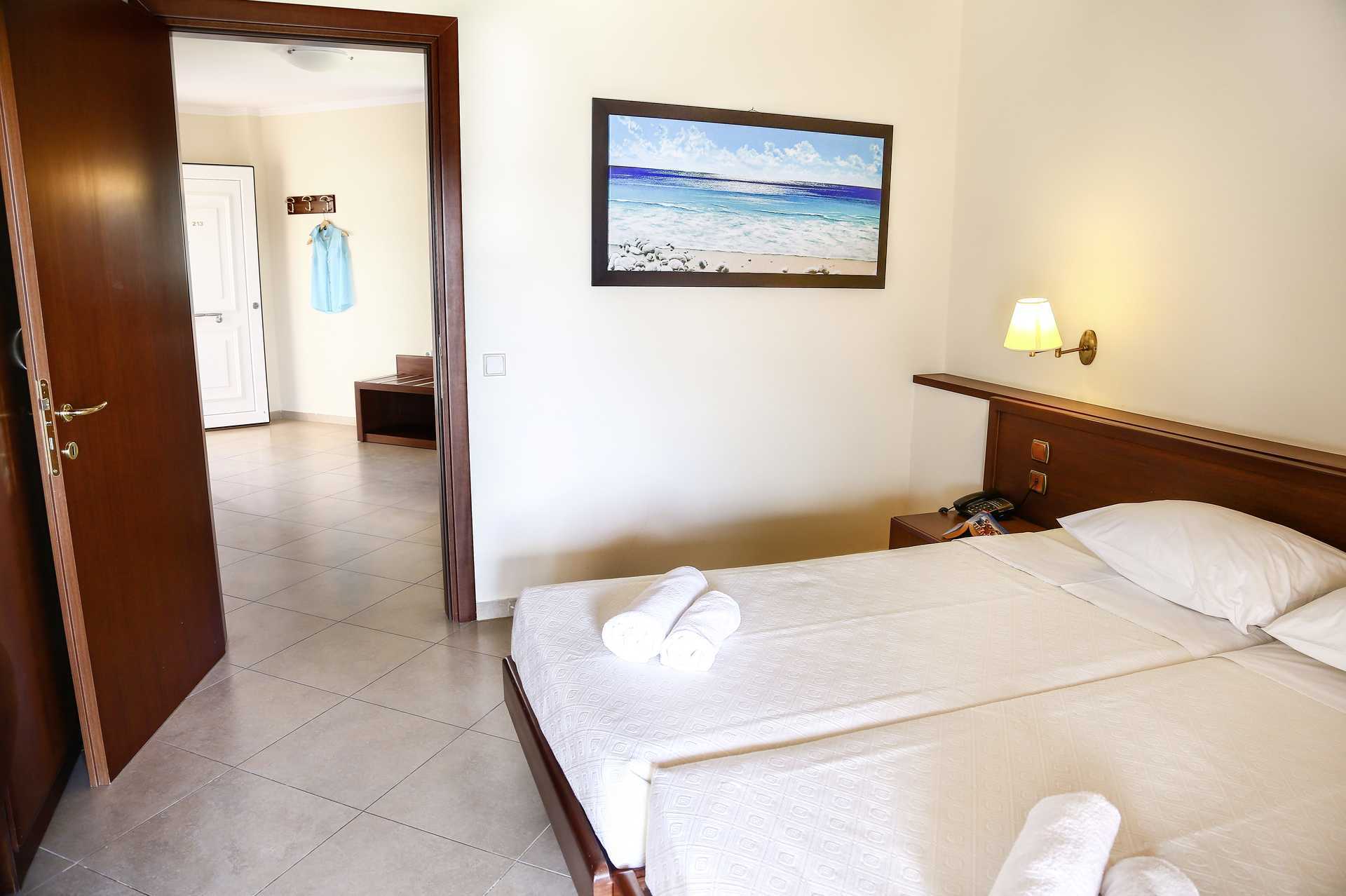 Kaksio parvekkeella tai terassilla. Makuuhuone sekä yhdistetty olohuone ja minikeittiö. Parivuode tai kaksi yhden hengen vuodetta. Lisävuodemahdollisuus vuodesohvasta. Minikeittiö, jossa jääkaappi, keittolevyt, jääkaappi, pieni uuni, kahvinkeitin, vedenkeitin ja yksinkertainen keittiövarustus. Maksuton wifi ja tallelokero. Ilmastointi lisämaksusta. Tv paikallisilla kanavilla. Hiustenkuivain. Kylpyhuoneessa suihku ja wc. Siivous 7 krt/viikko.
