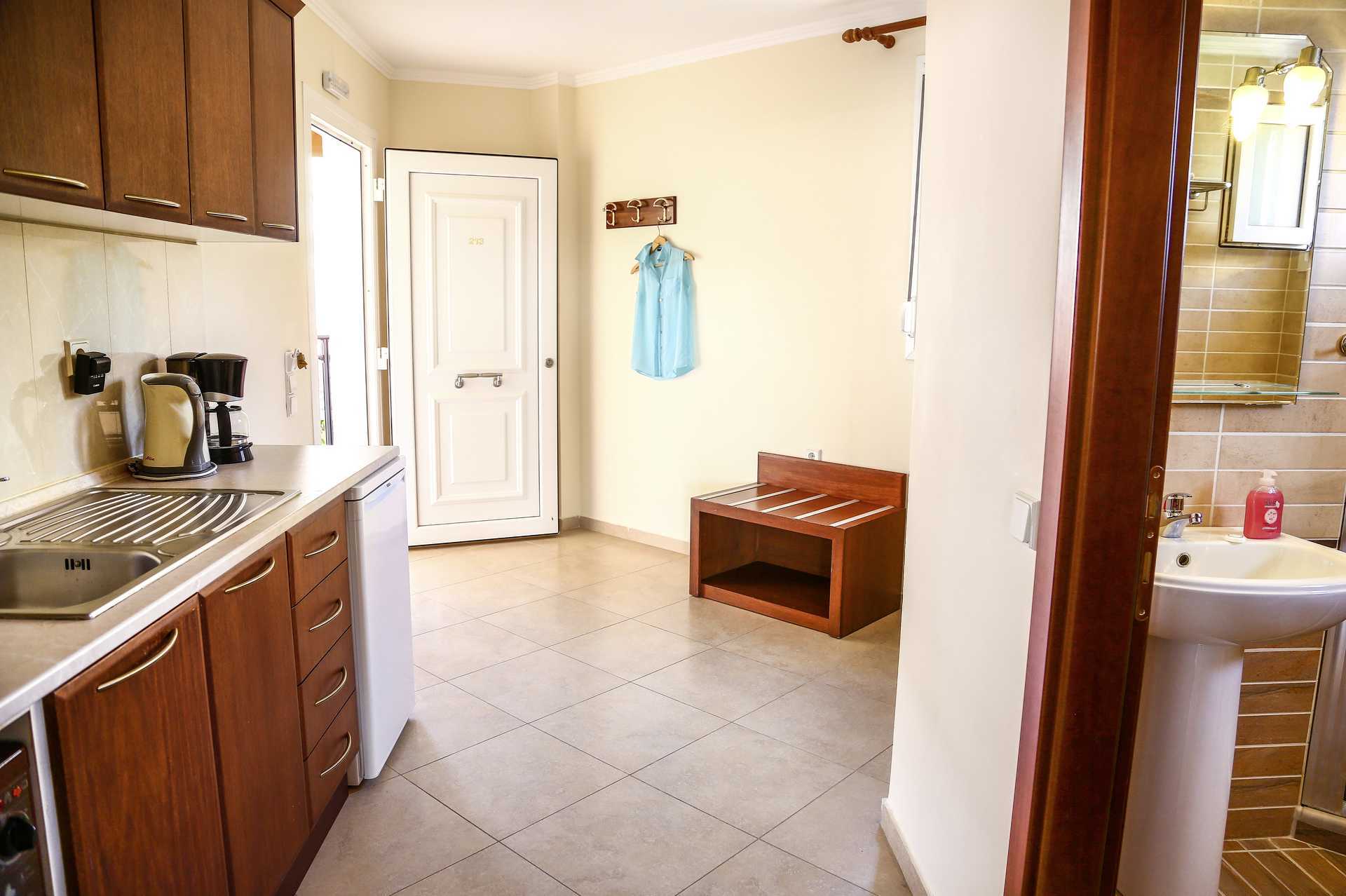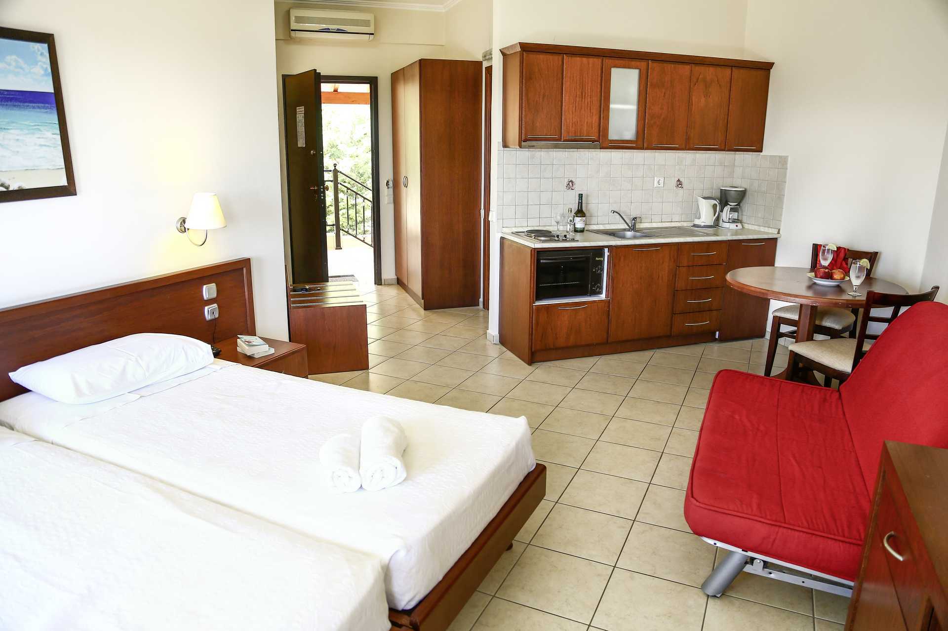 Yksiö parvekkeella tai terassilla. Yhdistetty makuuhuone ja minikeittiö. Kaksi yhden hengen vuodetta. Lisävuodemahdollisuus vuodesohvasta. Minikeittiö, jossa jääkaappi, keittolevyt, kahvinkeitin, vedenkeitin, pieni uuni ja yksinkertainen keittiövarustus. Maksuton wifi ja tallelokero. Ilmastointi lisämaksusta. Tv paikallisilla kanavilla. Hiustenkuivain. Kylpyhuoneessa suihku ja wc. Siivous 7 krt/viikko.