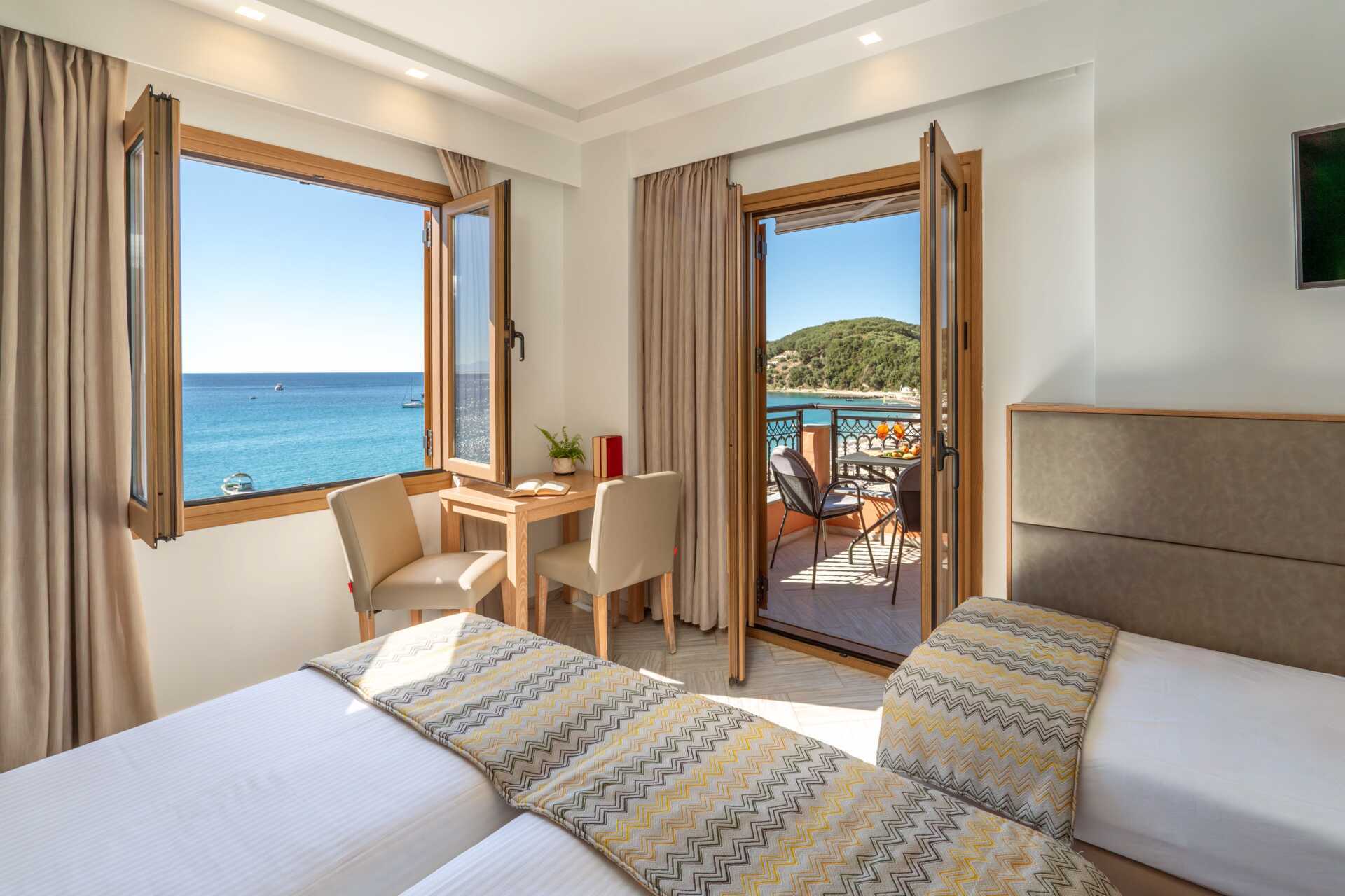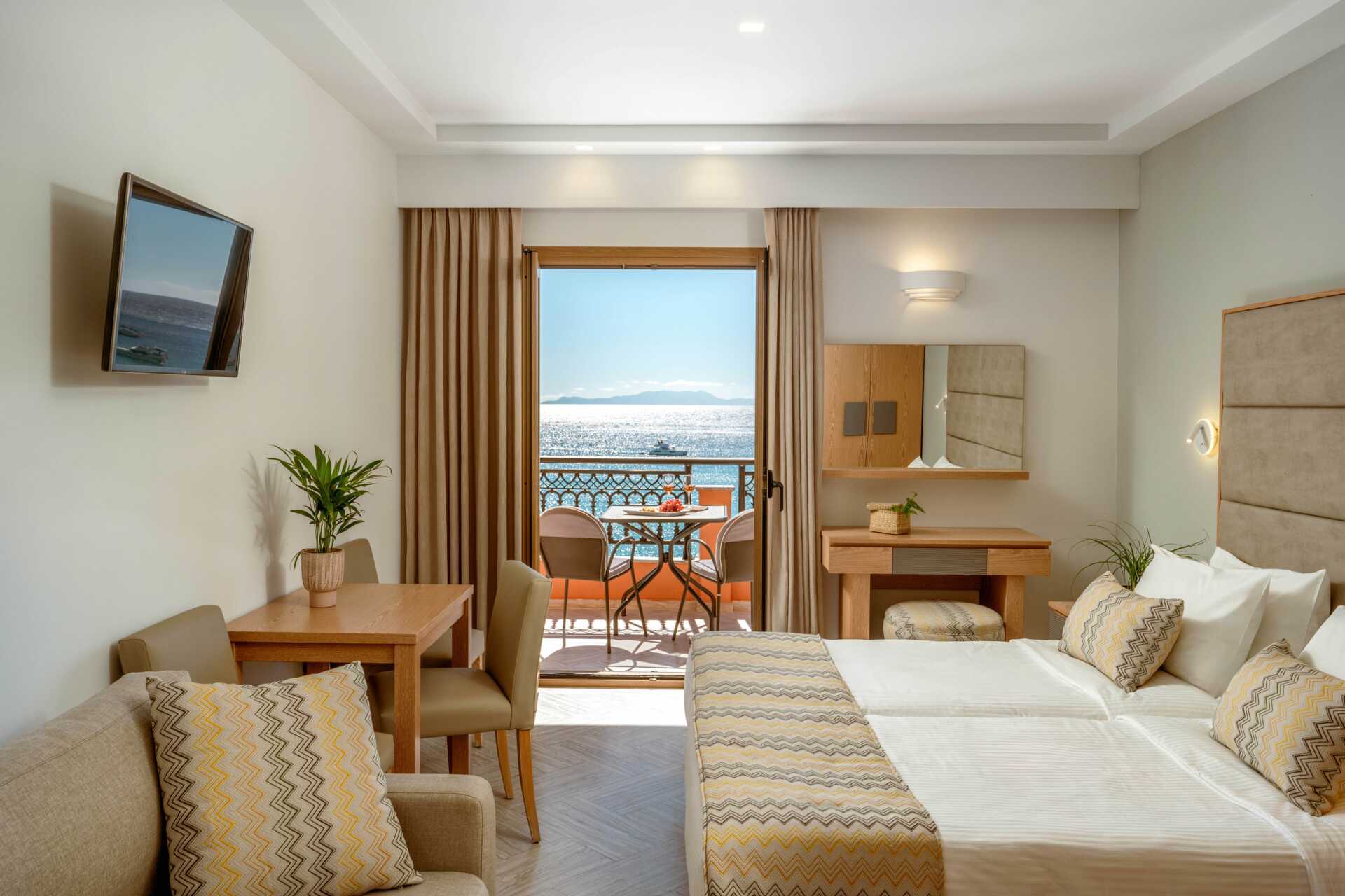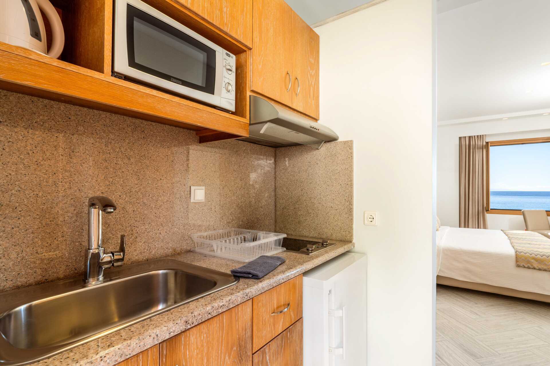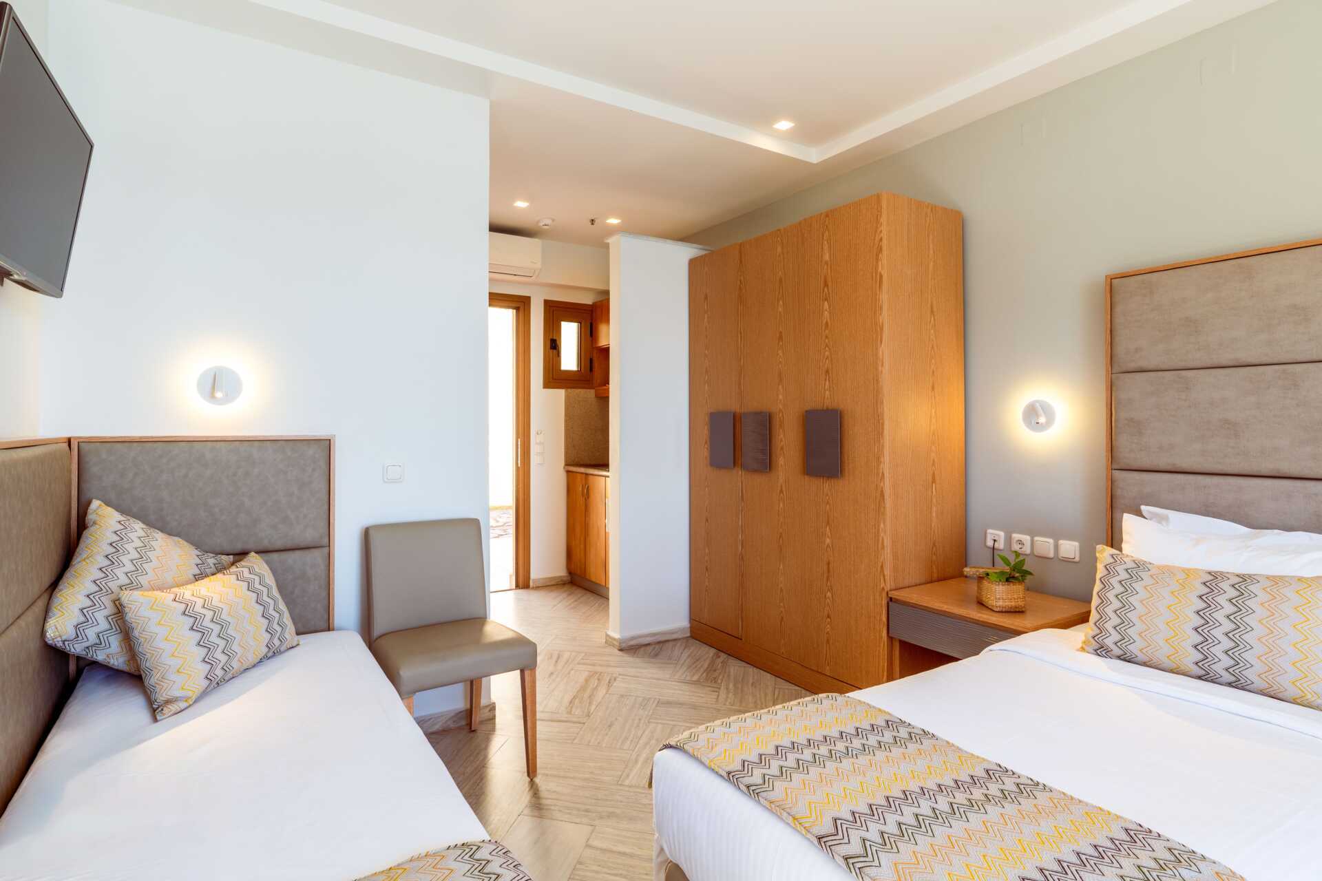 Yksiö parvekkeella ja merinäköalalla. Koot vaihtelevat ja moderni sisustus. Yhdistetty makuuhuone ja minikeittiö. Kaksi yhden hengen sänkyä. Lisävuodemahdollisuus vuodesohvalla. Minikeittiö, jossa keittolevyt, jääkaappi, kahvinkeitin, vedenkeitin, leivänpaahdin, mikro ja yksinkertainen keittiövarustus. Maksuton wifi ja ilmastointi. Tallelokero lisämaksusta. Tv kansainvälisillä kanavilla. Hiustenkuivain. Kylpyhuoneessa suihku ja wc. Siivous 6 krt/viikko.