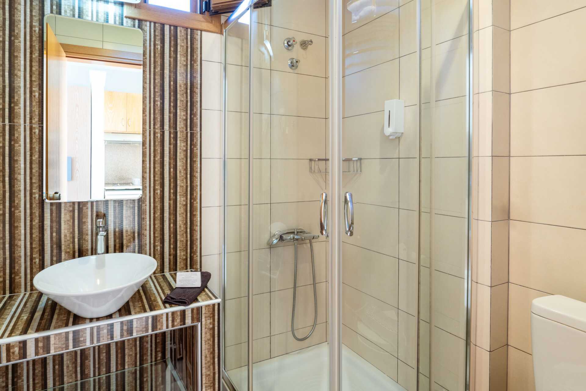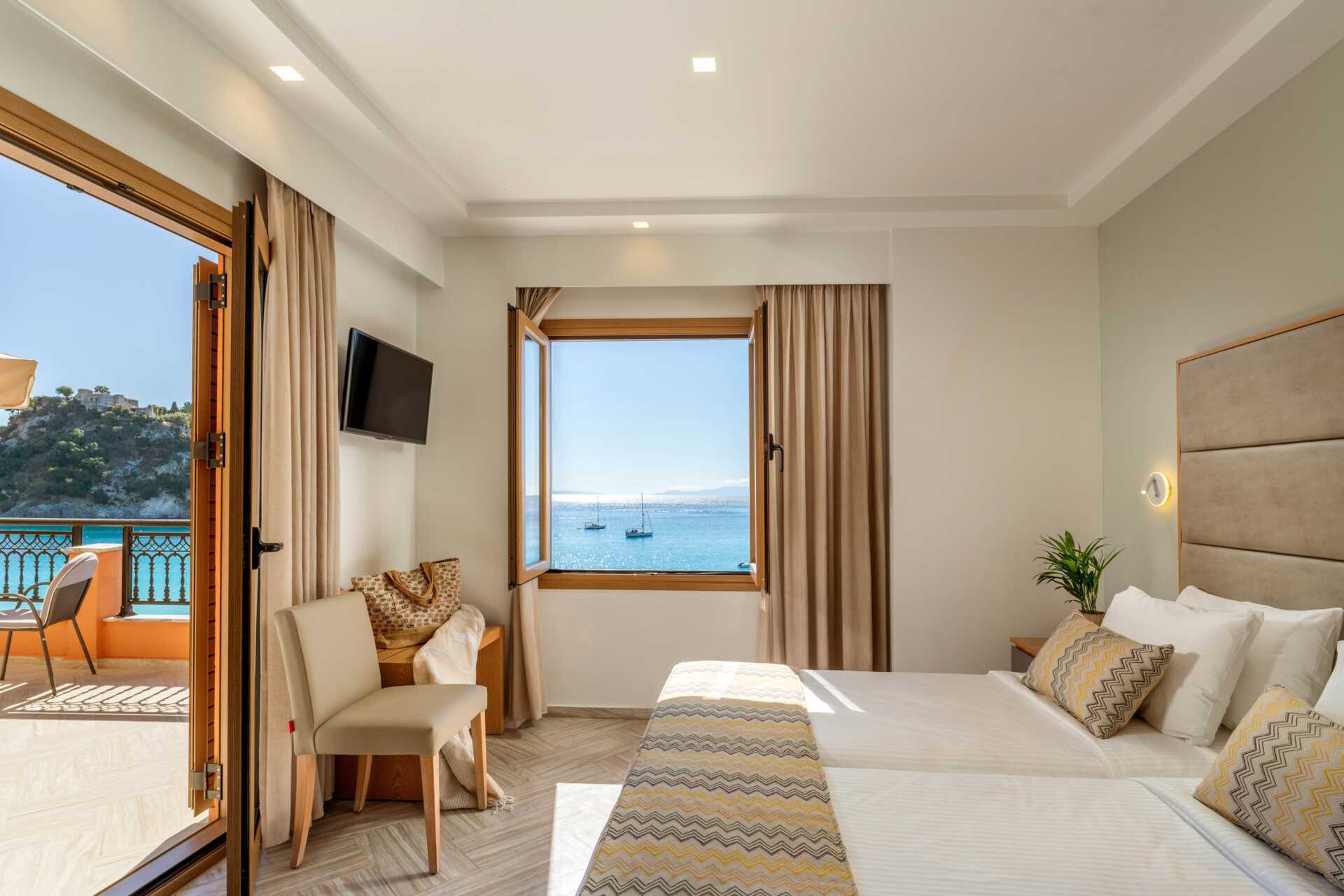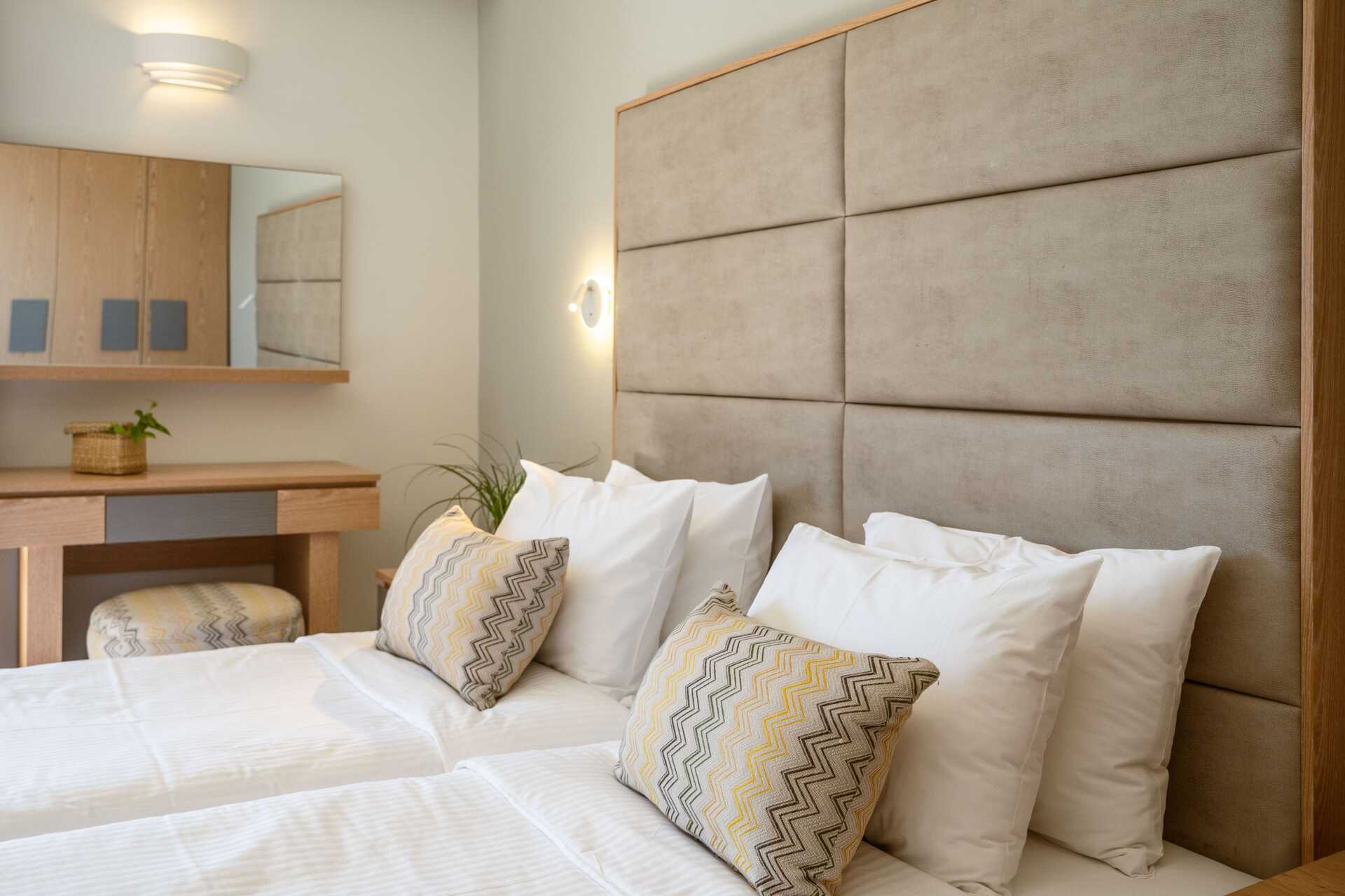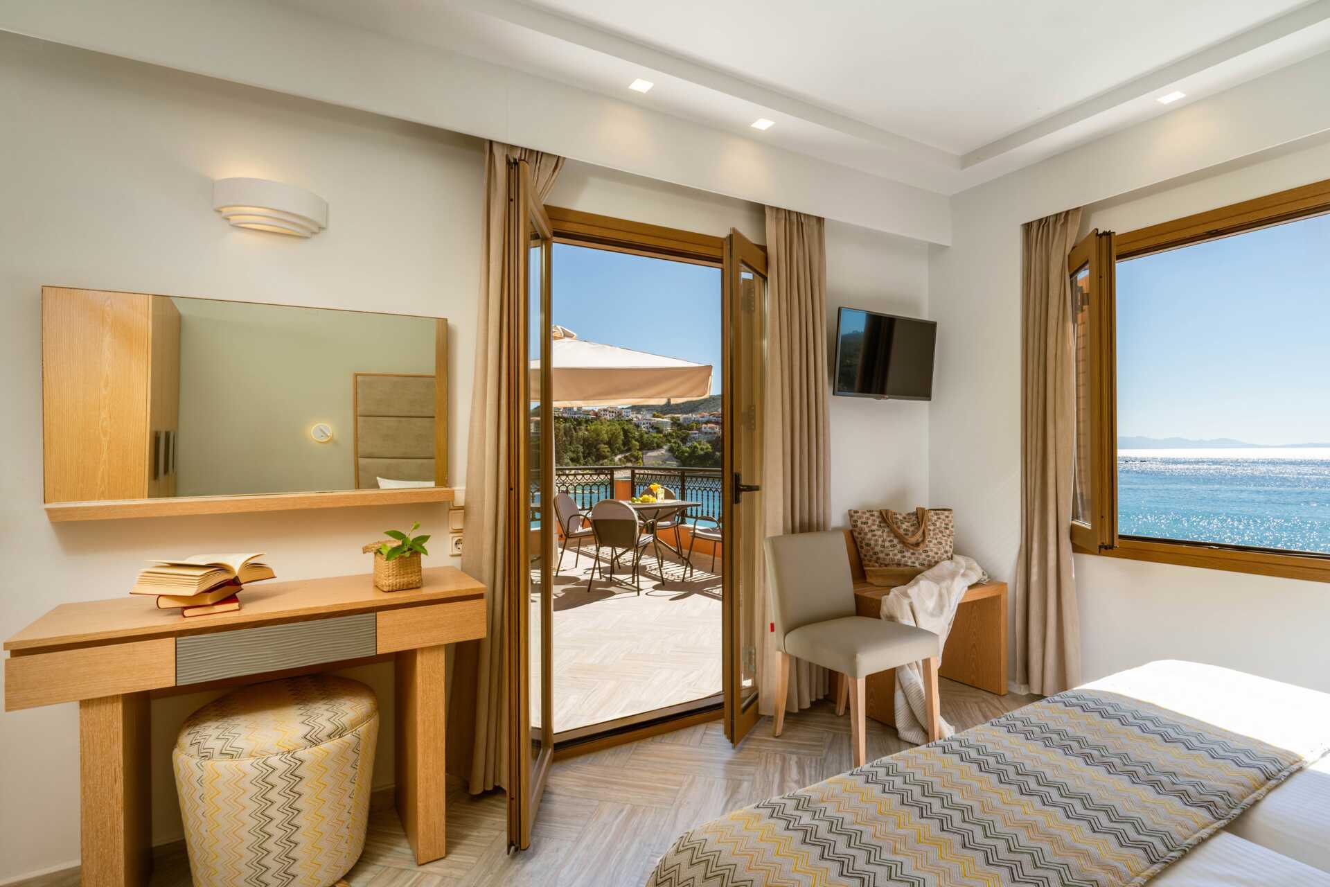 Yksiö parvekkeella ja merinäköalalla. Koot vaihtelevat ja moderni sisustus. Yhdistetty makuuhuone ja minikeittiö. Kaksi yhden hengen sänkyä. Lisävuodemahdollisuus vuodesohvalla. Minikeittiö, jossa keittolevyt, jääkaappi, kahvinkeitin, vedenkeitin, leivänpaahdin, mikro ja yksinkertainen keittiövarustus. Maksuton wifi ja ilmastointi. Tallelokero lisämaksusta. Tv kansainvälisillä kanavilla. Hiustenkuivain. Kylpyhuoneessa suihku ja wc. Siivous 6 krt/viikko.