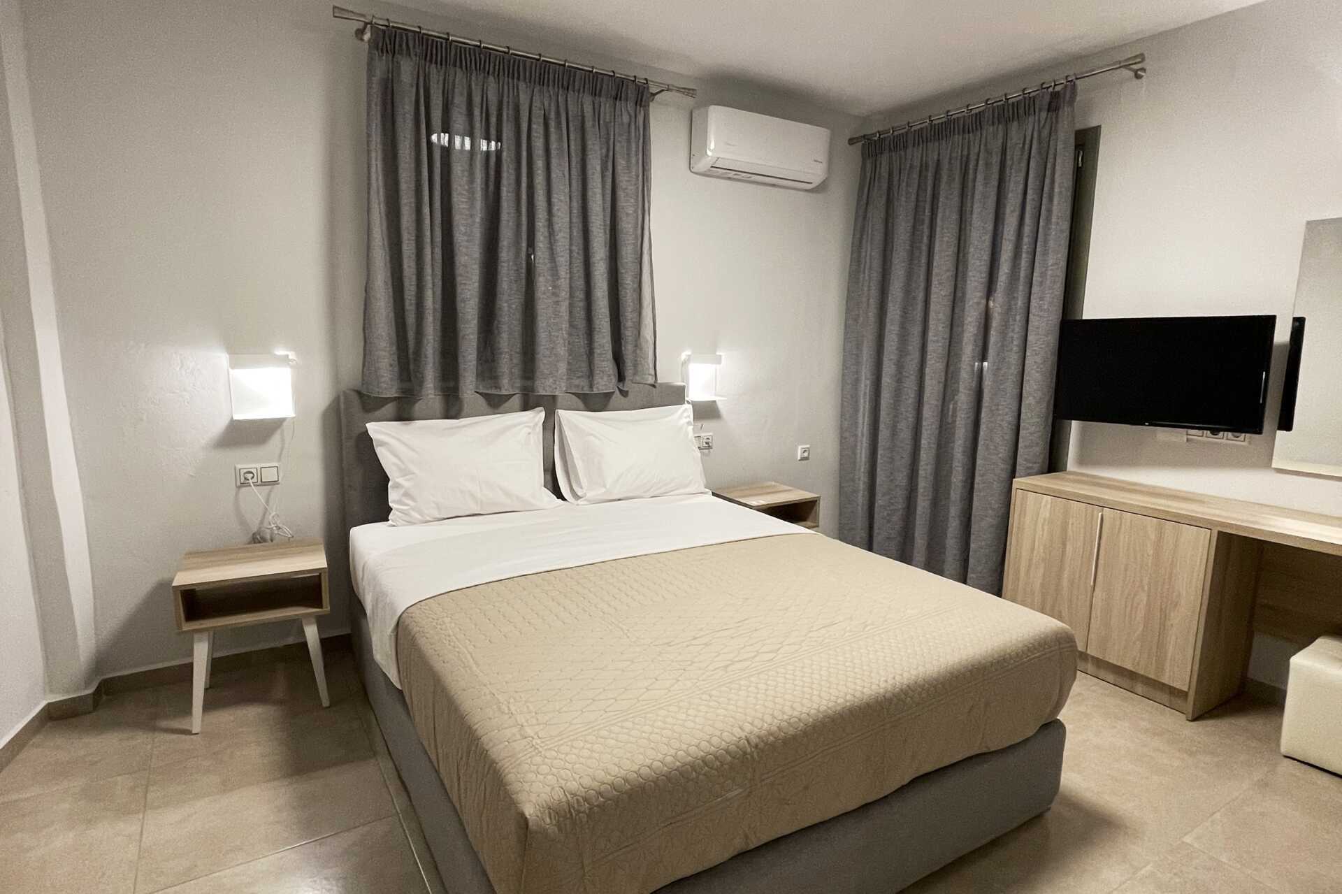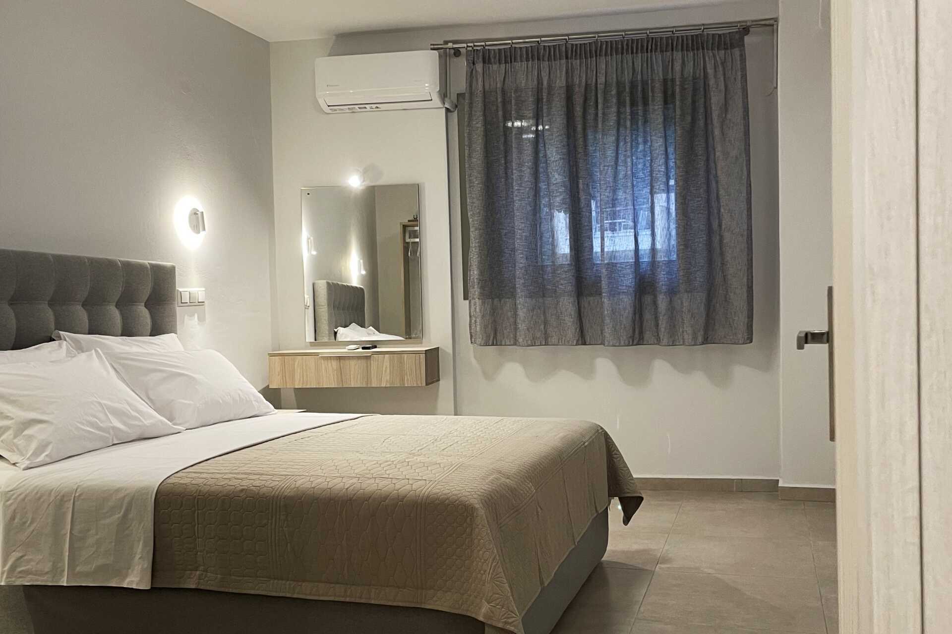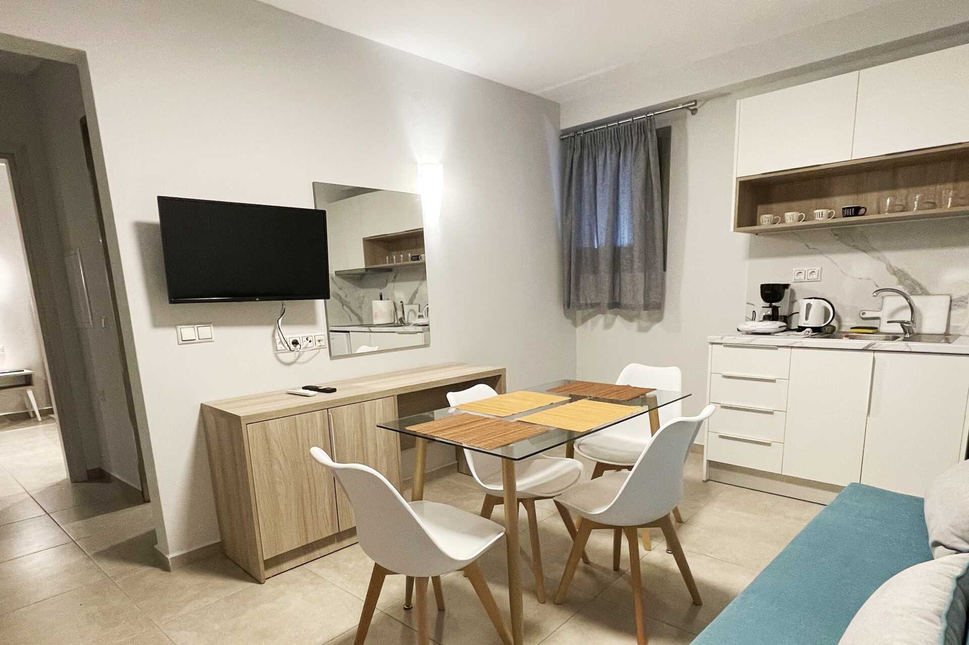 Kaksio terassilla tai parvekkeella. Makuuhuone sekä yhdistetty olohuone ja minikeittiö. Parivuode. Lisävuodemahdollisuus vuodesohvasta. Minikeittiössä keittolevyt, jääkaappi, kahvinkeitin, vedenkeitin, voileipägrilli ja yksinkertainen keittiövarustus.. Maksuton wifi ja tallelokero. Ilmastointi lisämaksusta. Tv kansainvälisillä kanavilla. Hiustenkuivain. Kylpyhuoneessa suihku ja wc. Siivous 6 krt/viikko. Alle 2-vuotiaat lapset lasketaan lisävuoteella majoittuviksi henkilöiksi.