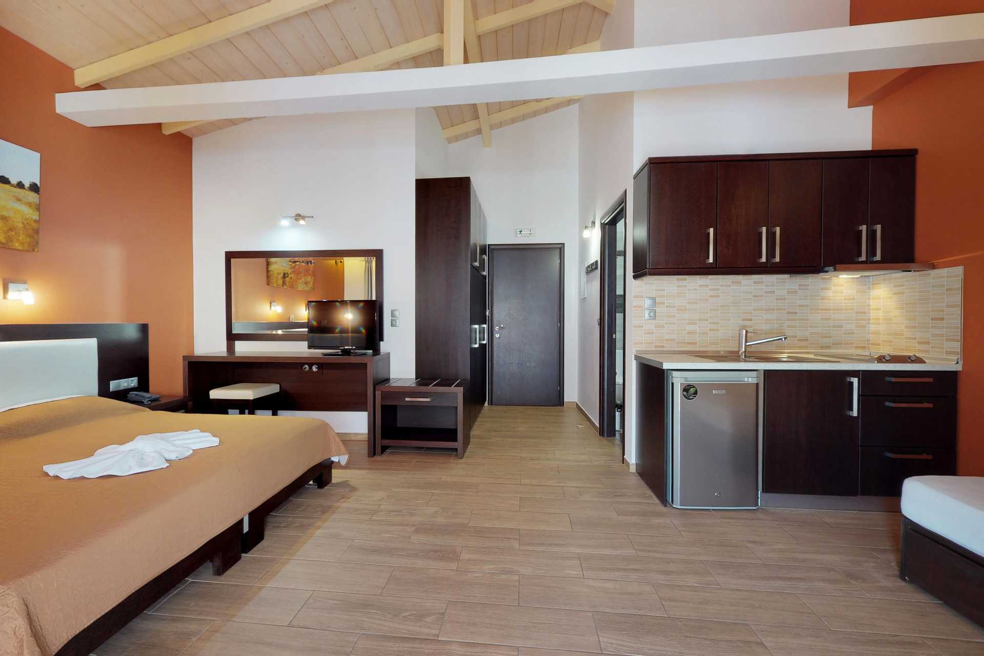 Deluxe-yksiö, jossa on parveke tai suuri parveke merinäköalalla. Yhdistetty makuuhuone ja minikeittiö. Parivuode. Lisävuodemahdollisuus vuodesohvasta. Minikeittiö, jossa jääkaappi, liesi, vedenkeitin ja yksinkertaiset keittiövälineet. Maksuton wifi, ilmastointi ja tallelokero. Tv kansainvälisillä kanavilla. Hiustenkuivain. Suihku ja wc. Siivous 7 krt/viikko.