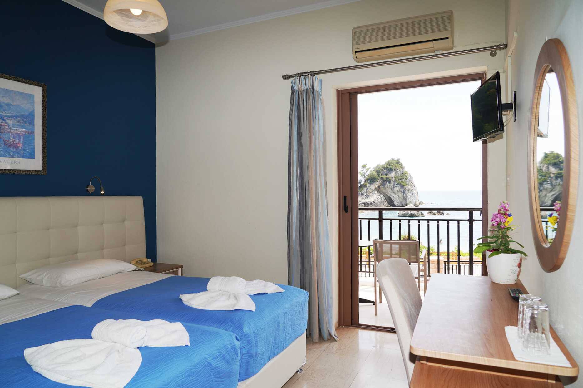 Deluxe-huone parvekkeella ja merinäköalalla. Parivuode tai kaksi yhden hengen sänkyä. Lisävuodemahdollisuus vuodesohvasta. Maksuton wifi, ilmastointi ja tallelokero. Jääkaappi. Tv kansainvälisillä kanavilla. Hiustenkuivain. Kylpyhuoneessa suihku ja wc. Siivous 7 krt/viikko.