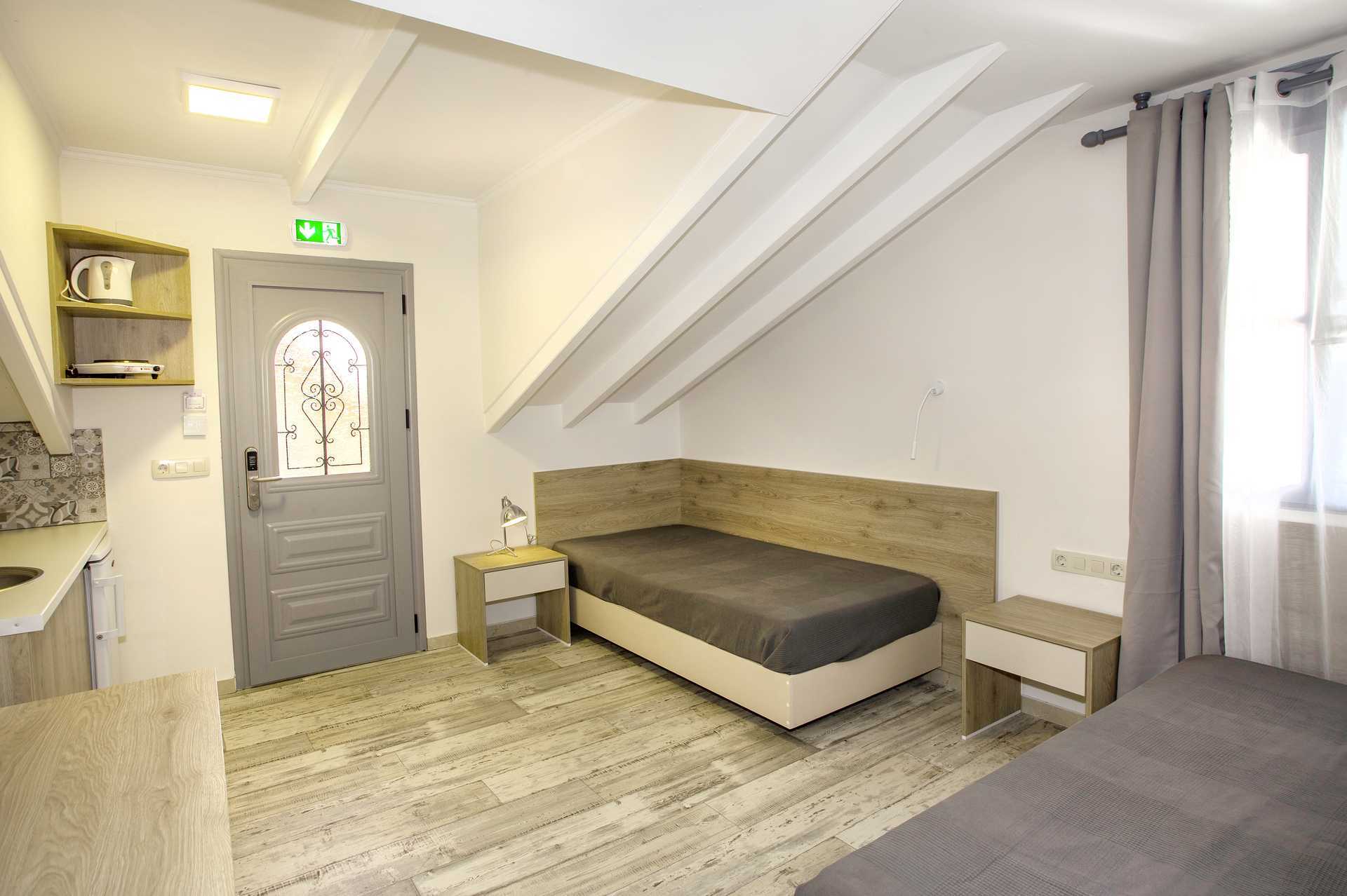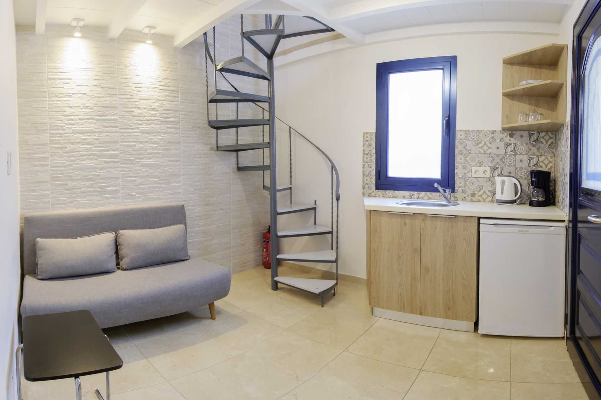 Valoisia kaksikerroksisia yksiöitä, jotka sijaitsevat sivurakennuksen ensimmäisessä kerroksessa. Makuuhuone yläkerrassa, jossa parivuode tai erilliset vuoteet. Portaat ovat kapeat. Alakerrassa keittiö ja kylpyhuone. Jääkaappi, keittolevy, vedenkeitin sekä yksinkertainen keittiövarustelu. Tv kansainvälisillä kanavilla. Maksuton wifi, ilmastointi ja tallelokero. Hiustenkuivain. Suihku ja wc. Maaterassi tai jaettu ulkotila. Siivous 7 krt/viikko.