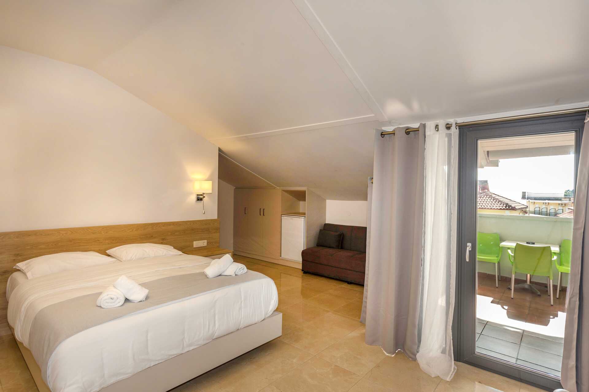 Kaksio parvekkeella ja allasnäköalalla. Huoneistot sijaitsevat sivurakennuksen ylimmässä kerroksessa ja niissä on viistokatot. Makuuhuone sekä yhdistetty olohuone ja minikeittiö. Kaksi yhden hengen sänkyä. Lisävuodemahdollisuus parivuoteeseen. Minikeittiö, jossa jääkaappi, liesi, leivänpaahdin, vedenkeitin ja peruskeittiövälineet. Maksuton wifi, ilmastointi ja tallelokero. Tv kansainvälisillä kanavilla. Hiustenkuivain. Kylpyhuoneessa suihku ja wc. Siivous 7 krt/viikko.
