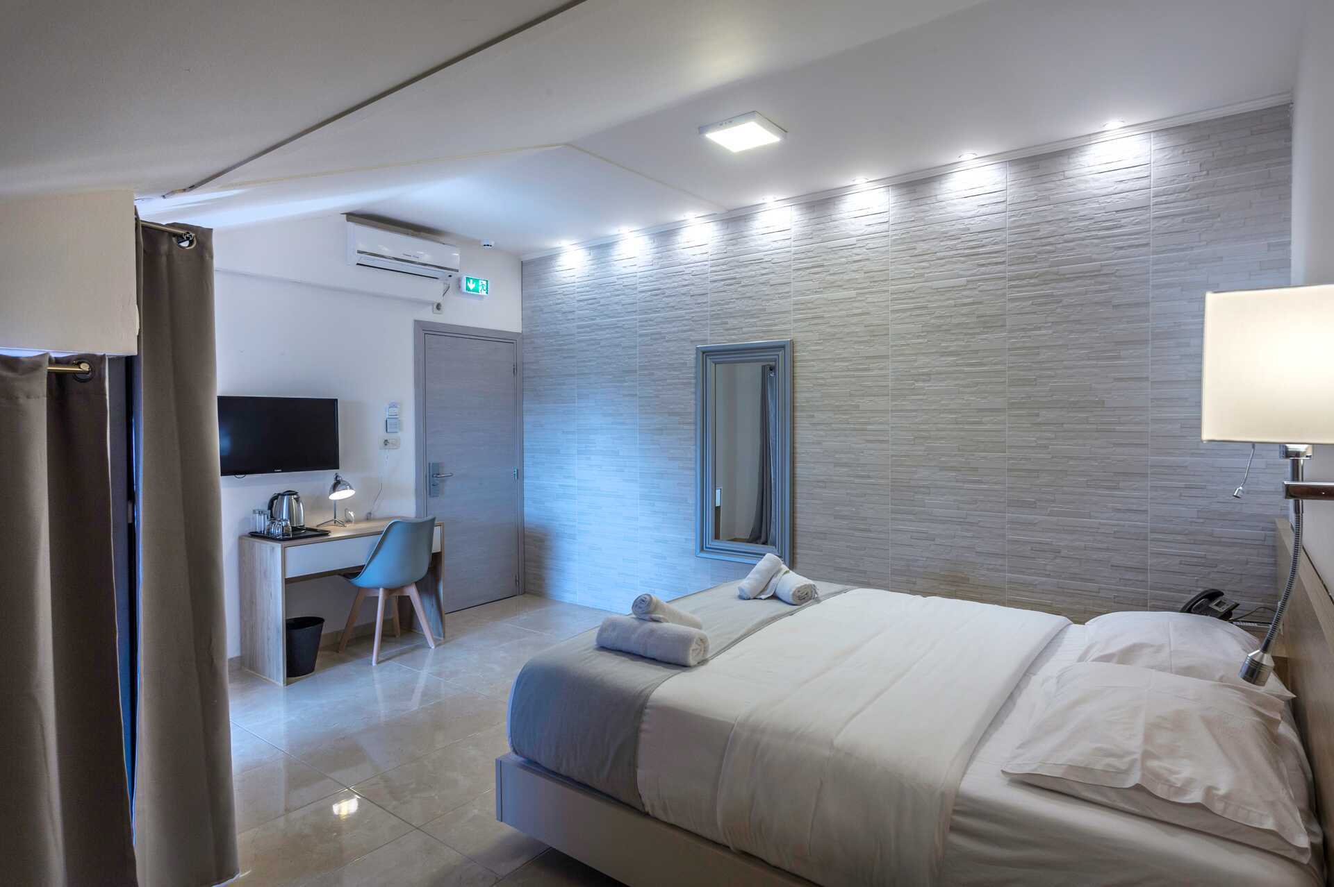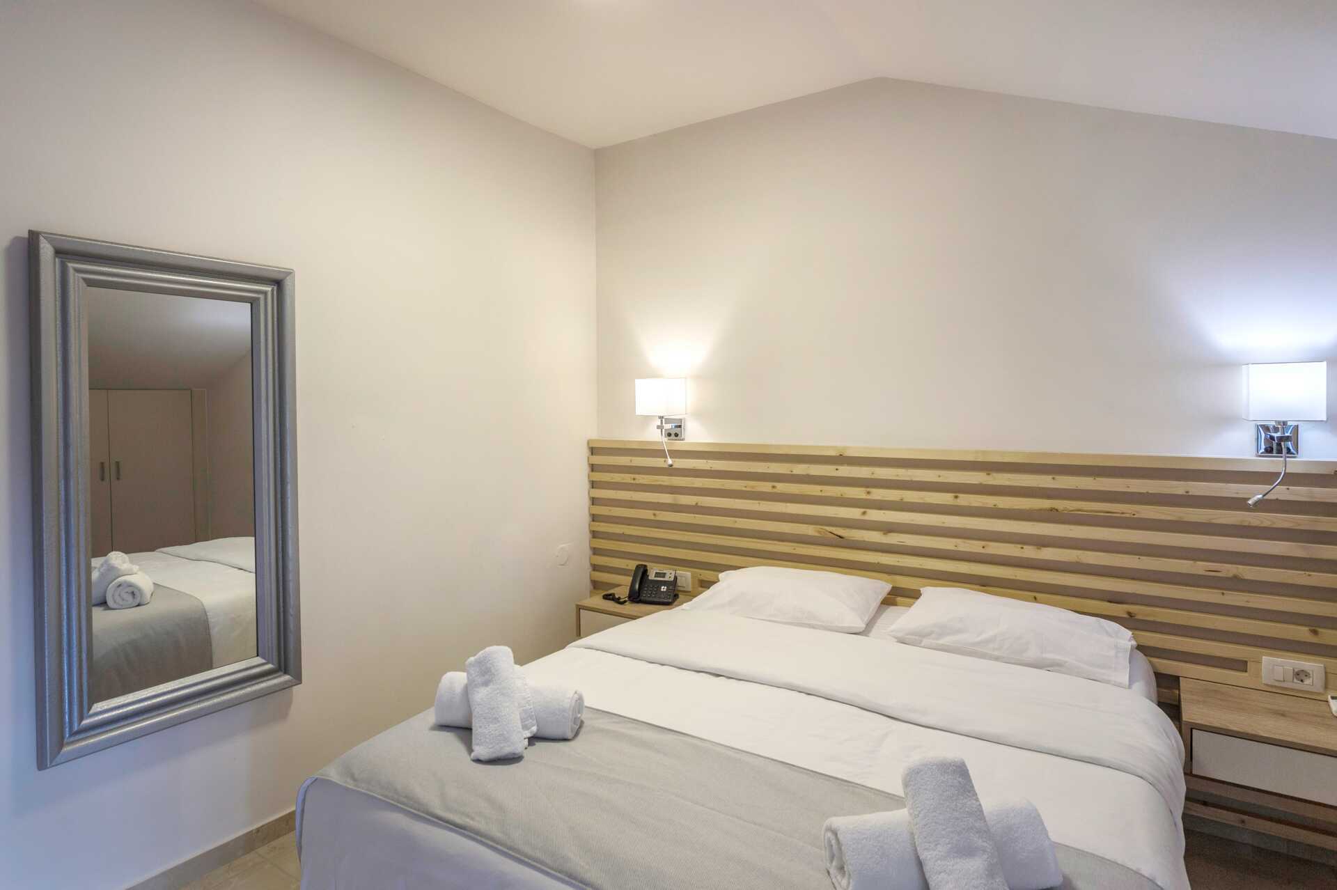 Suurehko kahden hengen huone jossa sisäänvedetty parveke korkealla seinällä. Huoneet sijaitsevat päärakennuksen ylemmissä kerroksissa. Parivuode. Lisävuodemahdollisuus vuodesohvasta. Maksuton wifi, ilmastointi ja tallelokero. Jääkaappi. Tv kansainvälisillä kanavilla. Hiustenkuivain. Kylpyhuoneessa suihku ja wc. Siivous 7 krt/viikko.