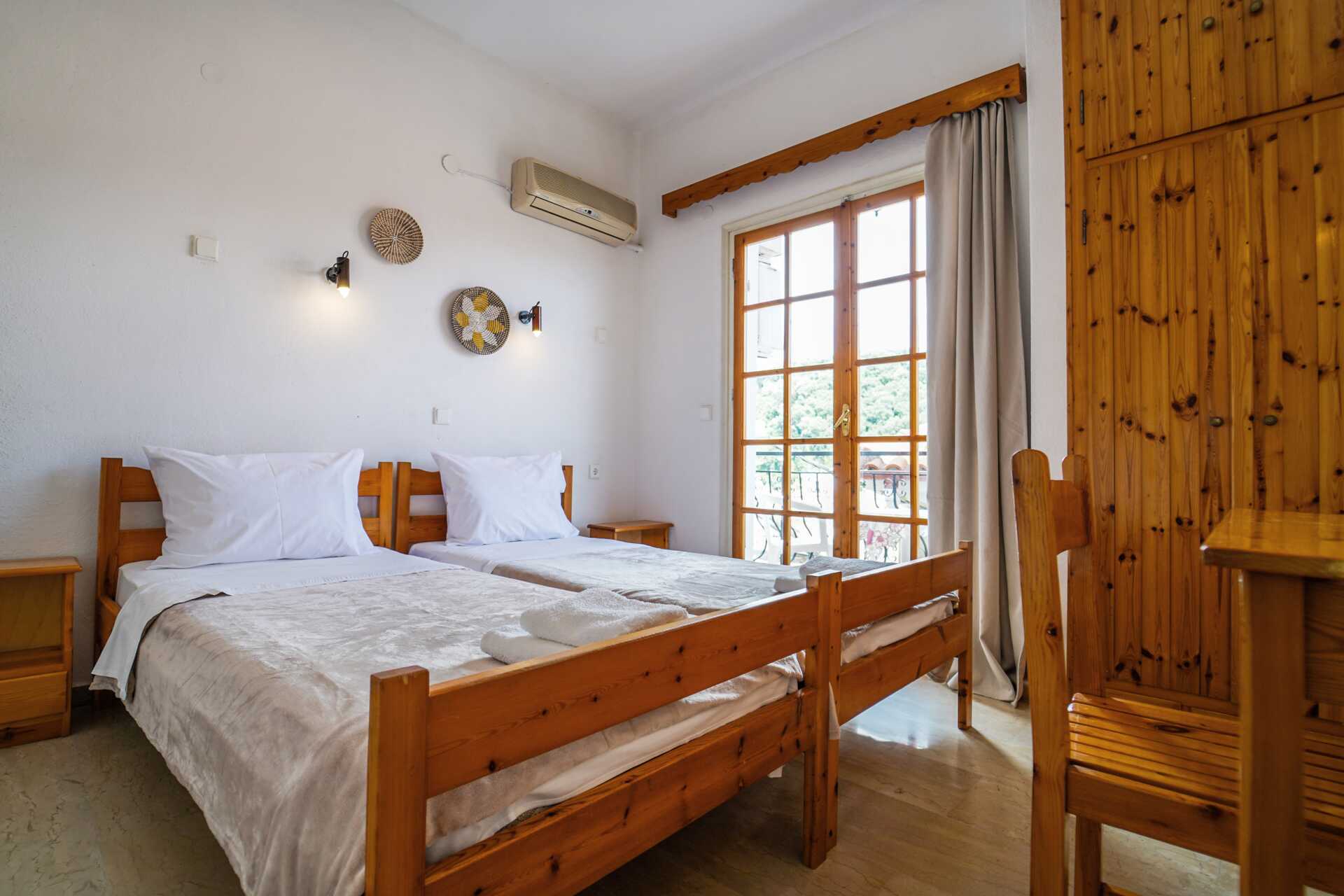 Kahden hengen huone parvekkeella tai maaterassilla. Jotkut parvekkeet ovat kapeita, noin 40–50 cm leveitä, ja tilaa on kahdelle jakkaralle ja pienelle pöydälle. Parivuode tai kaksi yhden hengen sänkyä. Lisävuodemahdollisuus yhden hengen sängystä. Maksuton wifi ja ilmastointi. Jääkaappi. Suihku ja wc. Siivous 7 krt/viikko. Alle 2-vuotiaat lapset lasketaan lisävuoteella majoittuviksi henkilöiksi.