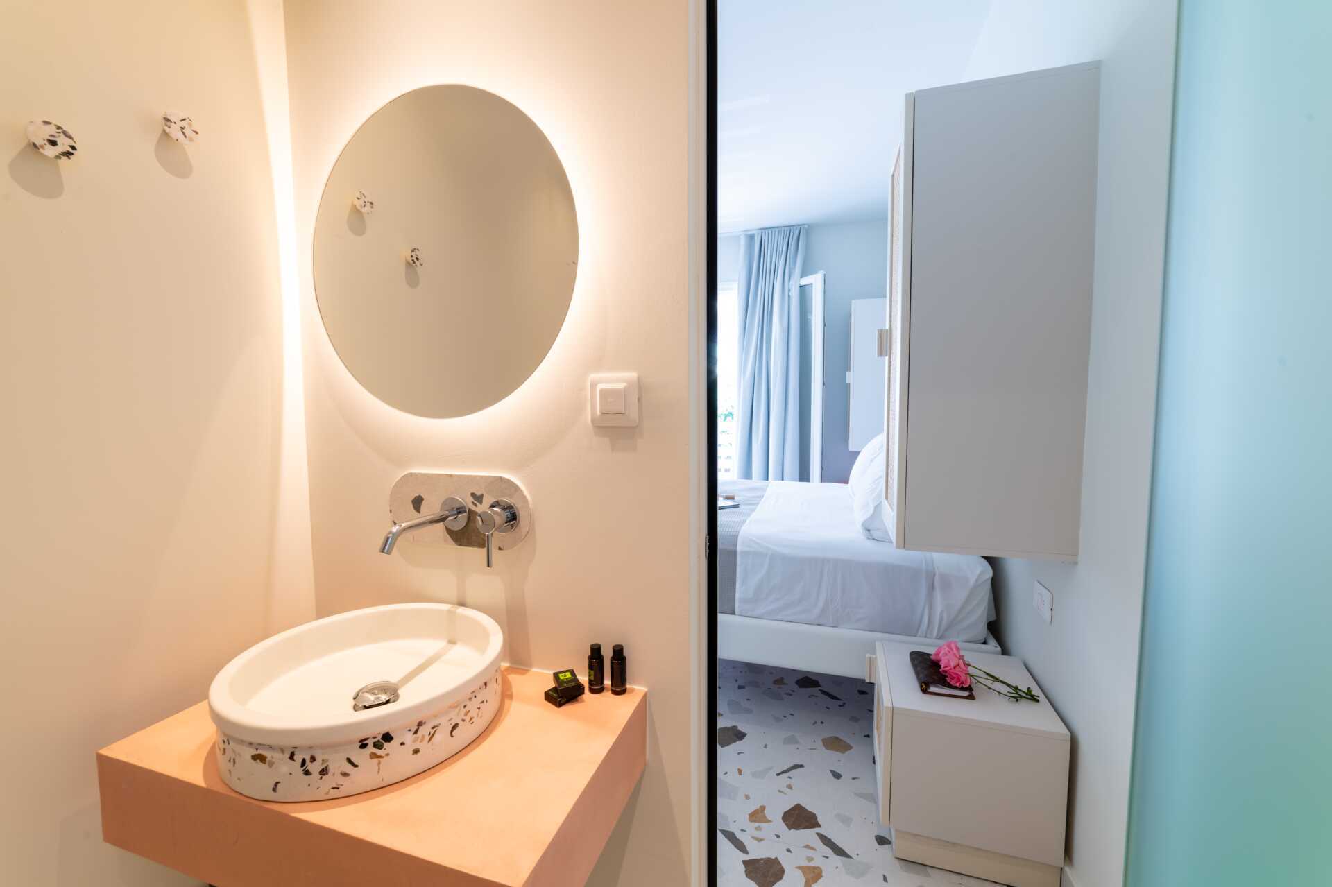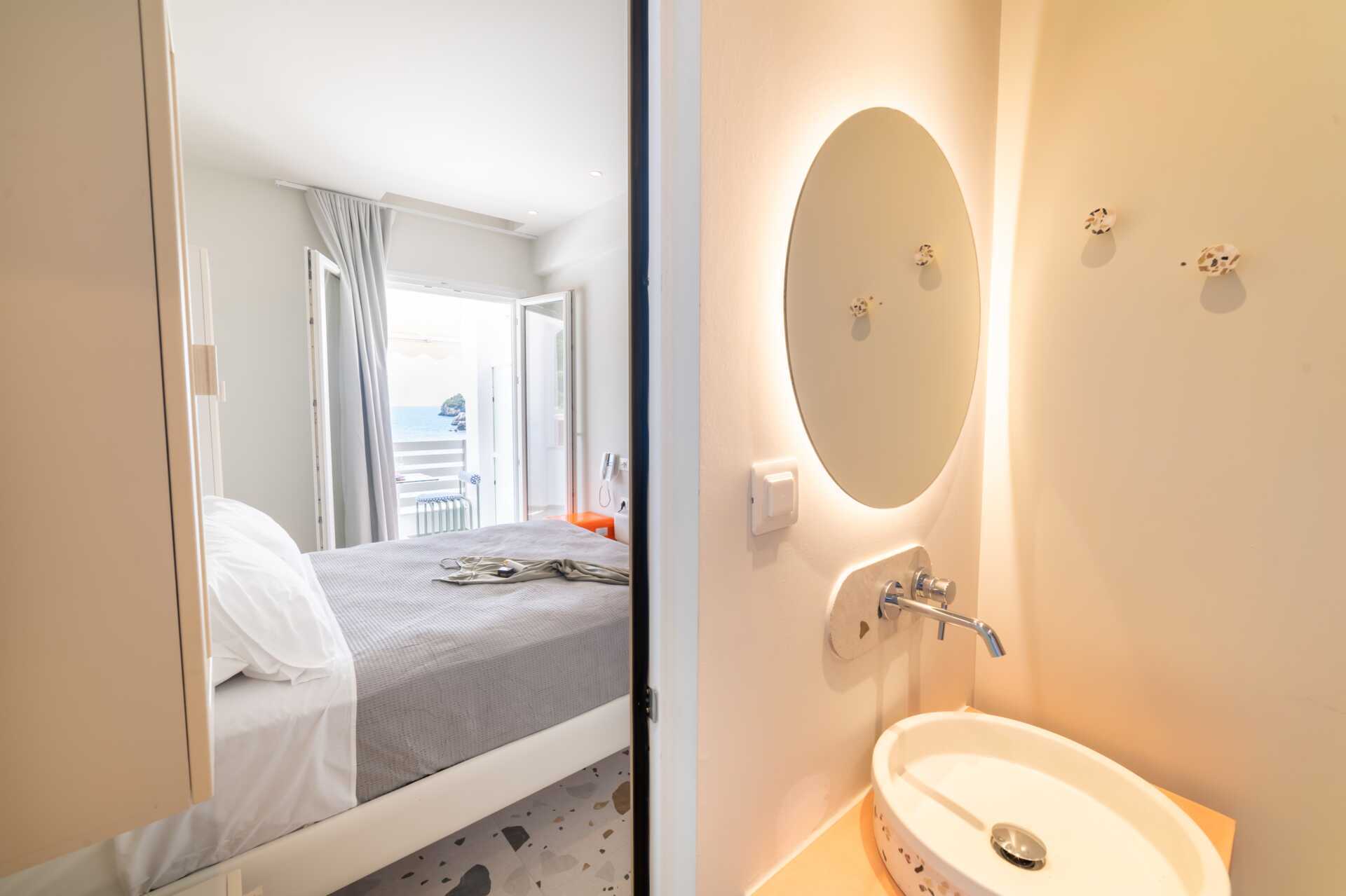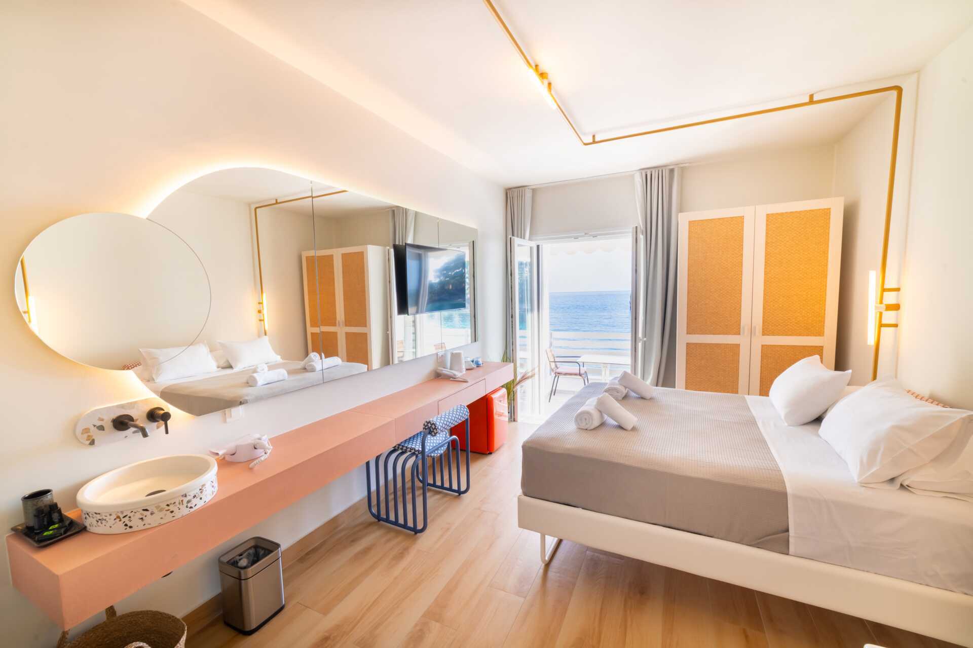 Deluxe-huone parvekkeella, jossa merinäköala tai rajoitettu merinäköala. Vaihtoehtoisesti Deluxe-huone maaterassilla näkymällä uima-altaalle. Parivuode. Maksuton wifi, ilmastointi ja tallelokero. Pieni jääkaappi. Vedenkeitin. Tv kansainvälisillä kanavilla. Hiustenkuivain. Kylpytakit ja tossut. Suihku ja wc. Siivous 7 krt/viikko.