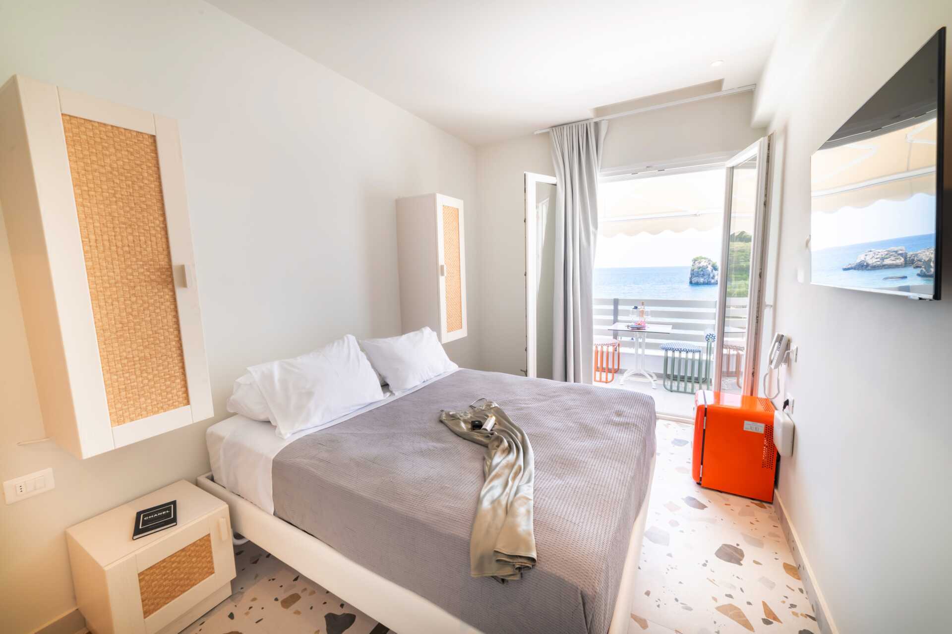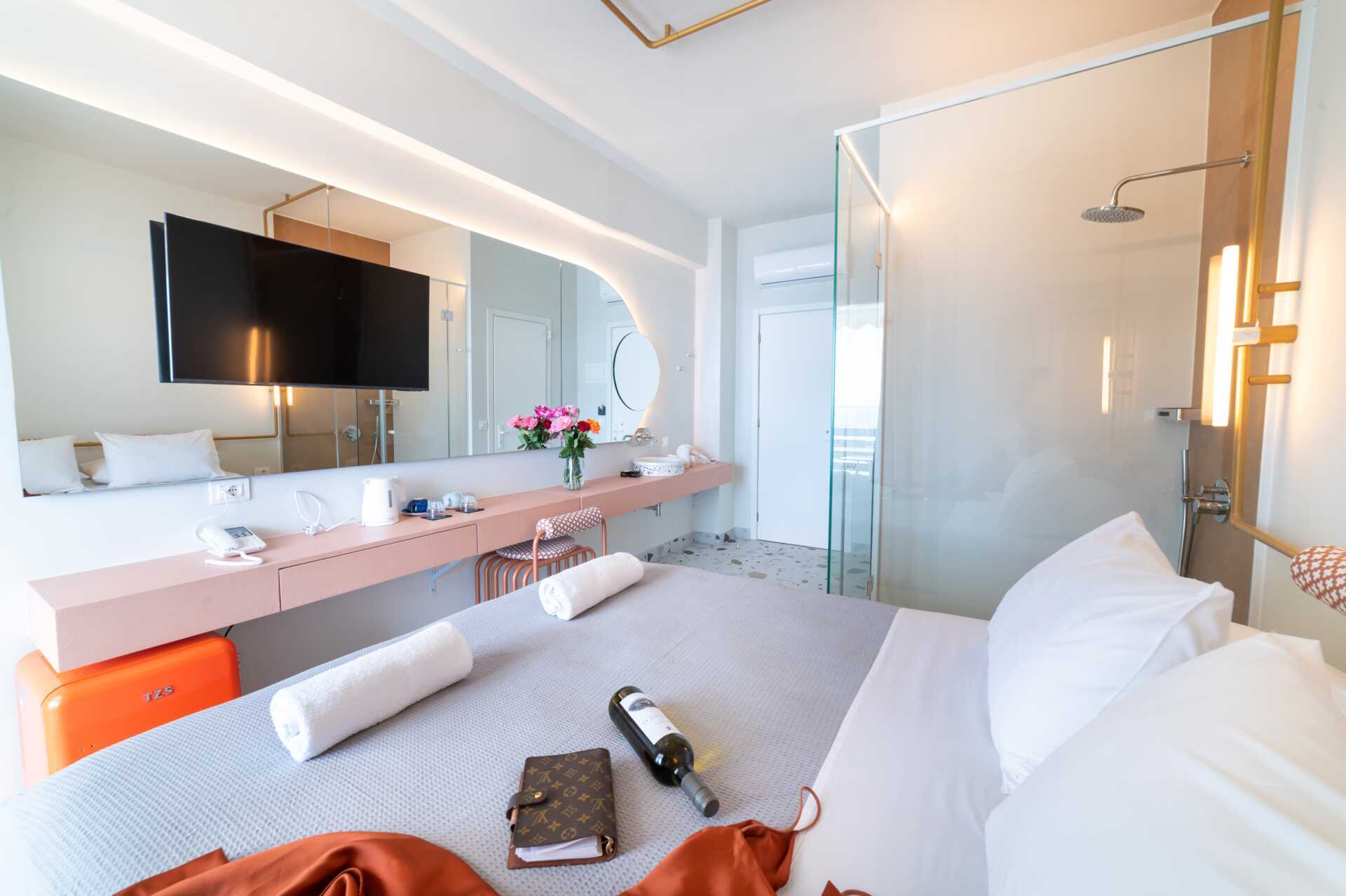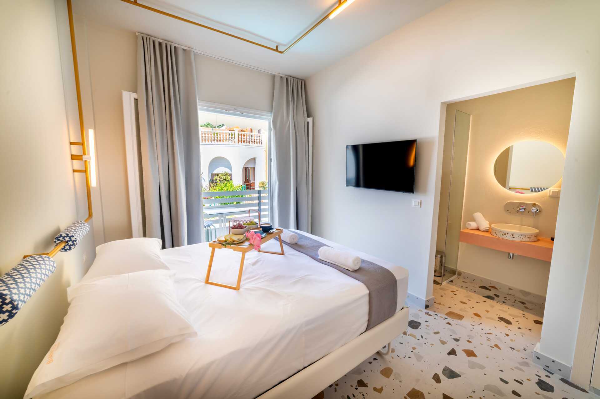 Juniorsviitti parvekkeella ja merinäköalalla. Parivuode. Maksuton wifi, ilmastointi ja tallelokero. Pieni jääkaappi. Vedenkeitin. Tv kansainvälisillä kanavilla. Hiustenkuivain. Kylpytakit ja tossut. Kylpyhuoneessa kylpyamme, suihku ja wc. Siivous 7 krt/viikko.