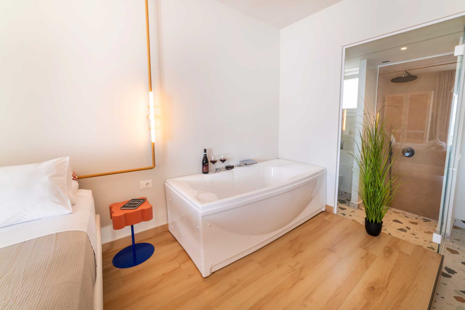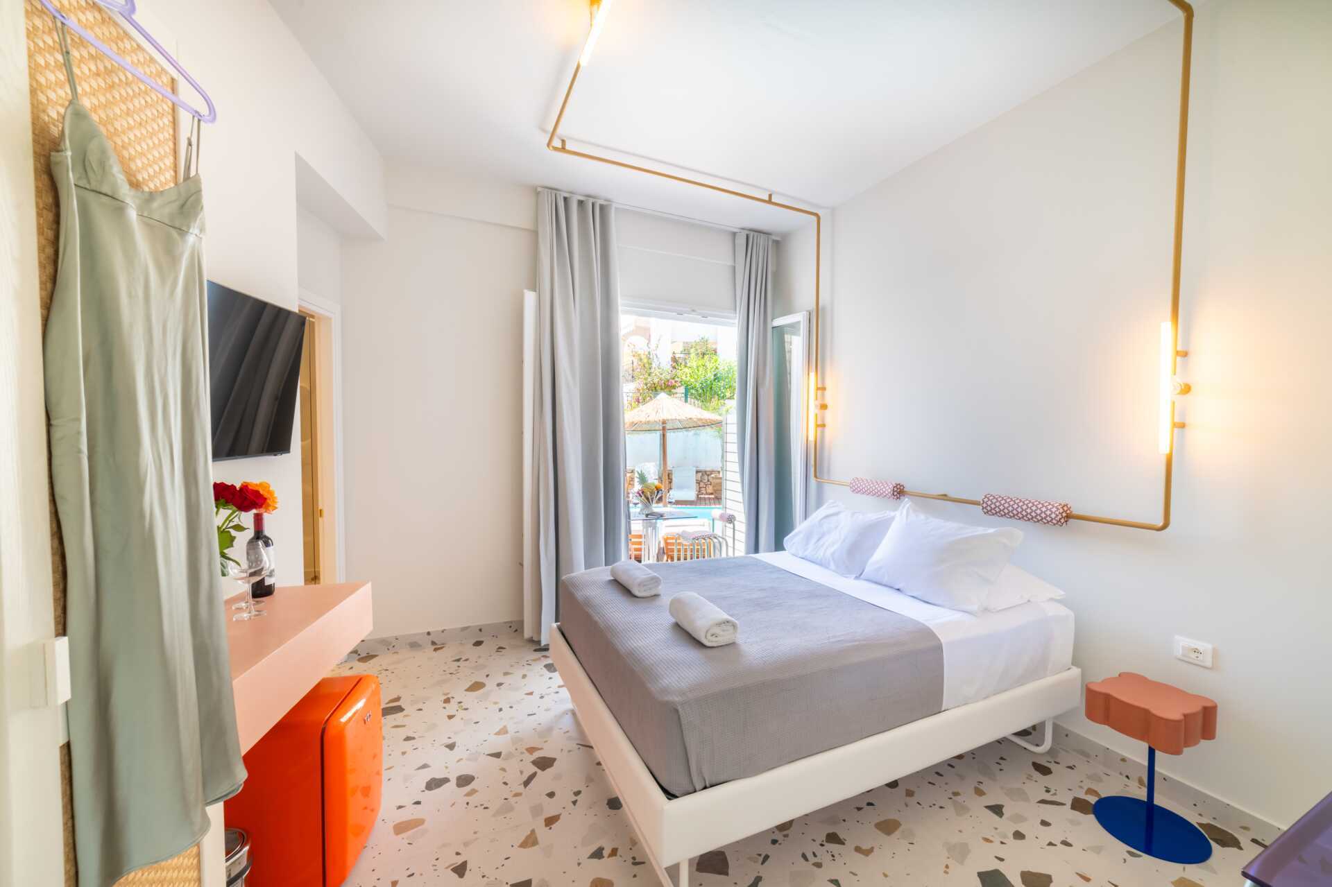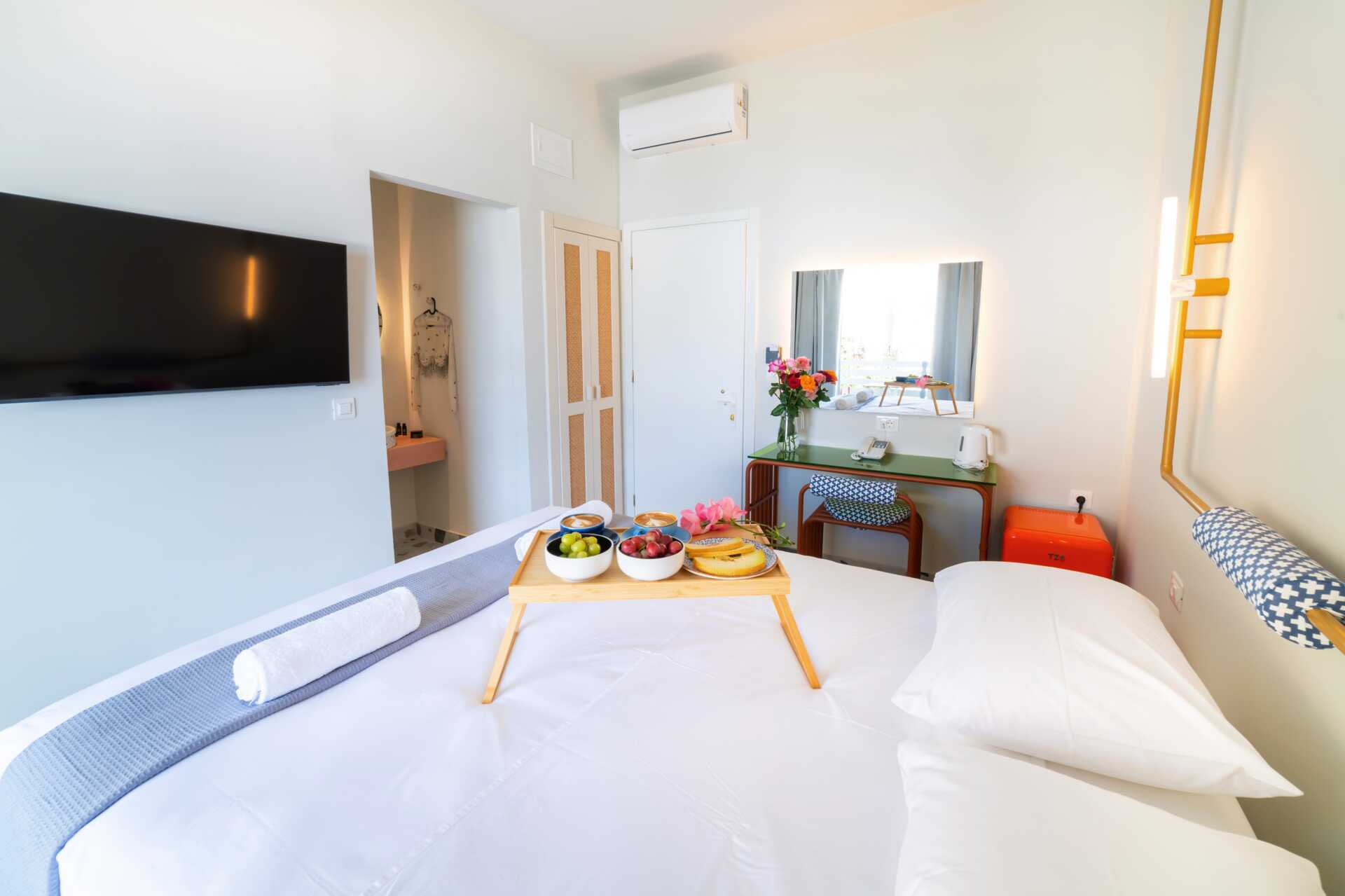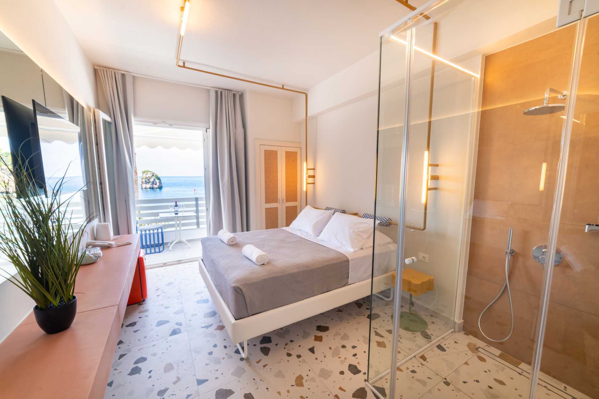 Juniorsviitti parvekkeella ja merinäköalalla. Parivuode. Maksuton wifi, ilmastointi ja tallelokero. Pieni jääkaappi. Vedenkeitin. Tv kansainvälisillä kanavilla. Hiustenkuivain. Kylpytakit ja tossut. Kylpyhuoneessa kylpyamme, suihku ja wc. Siivous 7 krt/viikko.