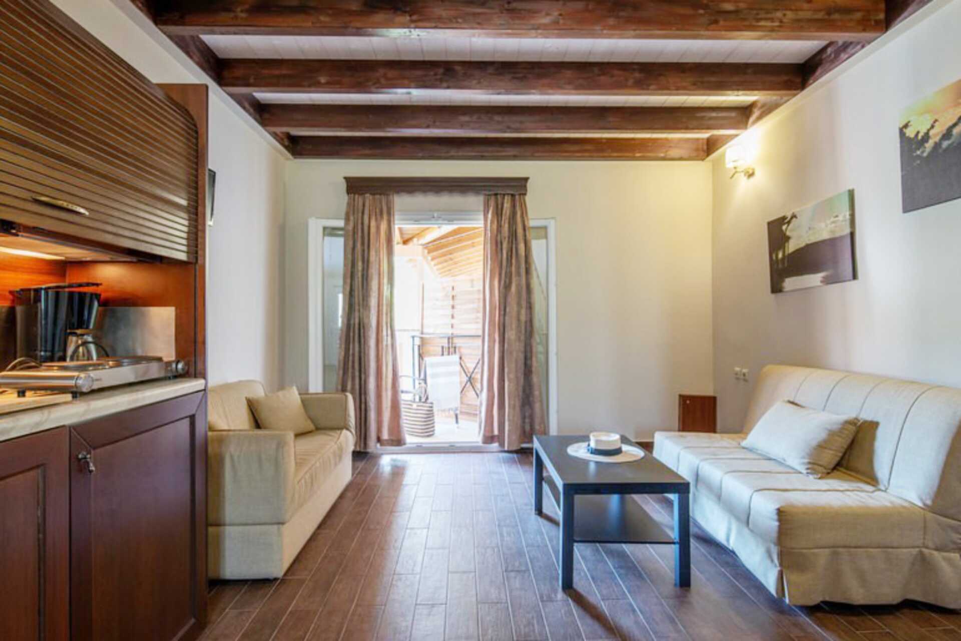 Kaksikerroksinen yksiö parvekkeella, yhdistetty makuuhuone ja minikeittiö. Sisäänkäyntikerroksessa on olohuone, jossa on kaksi vuodesohvaa, ja minikeittiö, jossa on keittolevyt, jääkaappi, vedenkeitin ja yksinkertainen keittiövarustus. Ruokailutila on käytettävissä ulkotilassa. Yläkerrassa on parisänky tai kaksi erillistä sänkyä. Avoin pohjaratkaisu kerrosten välillä. Maksuton wifi, ilmastointi ja tallelokero. TV kansainvälisillä kanavilla molemmissa kerroksissa. Suihku ja wc sisääntulokerroksessa. Siivous 7 krt/viikko. Alle 2-vuotiaat lapset lasketaan lisävuoteella majoittuviksi henkilöiksi.