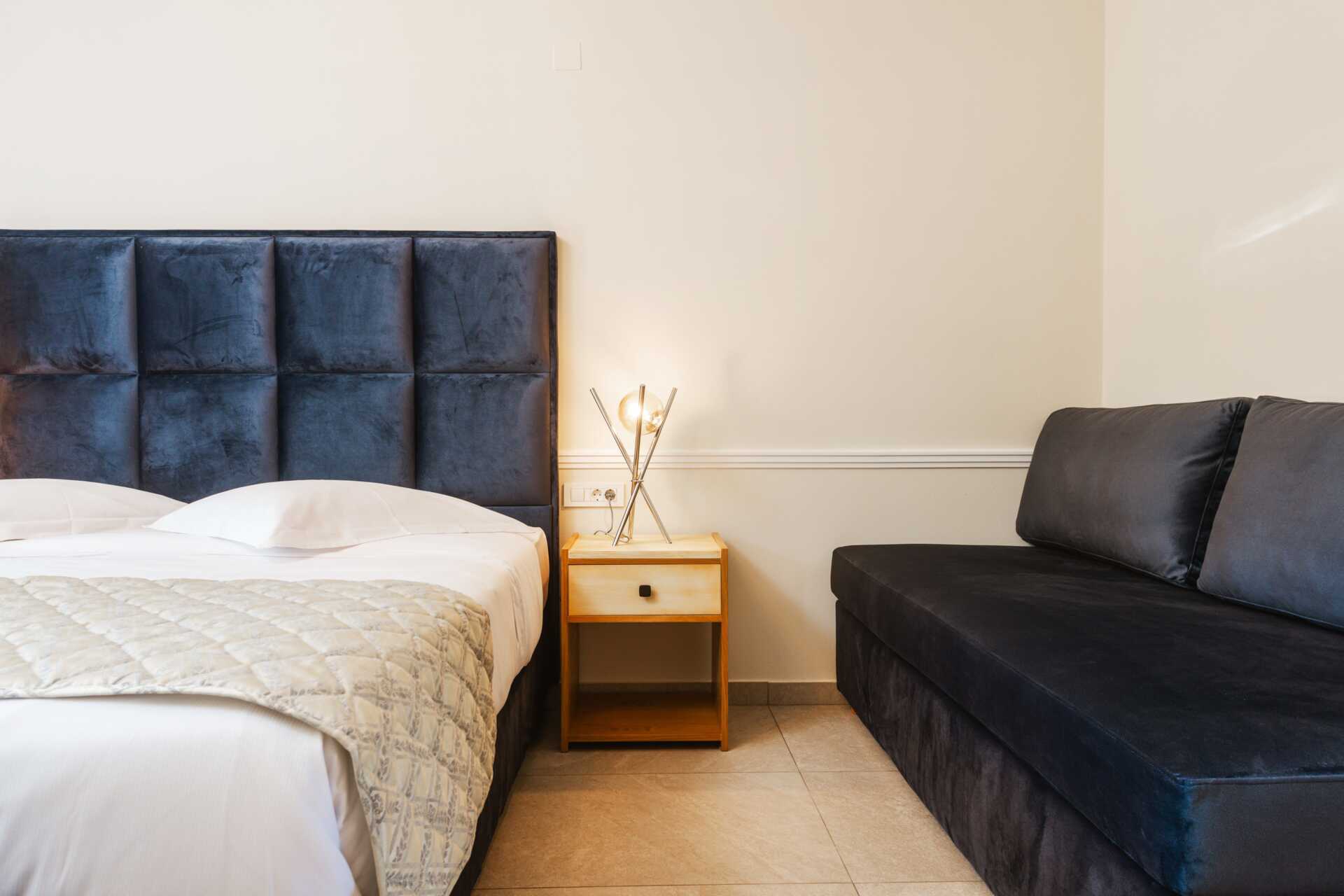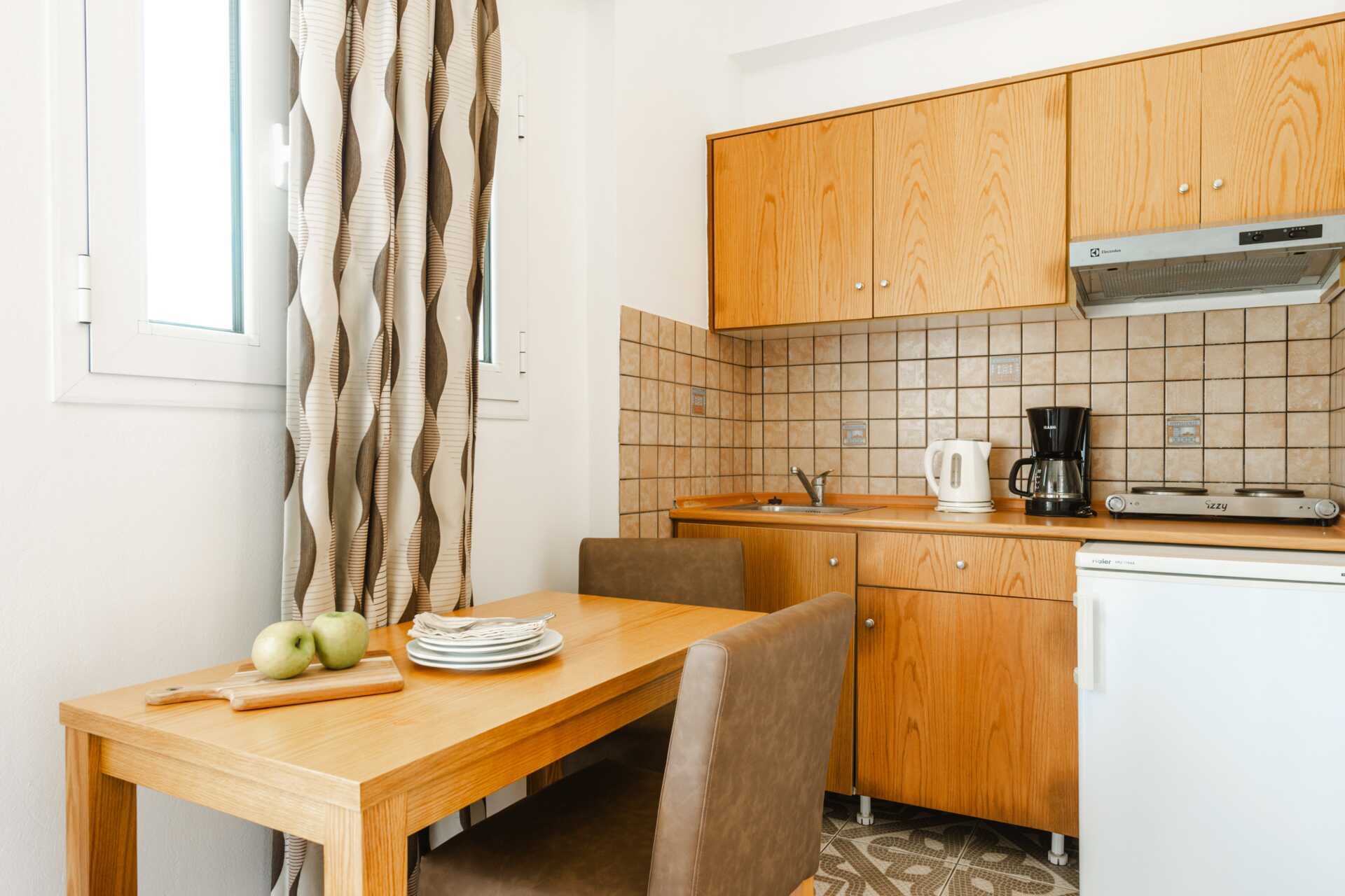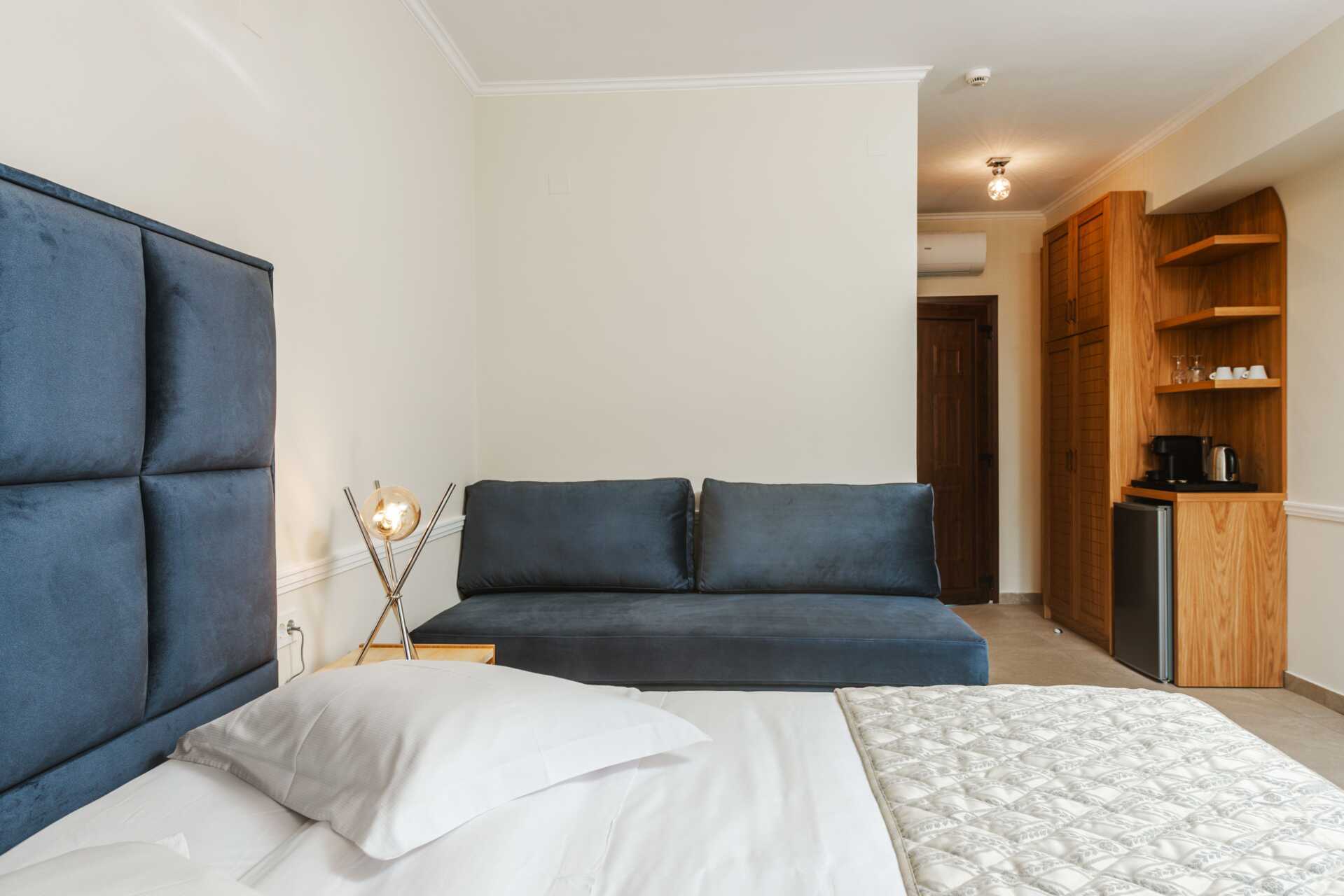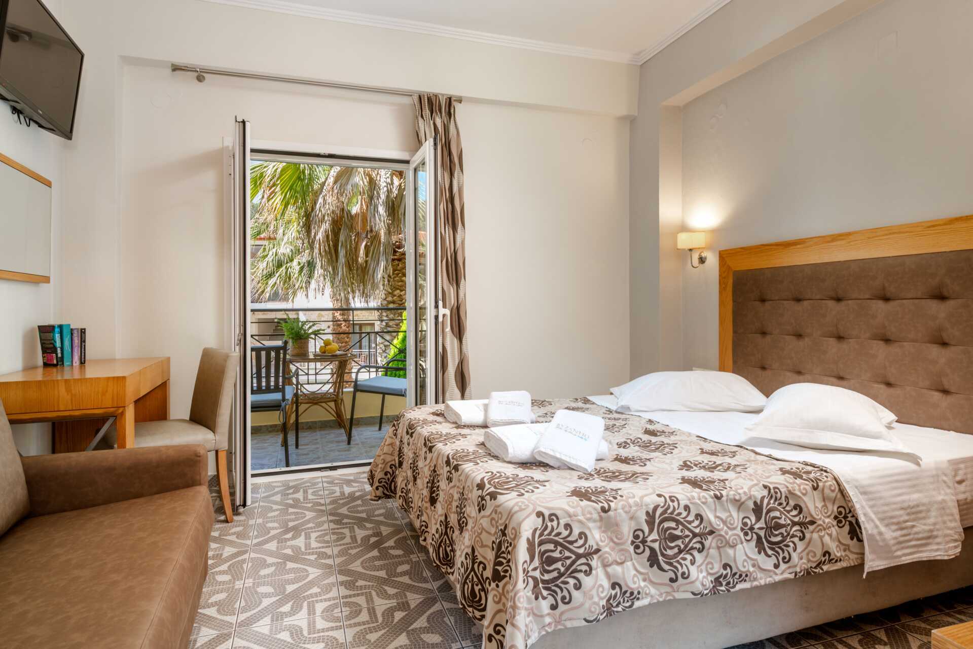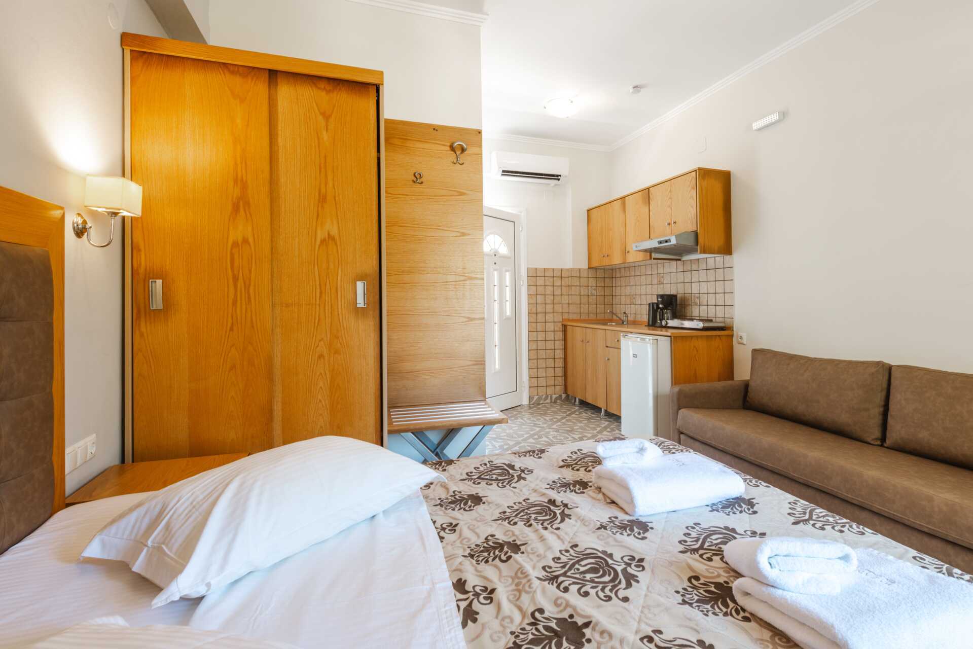 Superior yksiö parvekkeella tai terassilla ja näkymä puutarhaan. Yhdistetty makuuhuone ja minikeittiö. Parivuode tai kaksi yhden hengen sänkyä. Lisävuodemahdollisuus vuodesohvasta. Huomioithan, että huoneisto voi tuntua ahtaalta, jos käytetään lisävuodetta. Minikeittiössä jääkaappi, keittolevyt, kahvinkeitin, vedenkeitin ja yksinkertainen keittiövarustus. Ruokailutila parvekkeella tai terassilla. Maksuton wifi, ilmastointi ja tallelokero. Tv kansainvälisillä kanavilla. Hiustenkuivain. Kylpyhuoneessa kylpyamme tai suihku ja wc. Siivous 7 krt/viikko. Alle 2-vuotiaat lapset lasketaan lisävuoteella majoittuviksi henkilöiksi.