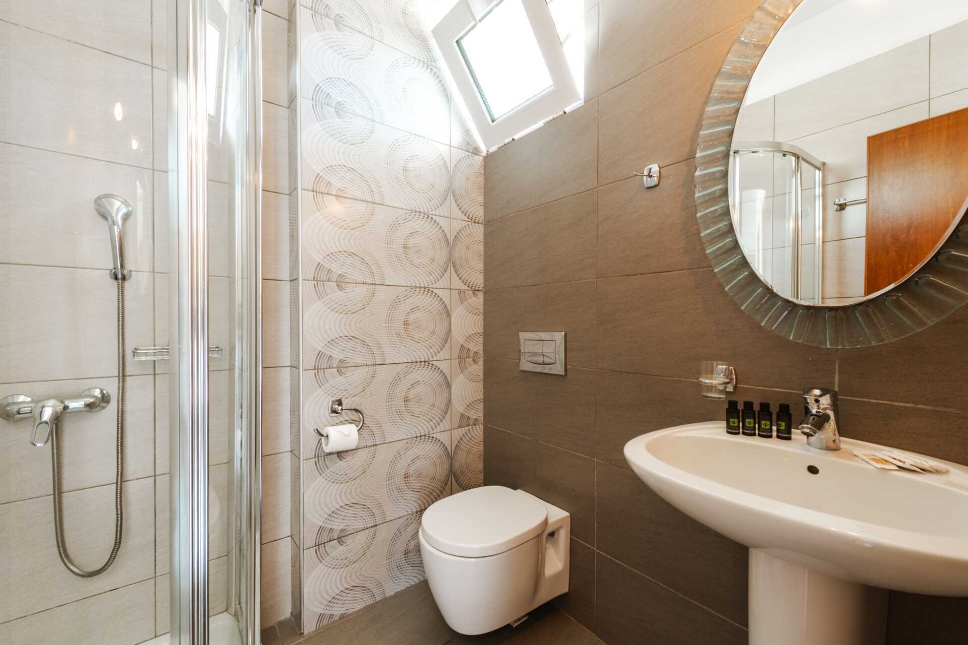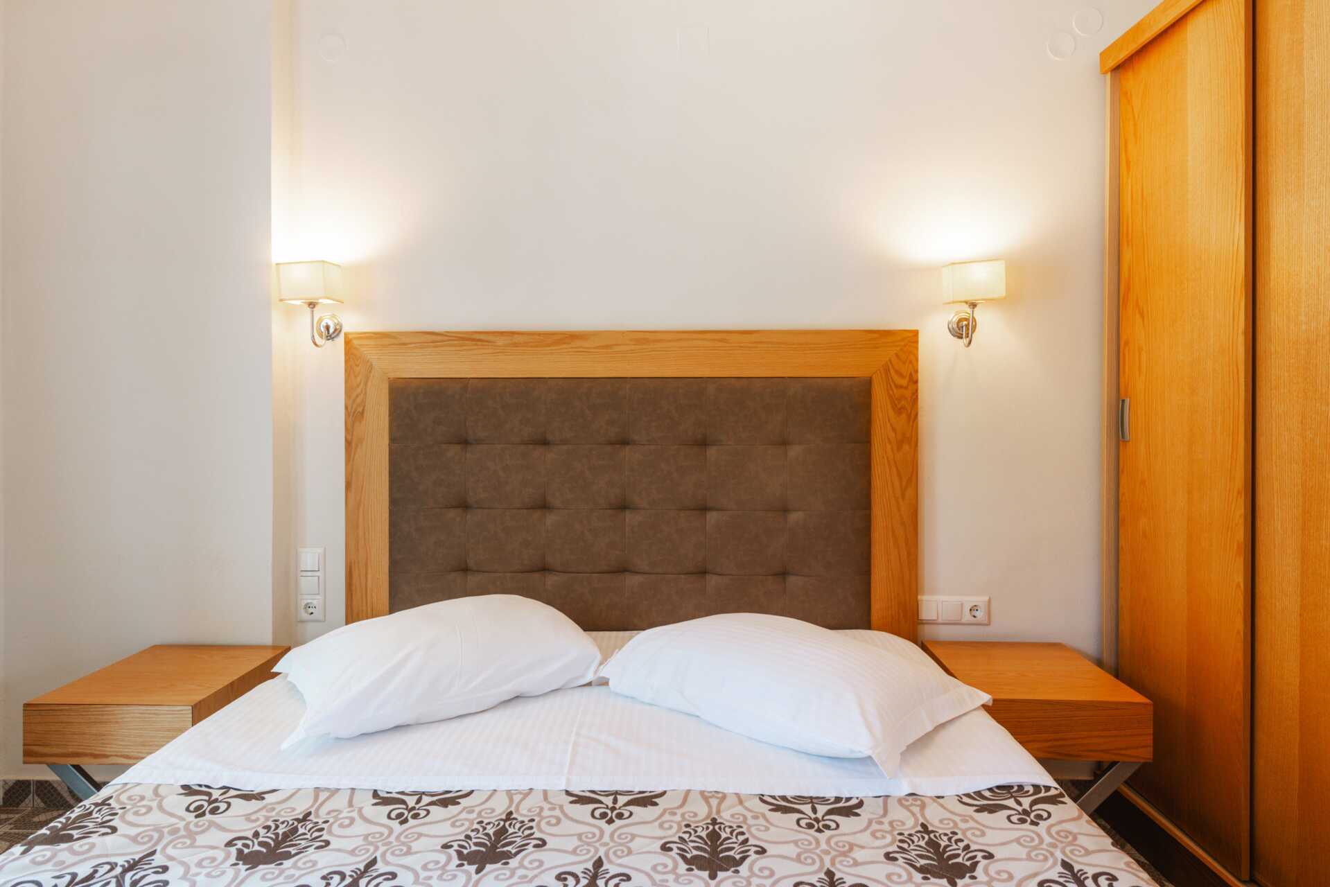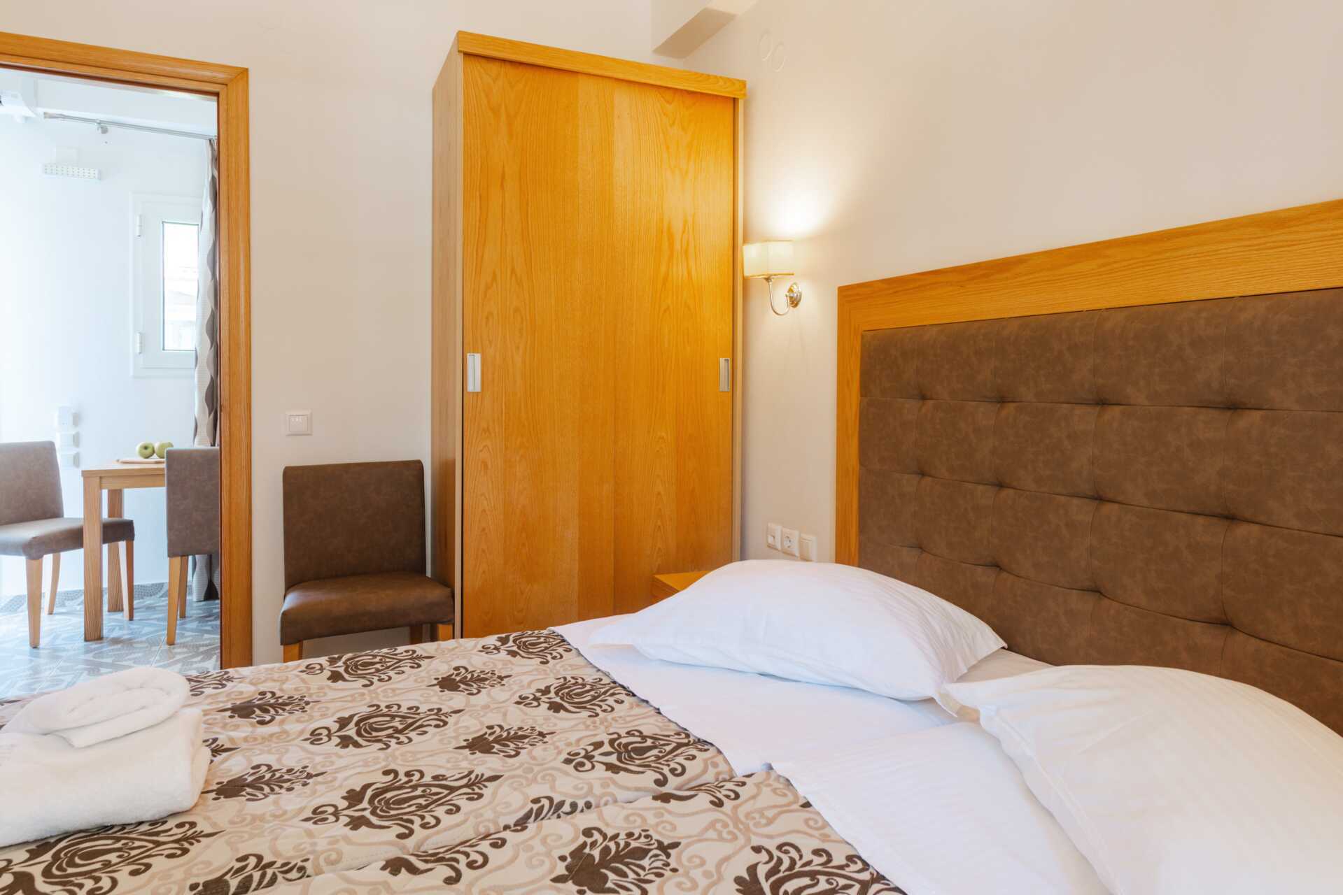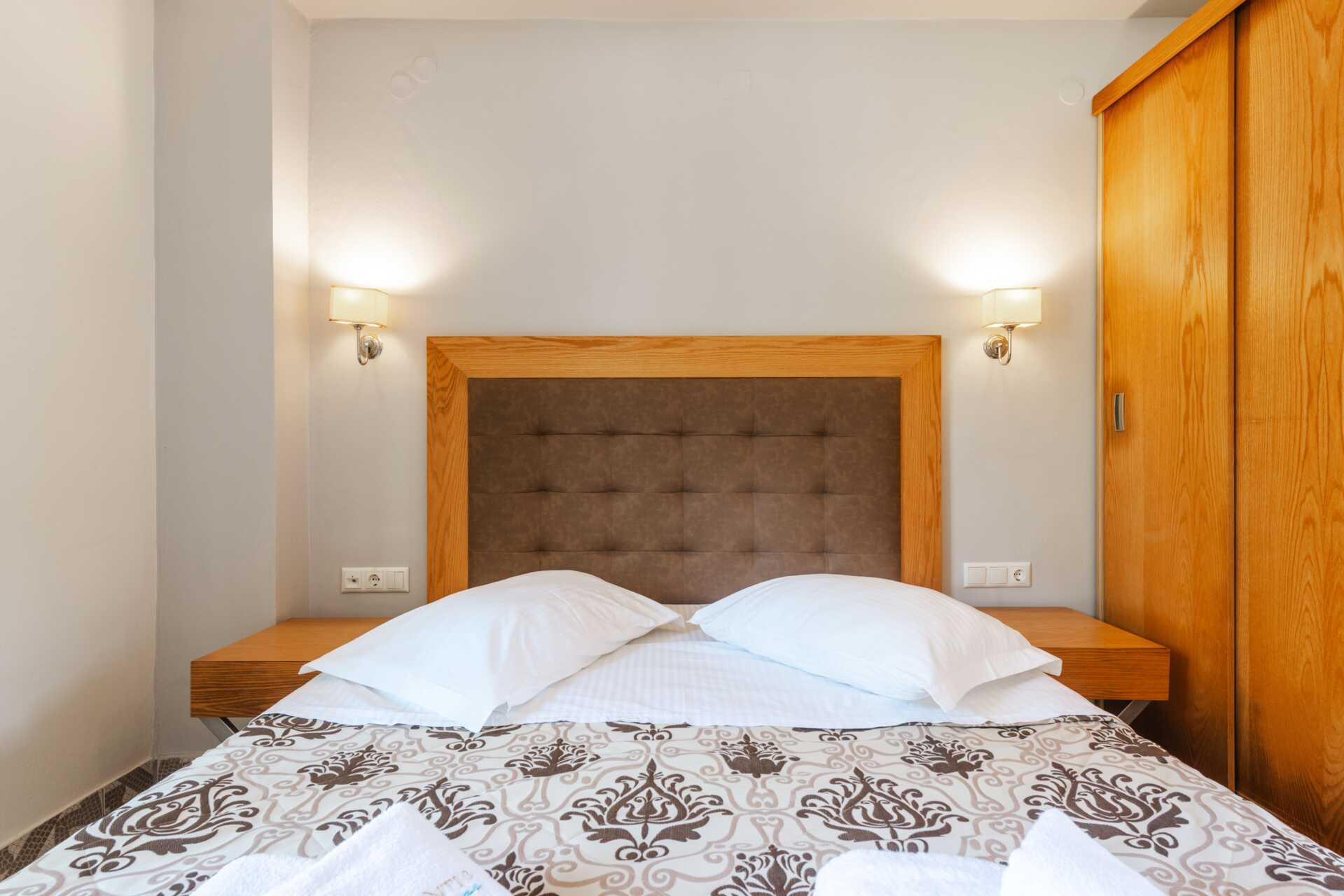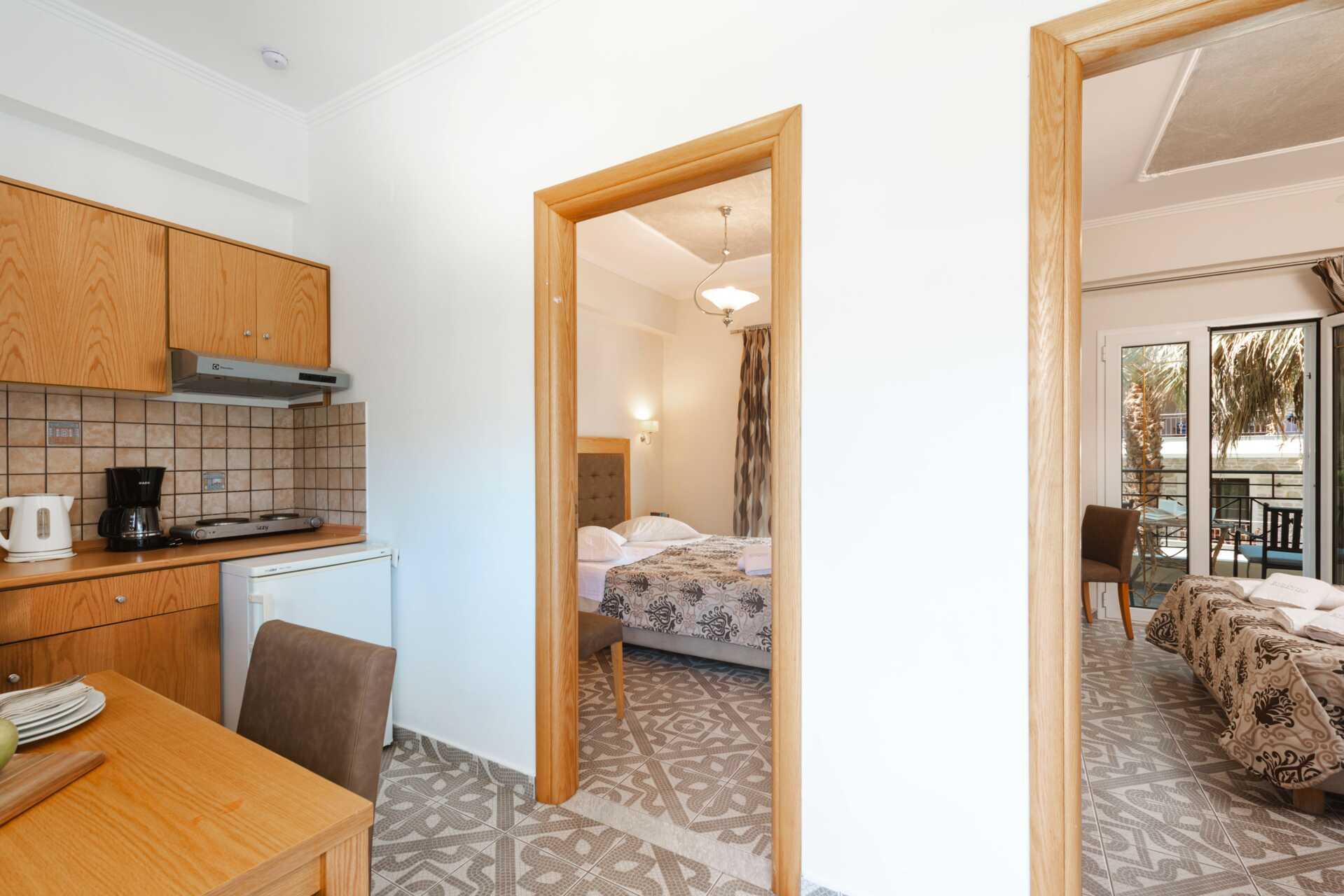 Kolmio parvekkeella tai terassilla. Kaksi makuuhuonetta ja keittiö ruokailutilalla. Yksi parisänky tai kaksi erillistä sänkyä kummassakin makuuhuoneessa. Minikeittiössä keittolevyt, jääkaappi, kahvinkeitin, vedenkeitin ja yksinkertainen keittiövarustus. Ulkoruokailutila. Maksuton wifi, ilmastointi ja tallelokero. Tv kansainvälisillä kanavilla. Hiustenkuivain. Kylpyhuoneessa kylpyamme tai suihku ja wc. Siivous 7 krt/viikko. Alle 2-vuotiaat lapset lasketaan lisävuoteella majoittuviksi henkilöiksi.