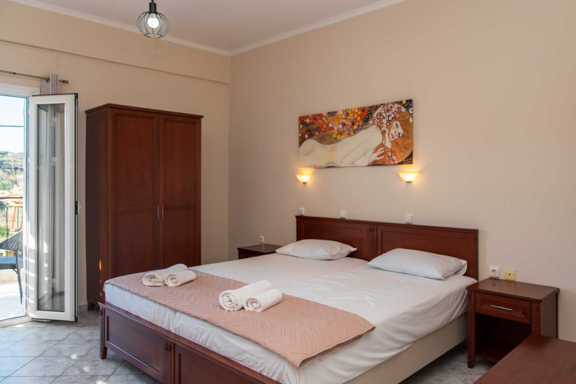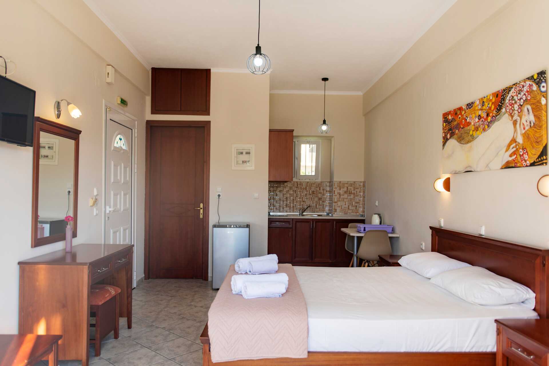Yksiö, parvekkeella tai terassilla. Yhdistetty makuuhuone ja minikeittiö. Parivuode tai kaksi yhden hengen vuodetta. Minikeittiö, jossa jääkaappi, liesi, vedenkeitin ja yksinkertainen keittiövarustus. Maksuton wifi ja tallelokero. Ilmastointi lisämaksusta. Tv paikallisilla kanavilla. Hiustenkuivain. Suihku ja wc. Siivous 6 krt/viikko.