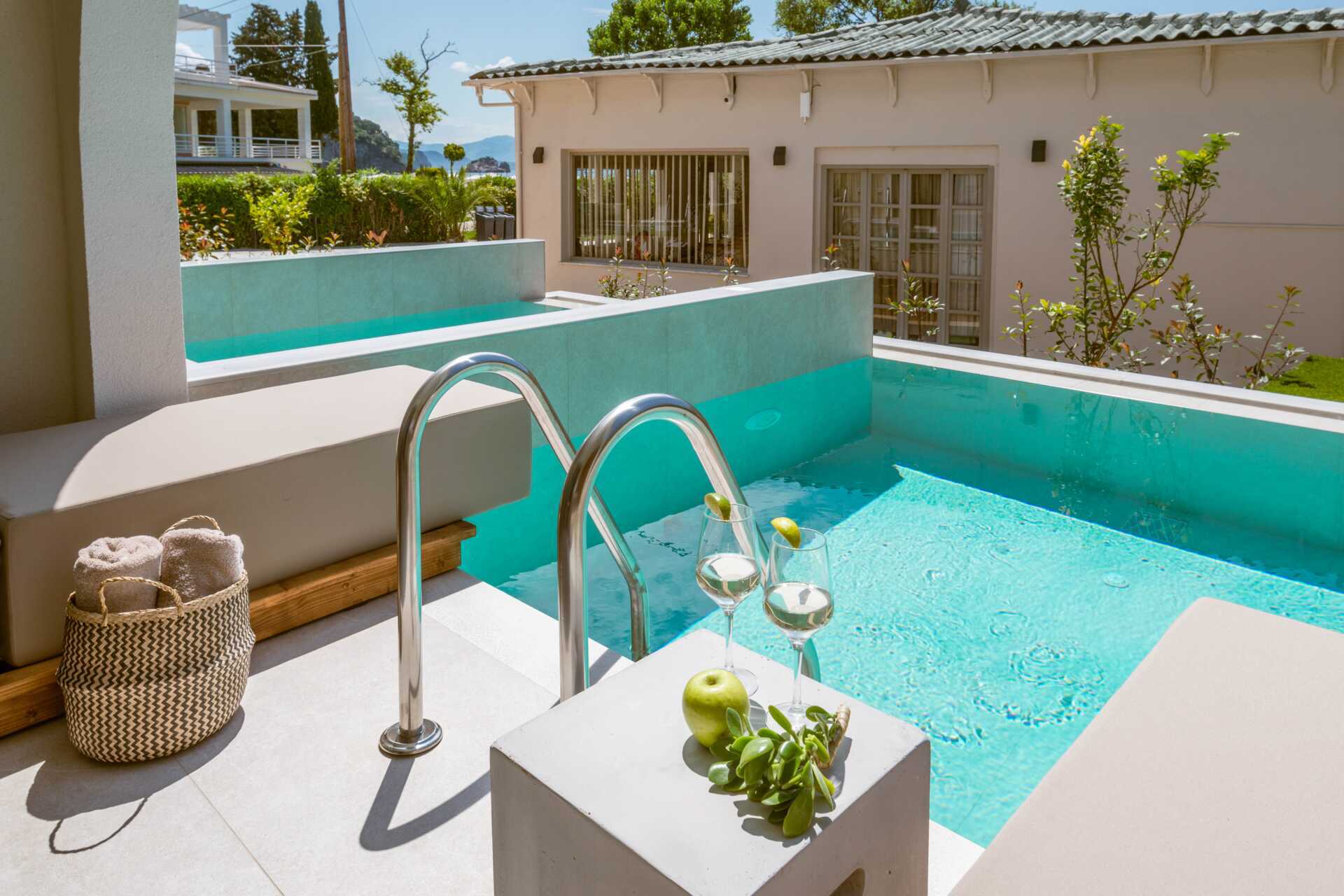 Kahden hengen huone, jossa on oma uima-allas pohjaterassilla. Terassilla on kaksi aurinkotuolia ja tikkaat alas altaaseen. Parivuode. maksuton wifi, ilmastointi ja tallelokero. Jääkaappi. Vedenkeitin, kahvia ja teetä. Illy-kahvinkeitin – kapselit sisältyvät hintaan saapumisen yhteydessä, ja ostettavissa vastaanotosta. Tv kansainvälisillä kanavilla. Hiustenkuivain. Tossut. Kylpyhuoneessa suihku ja wc. Siivous 7 krt/viikko.