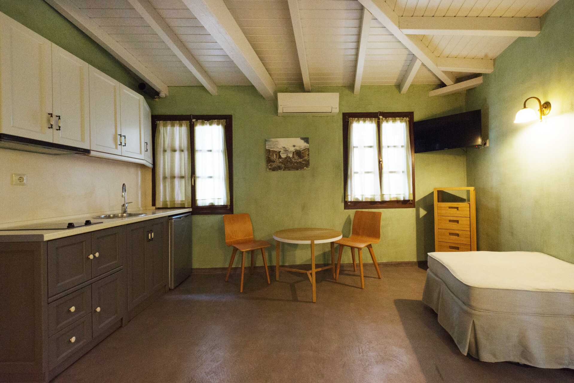 Deluxe-yksiö maaterassilla. Yhdistetty makuuhuone ja minikeittiö. Kaksi erillistä vuodetta. Maksuton wifi, ilmastointi ja tallelokero. Minikeittiö, jossa jääkaappi, keittolevyt, kahvinkeitin ja yksinkertaiset keittiövarusteet. Tv kansainvälisillä kanavilla. Hiustenkuivain. Suihku ja wc. Siivous 6 krt/viikko.