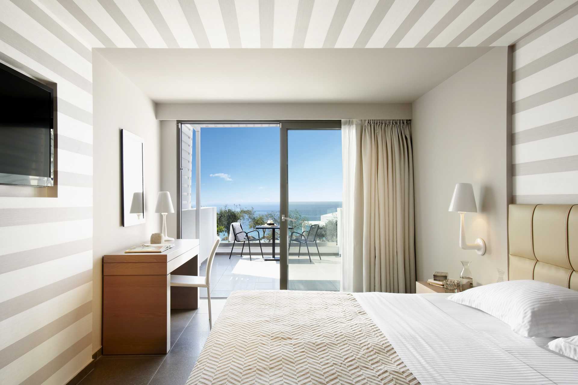 Superior-huone parvekkeella ja merinäköalalla. Huoneet sijaitsevat päärakennuksessa uima-altaan vieressä. Parivuode tai kaksi yhden hengen sänkyä. Maksuton wifi, ilmastointi ja tallelokero. Jääkaappi. Tv kansainvälisillä kanavilla. Tohvelit. Hiustenkuivain. Suihku ja wc. Siivous 7 krt/viikko.