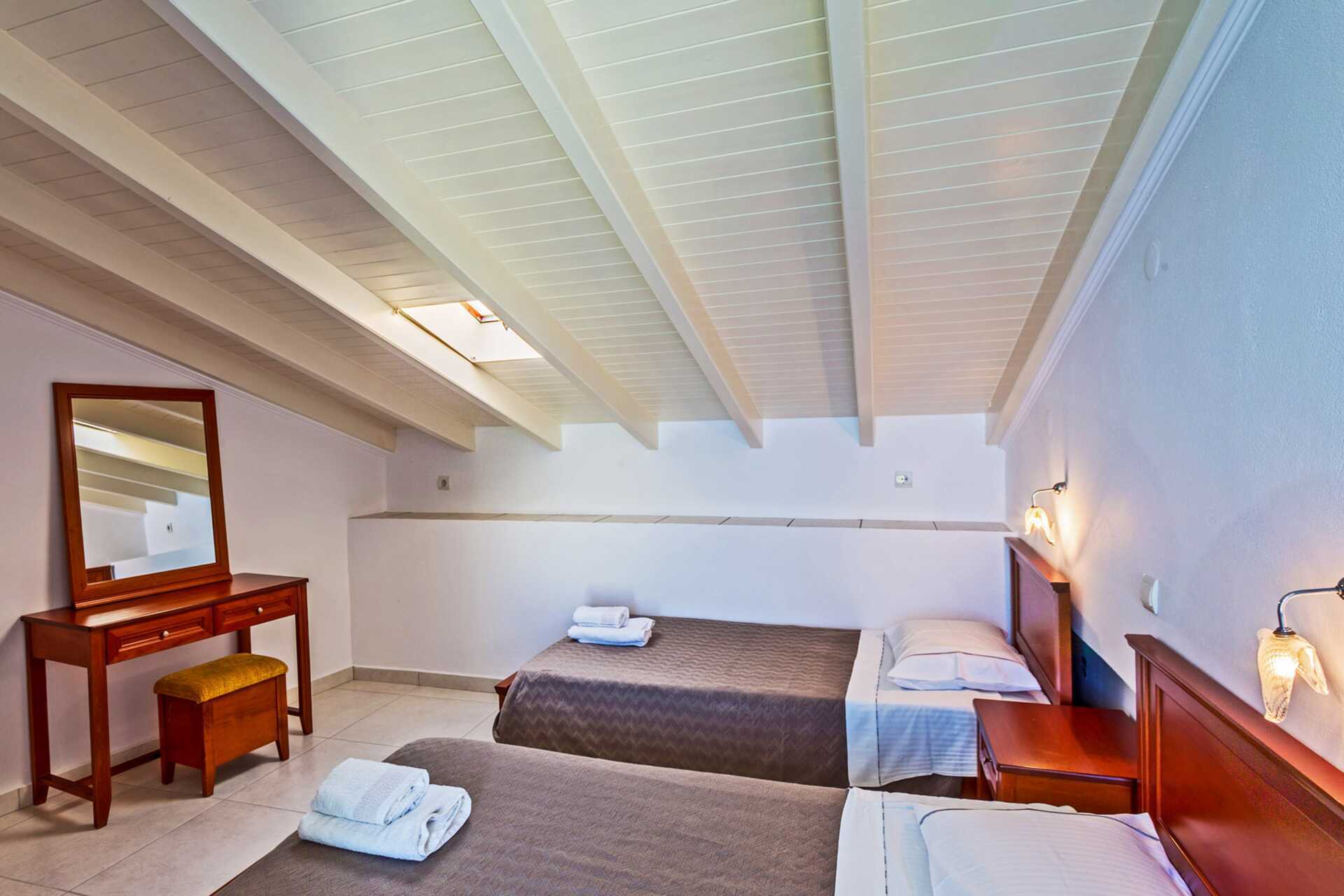 Deluxe-huone parvekkeella ja merinäköalalla. Talon ylimmässä kerroksessa sijaitsevissa deluxe-huoneissa on viistokatot. Parivuode tai kaksi yhden hengen sänkyä. Lisävuoteen mahdollisuus lapsille joissakin huoneissa. Huomioithan, että lisävuodetta käytettäessä huoneesta tulee ahdas. Maksuton wifi, ilmastointi ja tallelokero. Jääkaappi. Tv kansainvälisillä kanavilla. Hiustenkuivain. Suihku ja wc. Siivous 7 krt/viikko.