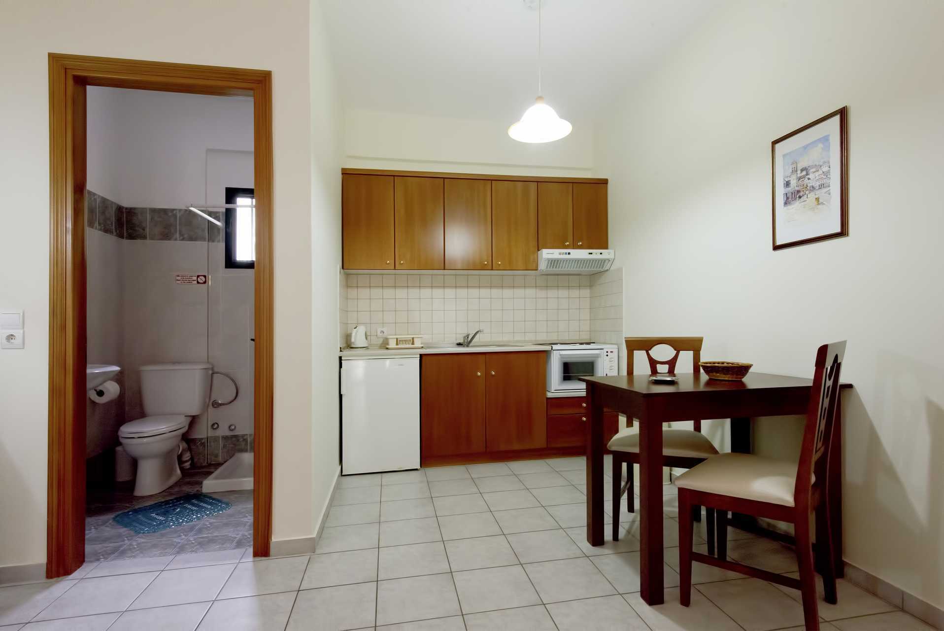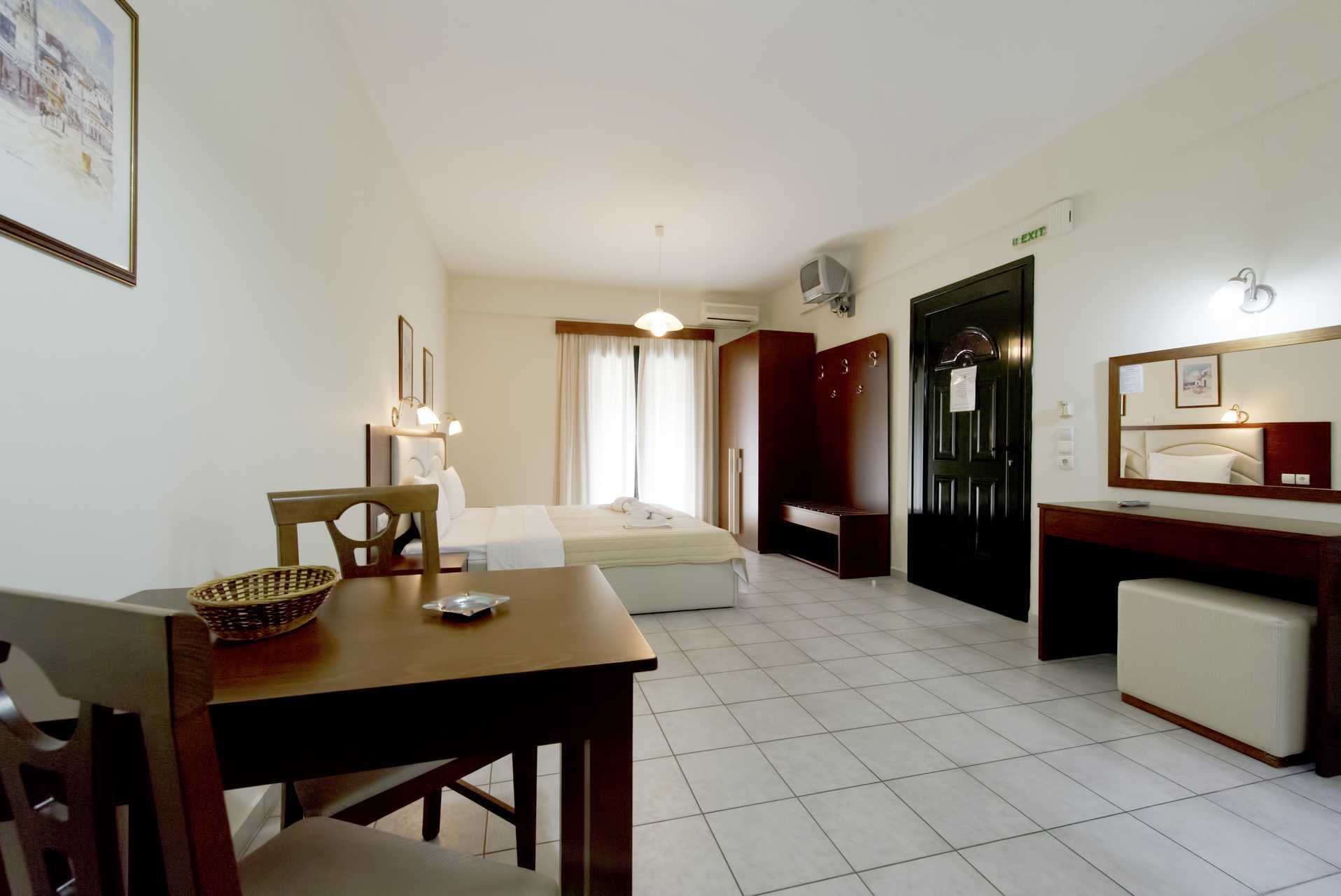 Yksiöitä, joissa yhdistetty makuuhuone ja minikeittiö. Parveke tai maaterassi. Parivuode tai kaksi erillistä vuodetta. Maksuton wifi, yhteys vaihtelee ja osassa huoneistoista toimii vain ulkotilassa. Ilmastointi ja tallelokero lisämaksusta. Keittolevy, jääkaappi, vedenkeitin, voileipägrilli ja yksinkertainen keittiövarustus. Tv kansainvälisillä kanavilla. Hiustenkuivain. Suihku ja wc. Siivous 6 krt/viikko.