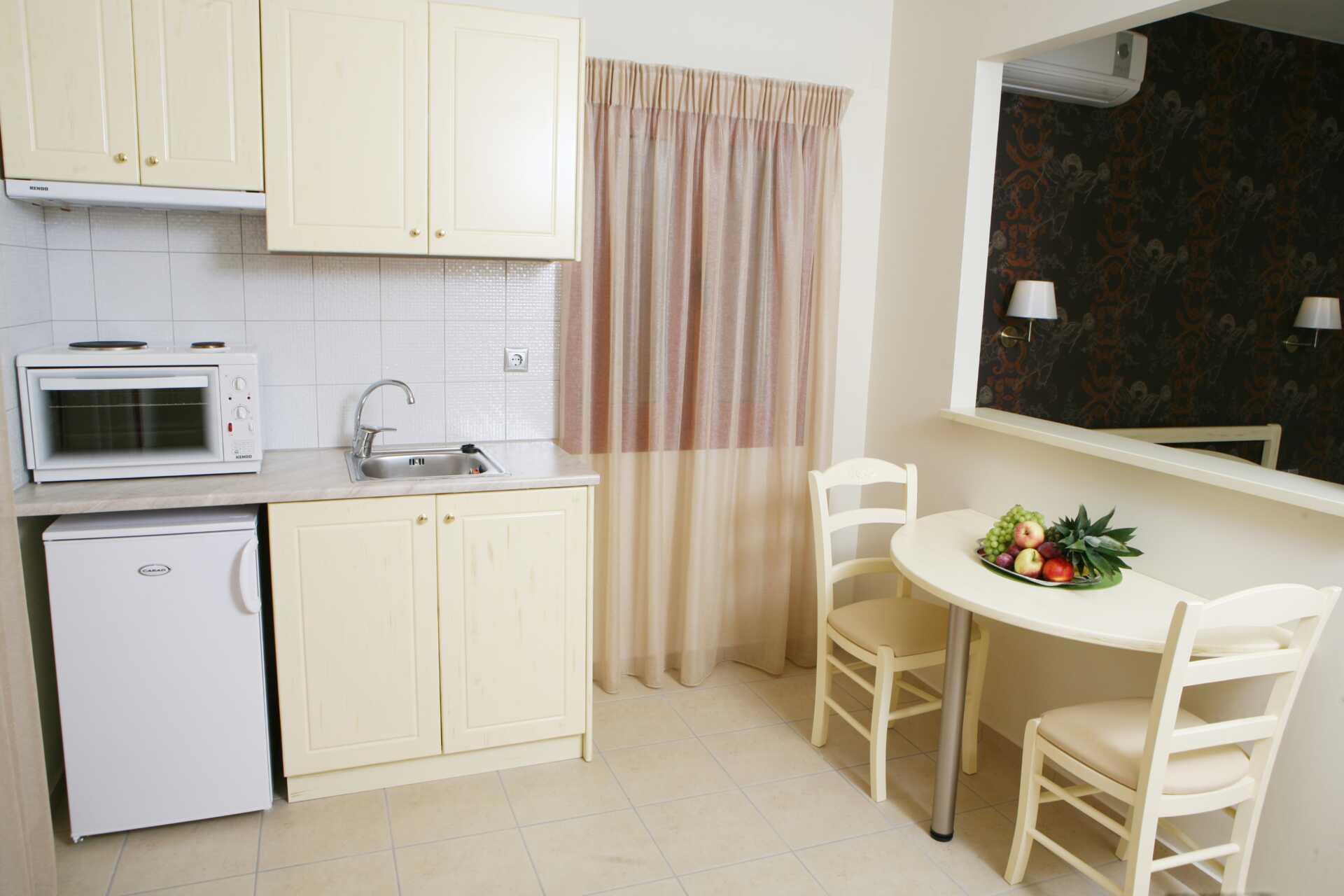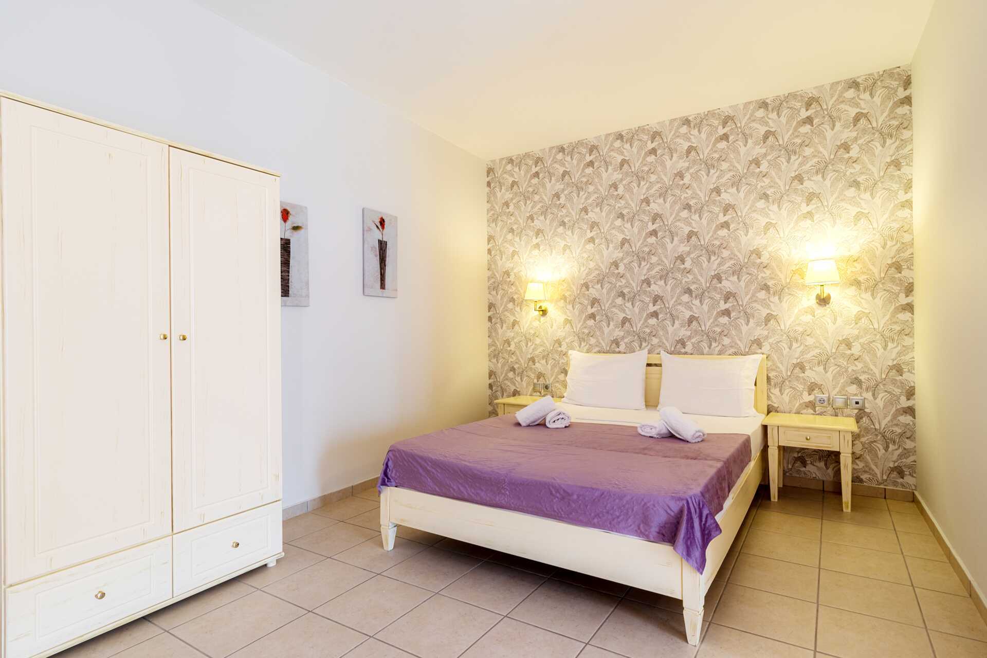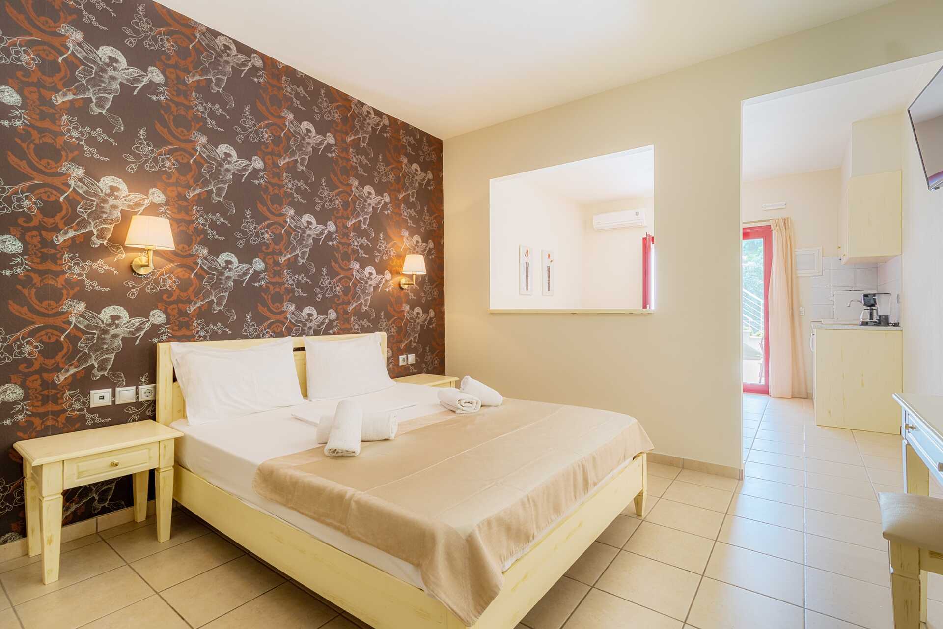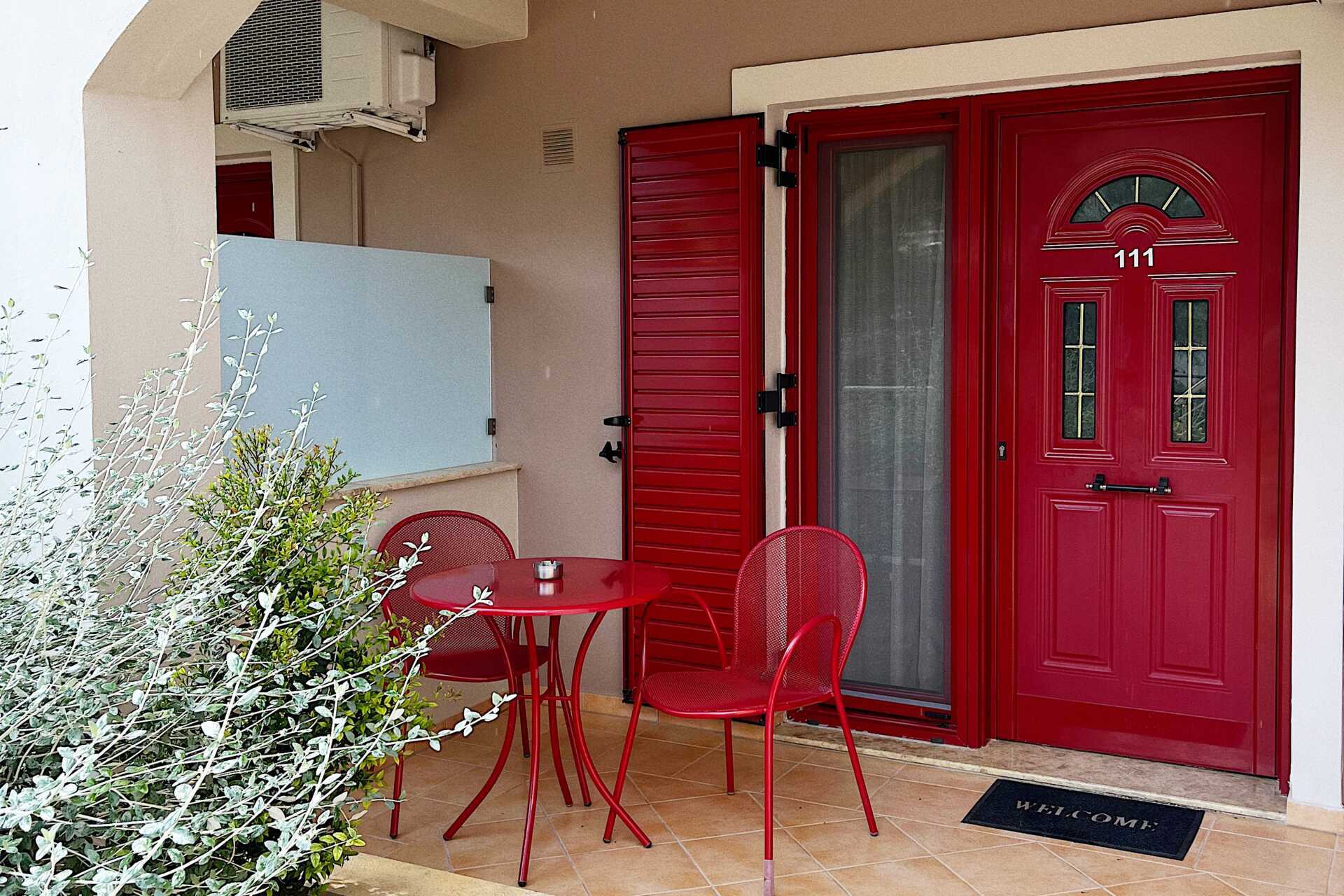 Kaksio maaterassilla. Yhdistetty makuuhuone ja minikeittiö. Parivuode. Minikeittiö, jossa keittolevyt, uuni, jääkaappi, kahvinkeitin, vedenkeitin ja yksinkertainen keittiövarustus. Maksuton wifi, ilmastointi ja tallelokero. Tv kansainvälisillä kanavilla. Hiustenkuivain. Suihku ja wc. Siivous 6 krt/viikko.