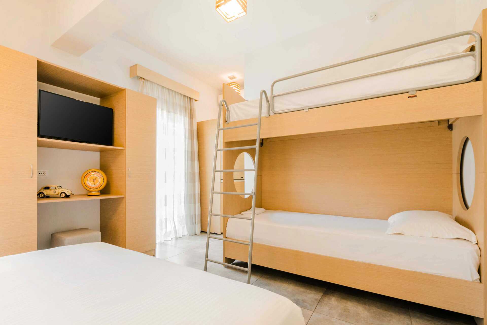 Deluxe-huone Plus, jossa on parveke ja rajoitettu merinäköala. Parisänky ja mahdollisuus lisävuoteisiin kahdelle lapselle kerrossängyissä. Maksuton wifi, ilmastointi ja tallelokero. Jääkaappi. Tv kansainvälisillä kanavilla. Tohvelit. Hiustenkuivain. Suihku ja wc. Siivous 6 krt/viikko.