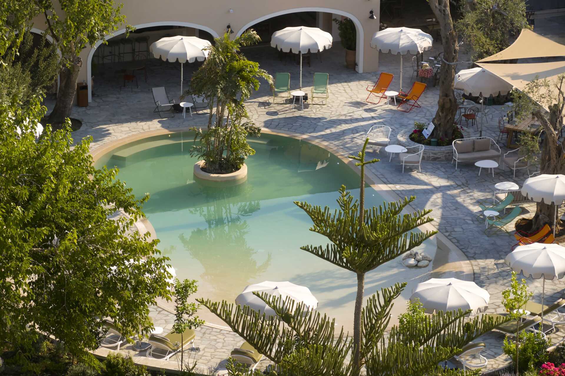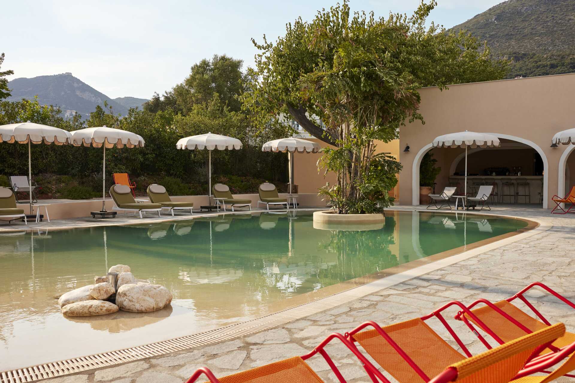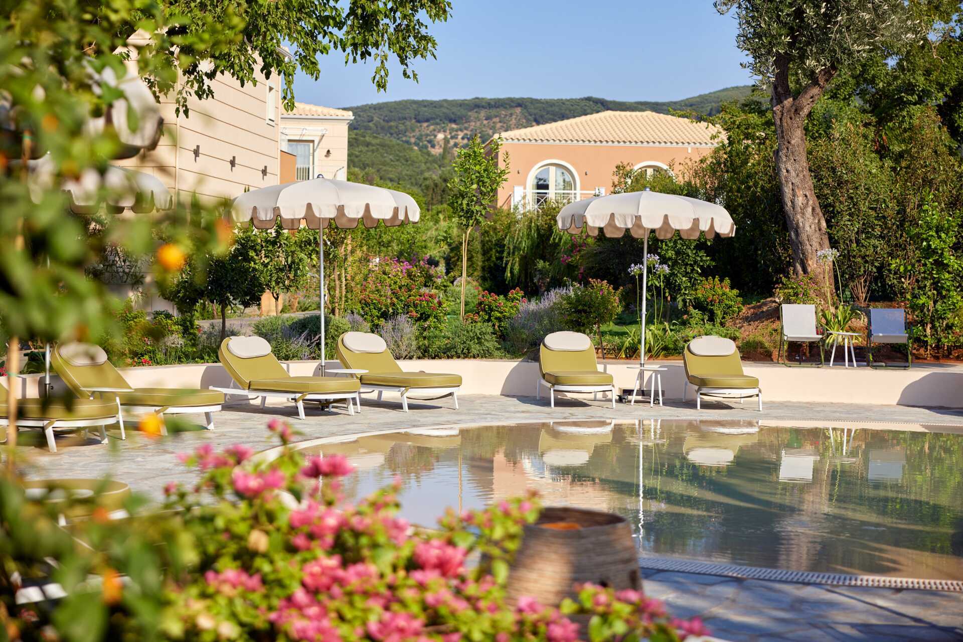 Upea puutarha ja ihania rauhallisia allasalueita. Pargan paras ranta ja omat tuolit plussaa.
