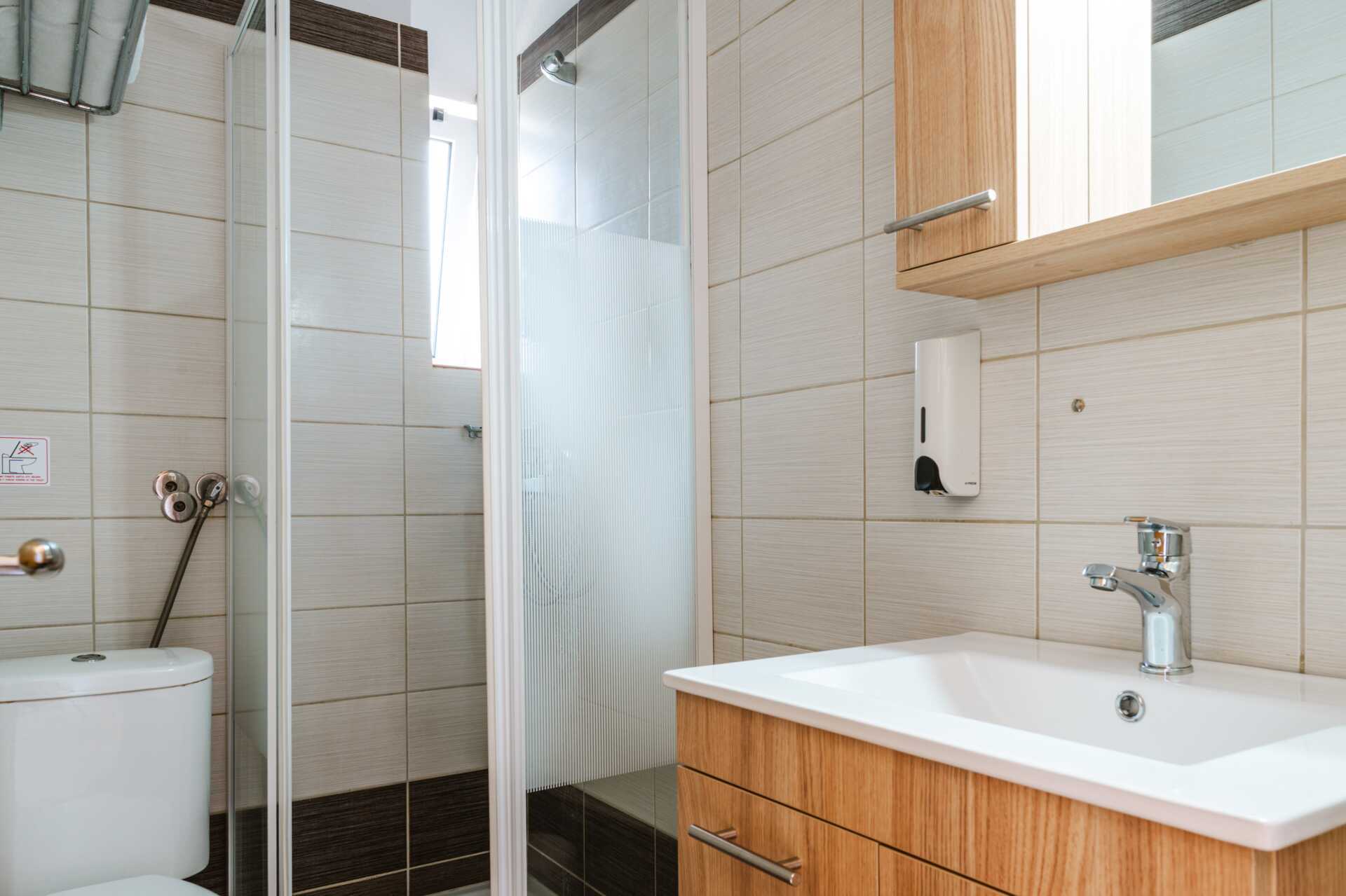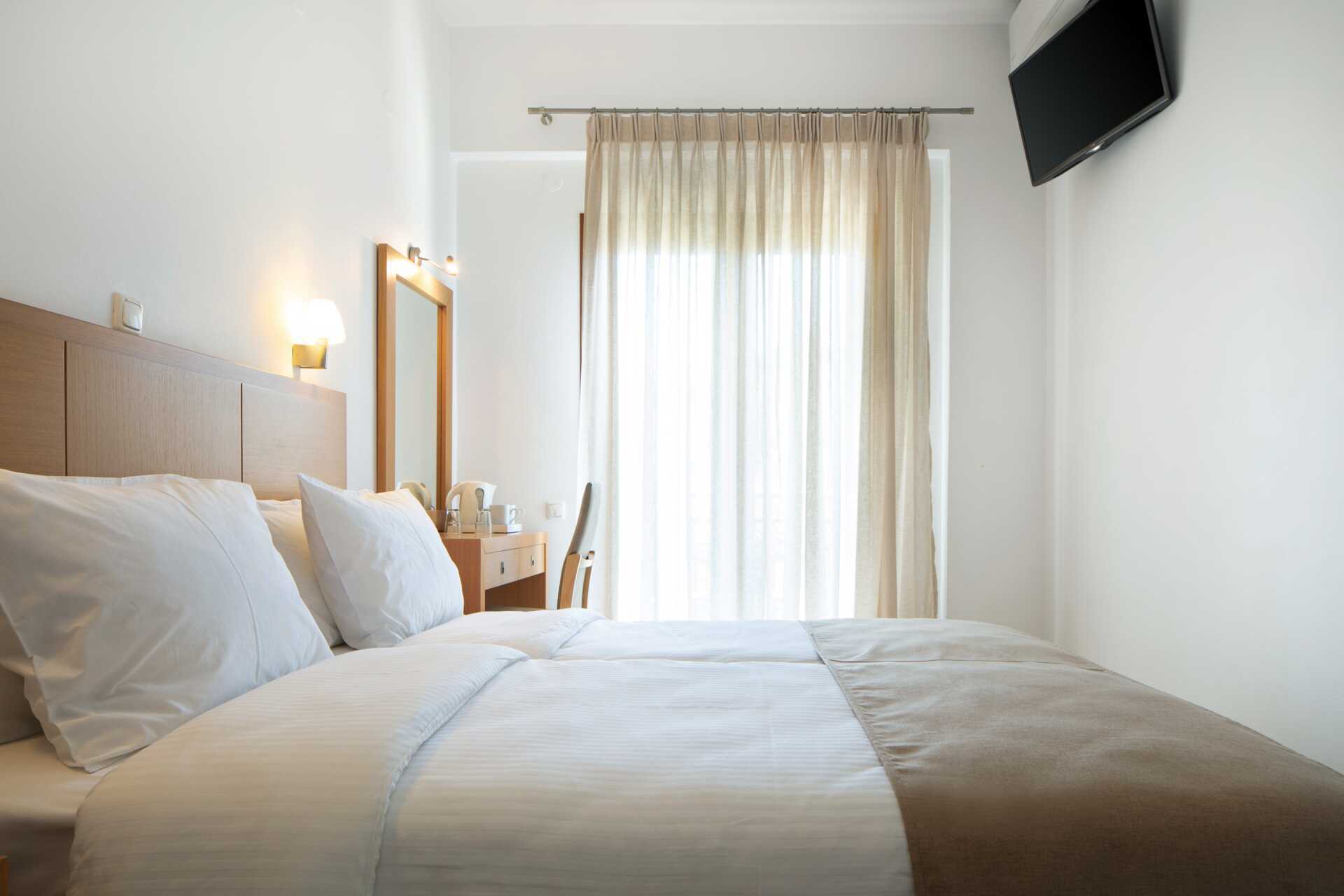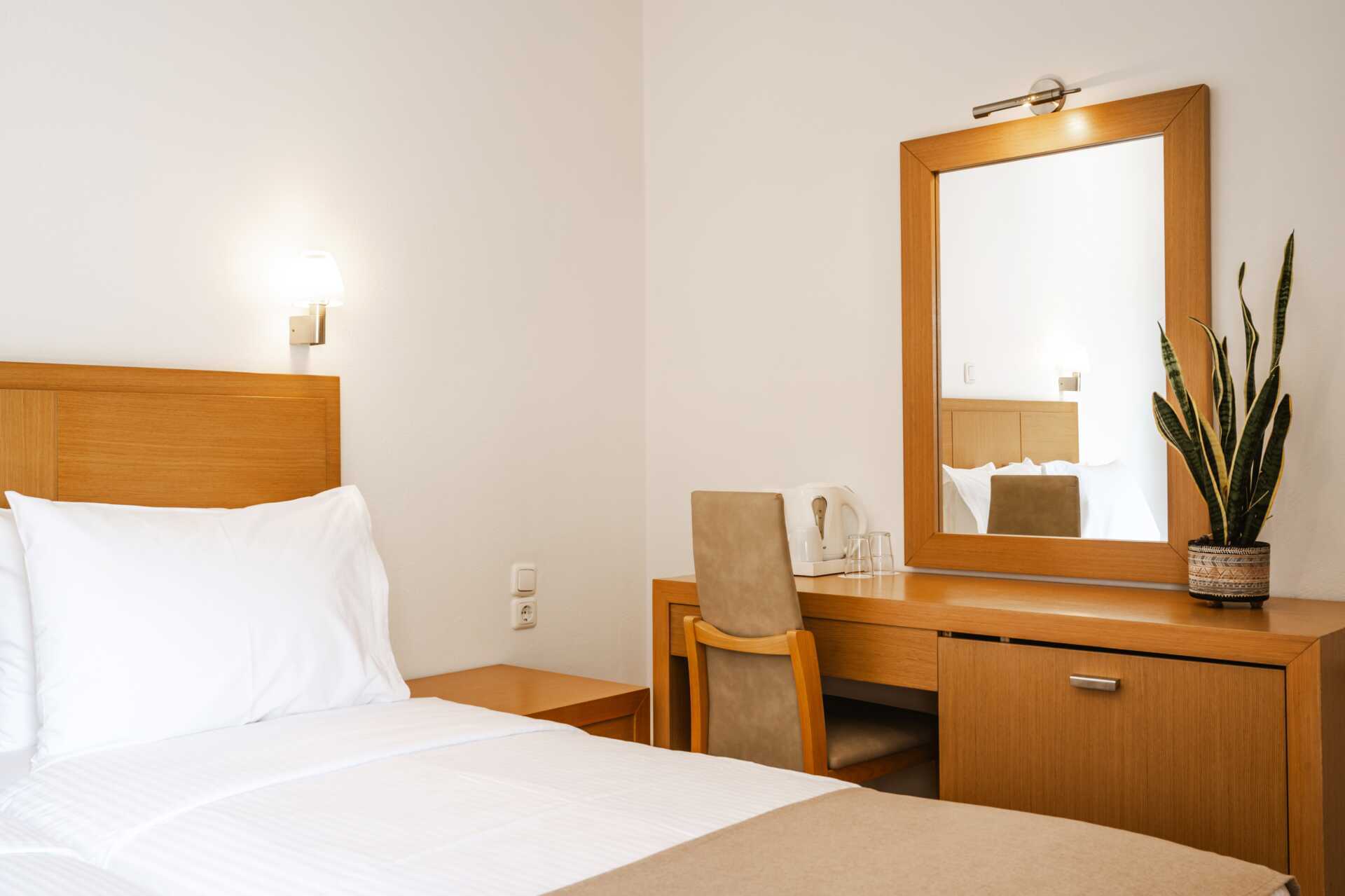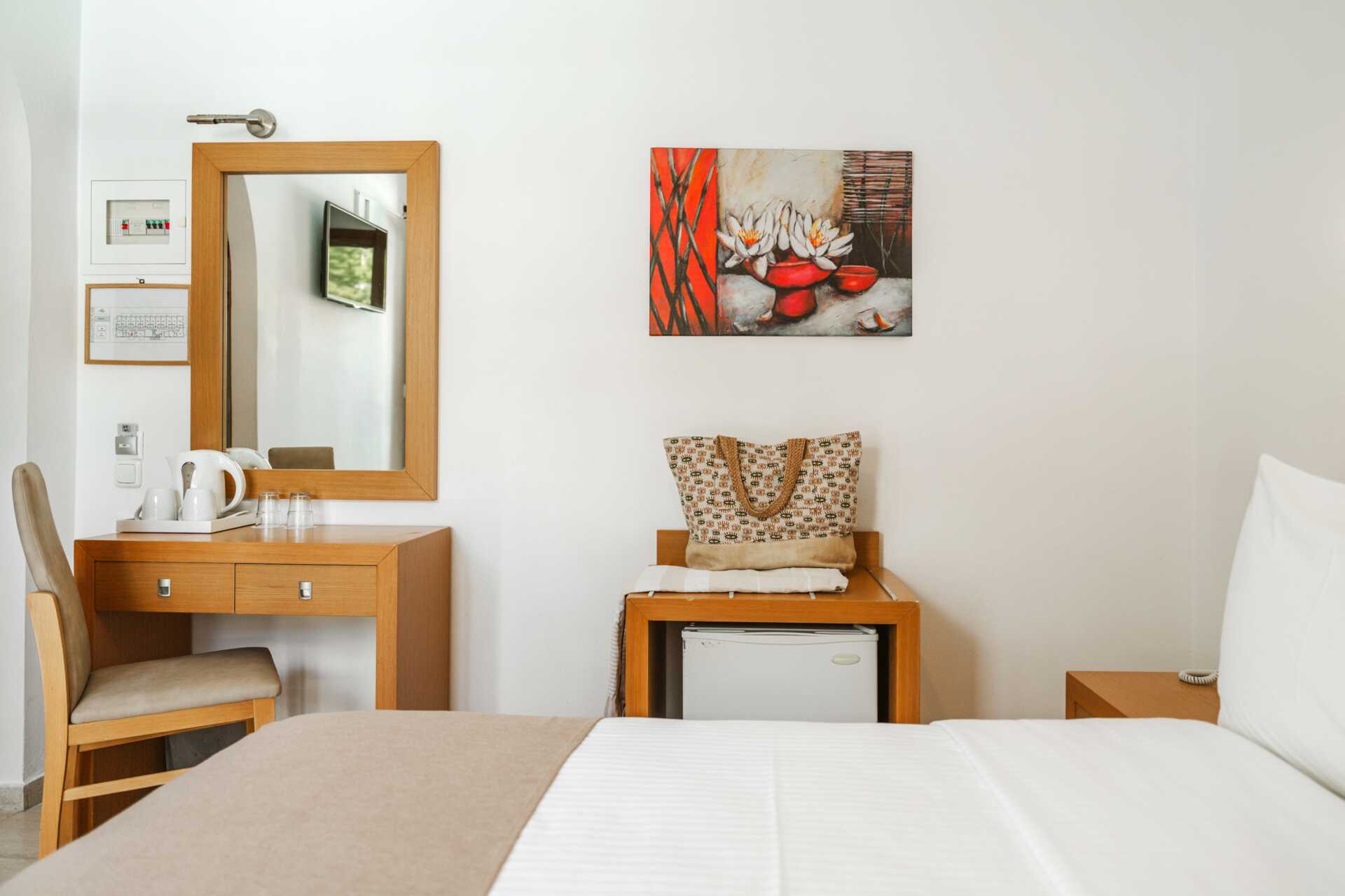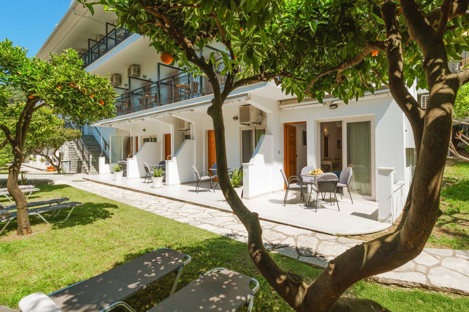 Yksiö, jossa on parveke tai terassi, jolta on näkymä puutarhaan. Makuuhuone sekä yhdistetty olohuone ja minikeittiö. Kaksi yhden hengen sänkyä. Minikeittiö, jossa keittolevyt, vedenkeitin, kahvinkeitin, leivänpaahdin, jääkaappi ja yksinkertainen keittiövarustus. Maksuton wifi ja ilmastointi. Tallelokero lisämaksusta. Tv kansainvälisillä kanavilla. Hiustenkuivain. Kylpyhuoneessa suihku ja wc. Siivous 7 krt/viikko.
