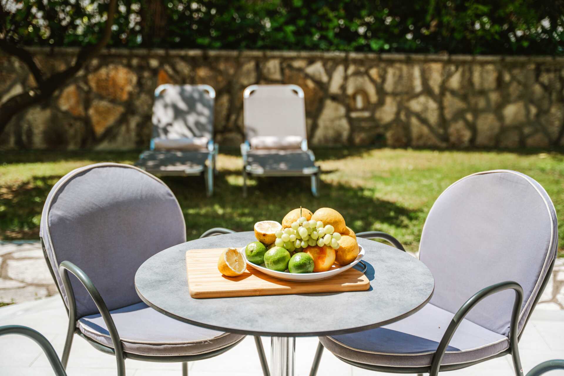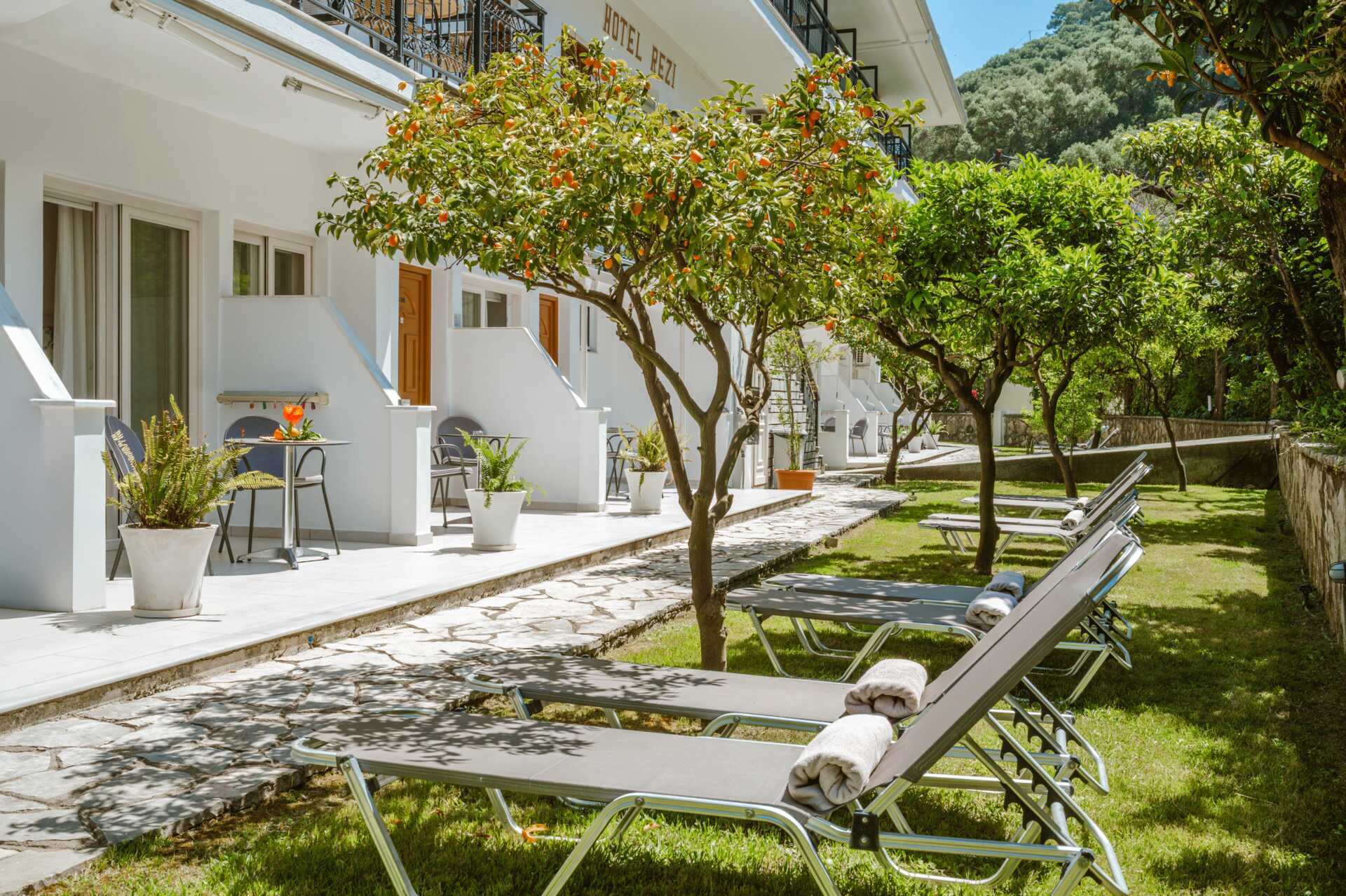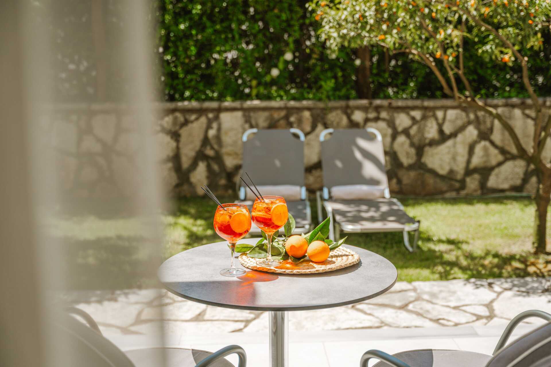 Kaksioita maaterassilla, josta näkymä puutarhaan. Erillinen makuuhuone sekä yhdistetty olohuone ja minikeittiö. Erilliset vuoteet. Lisävuodemahdollisuus kahdesta yhden hengen vuoteesta. Keittolevyt, jääkaappi, vedenkeitin, kahvinkeitin, leivänpaahdin ja yksinkertainen keittiövarustus. Maksuton ilmastointi ja wifi. Tallelokero lisämaksusta. Suihku ja wc. Siivous 7 krt/viikko.