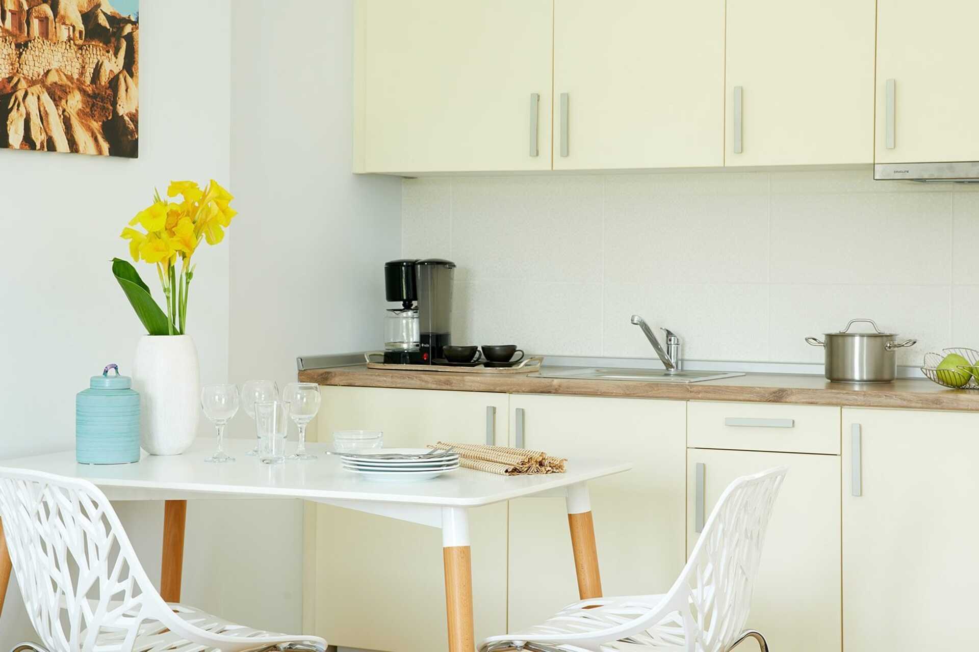 Yksiöitä, joissa on parveke tai maaterassi. Makuuhuone ja minikeittiö. Huoneistoissa on erilaisia pohjaratkaisuja. Parivuode tai kaksi erillistä vuodetta ja tyynymenu. Lisävuodemahdollisuus vuodesohvasta. Maksuton wifi, ilmastointi ja tallelokero. Minikeittiö, jossa on jääkaappi, keittolevyt, vedenkeitin, Nespresso-kahvinkeitin ja yksinkertainen keittiövarustus. Tv kansainvälisillä kanavilla. Hiustenkuivain. Kylpytakit ja tossut. Kylpyamme ja wc. Siivous 7 krt/viikko.