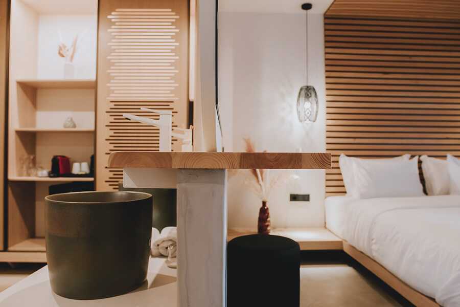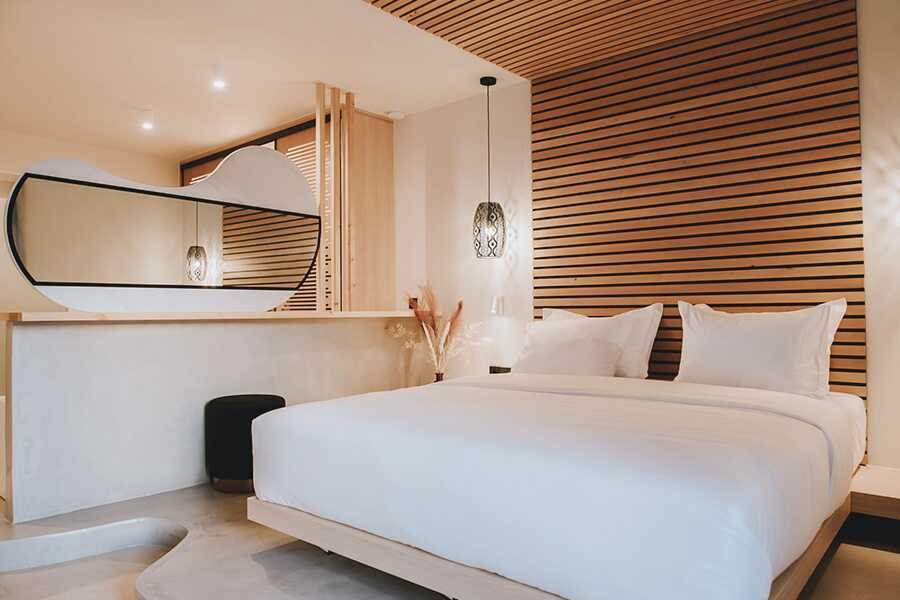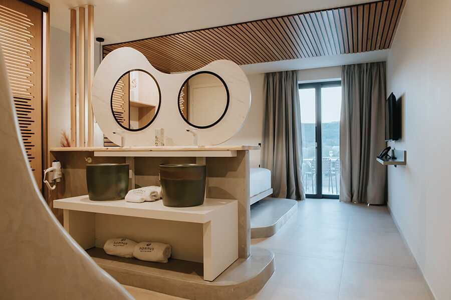 Kahden hengen huone, jossa on pieni yksityinen uima-allas terassilla Yksi parivuode. Maksuton wifi, tallelokero ja ilmastointi. Jääkaappi. Espressokone ja vedenkeitin. Kylpyhuone, jossa on suihku ja wc ja joka on osittain avoin huoneeseen. Siivous 7 krt/viikko.