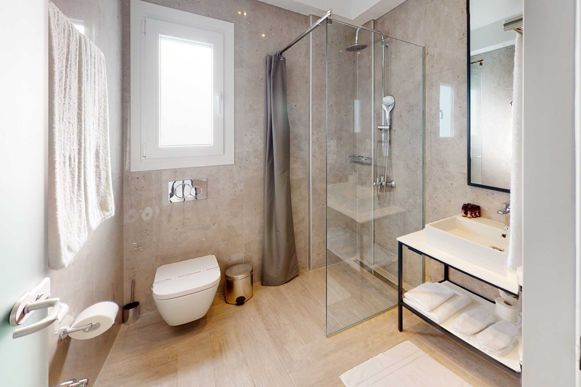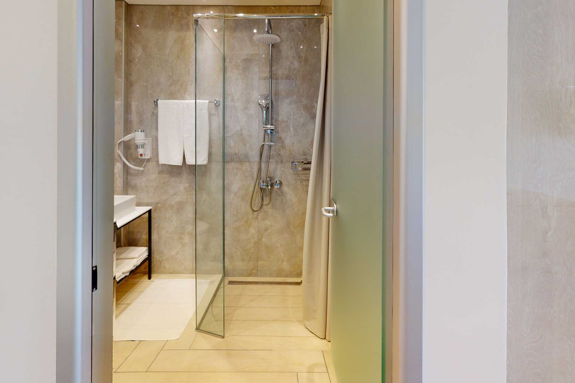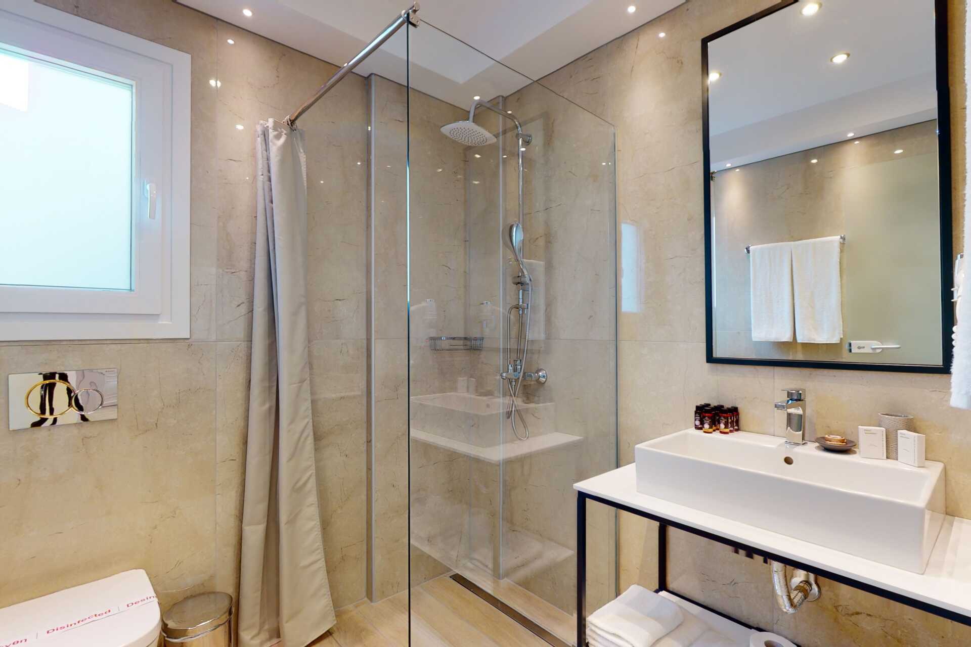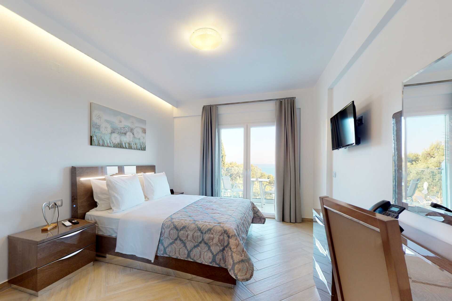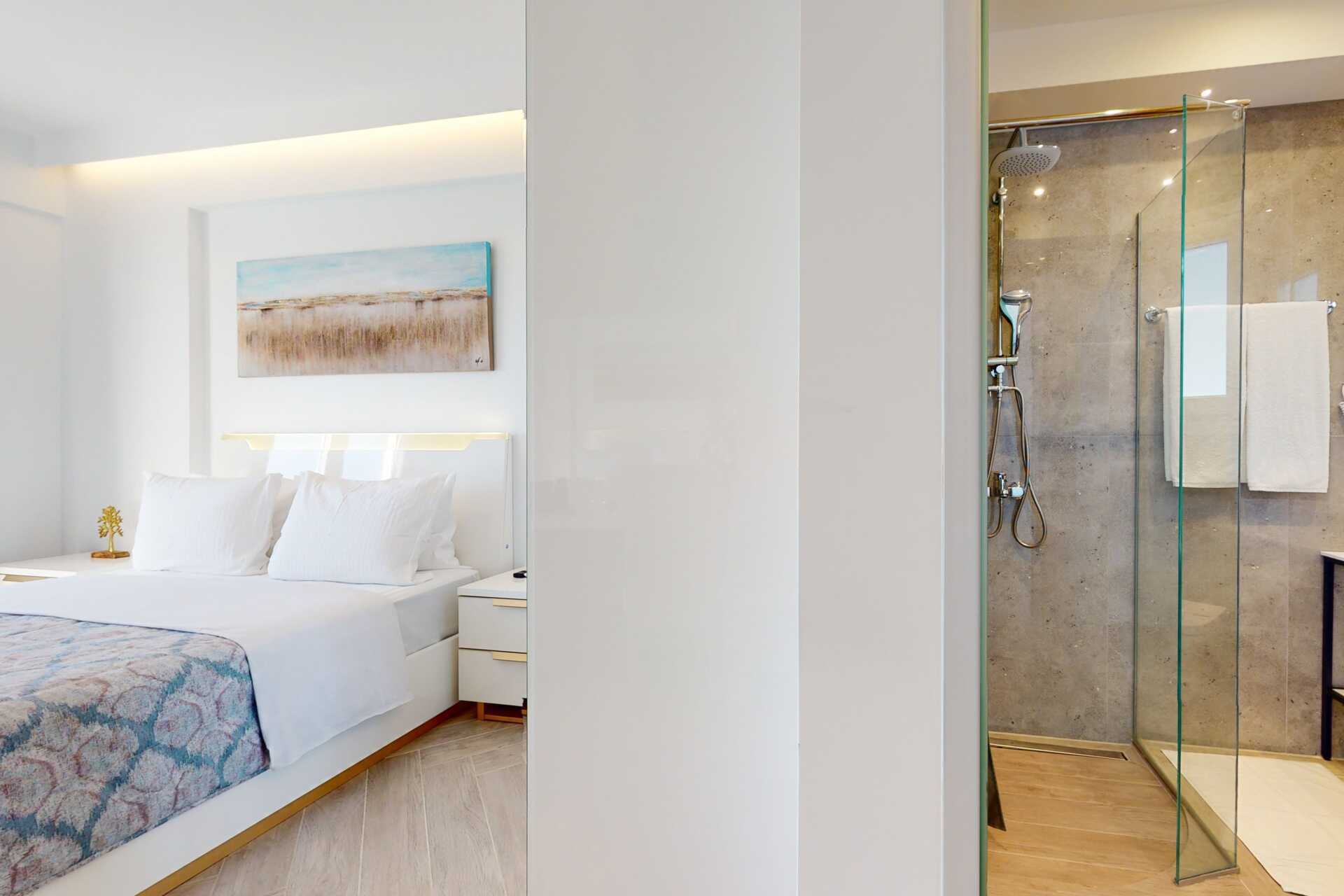 Kahden hengen huoneita, joissa on parveke merinäköalalla tai jaettu ulkotila ja rajoitetulla merinäköalalla. Parivuode. Wifi ja ilmastointi. Jääkaappi. Vedenkeitin. Tv satelliittikanavilla. Kylpyhuone, jossa suihku ja wc. Siivous 5 krt/viikko.