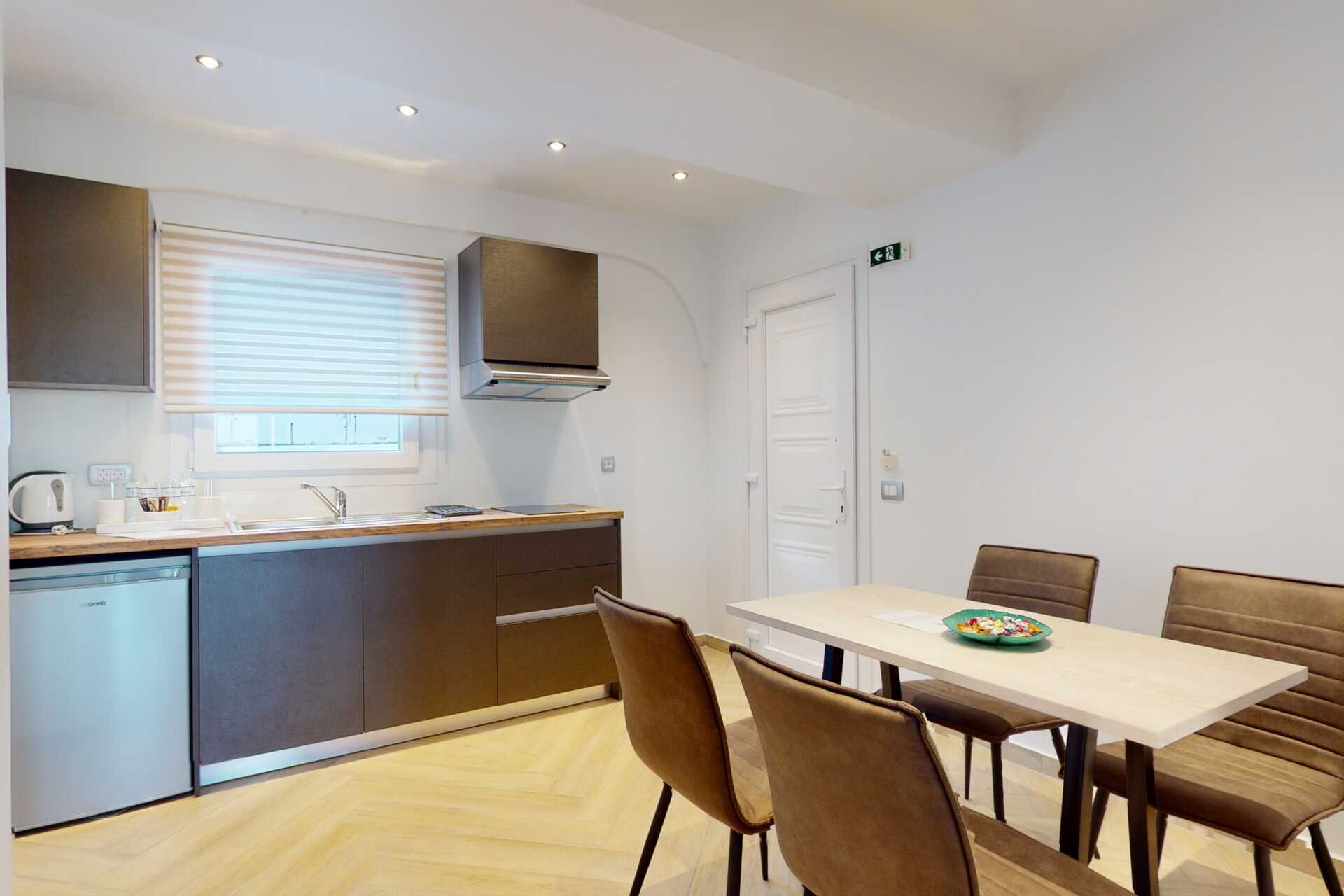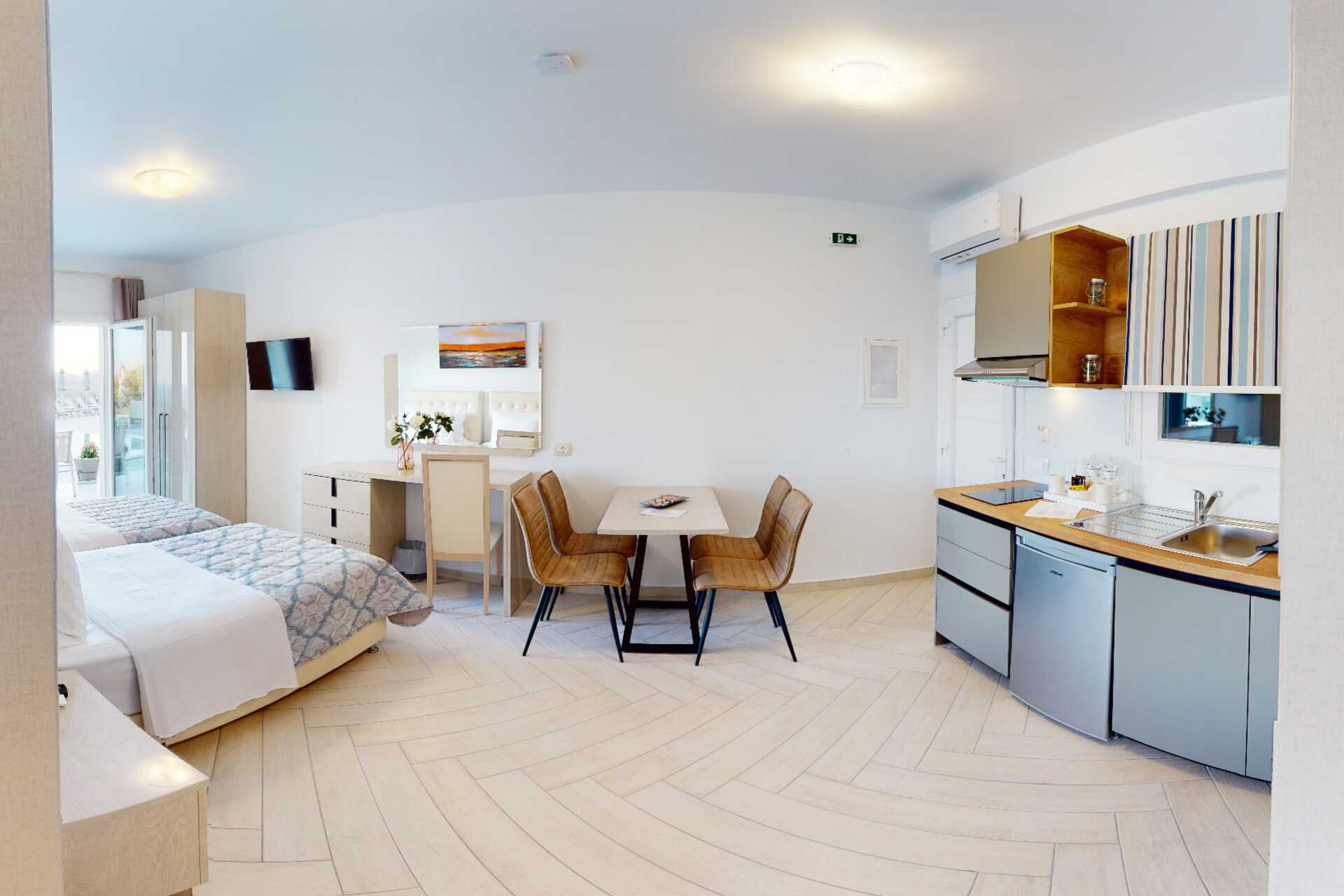 Perhehuoneessa on parveke ja merinäköala tai maaterassi ja rajoitetulla merinäköala. Perhehuoneessa on makuuhuone parivuoteella ja yhdistetty olohuone ja minikeittiö tai kaksi erillistä makuuhuonetta, joissa on kaksi erillistä sänkyä tai parivuode ja sitten erillinen keittiö. Lisävuodemahdollisuus kahdessa yhden hengen vuoteessa. Minikeittiössä keittolevyt, jääkaappi, vedenkeitin ja yksinkertainen keittiövarustus. Maksuton wifi, ilmastointi ja tallelokero. Tv kansainvälisillä kanavilla. Hiustenkuivain. Kylpyhuoneessa suihku ja wc. Siivous 5 krt/viikko.